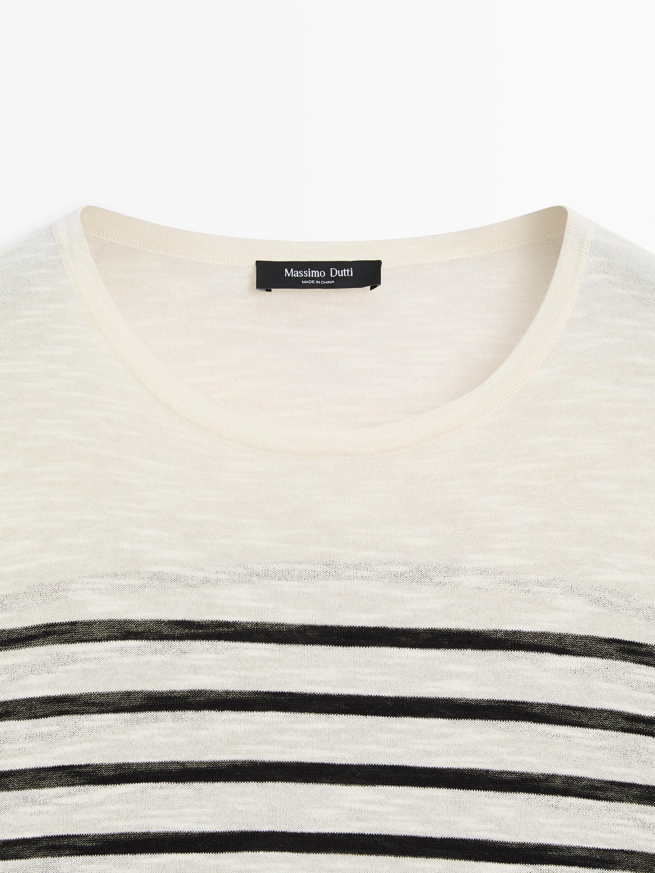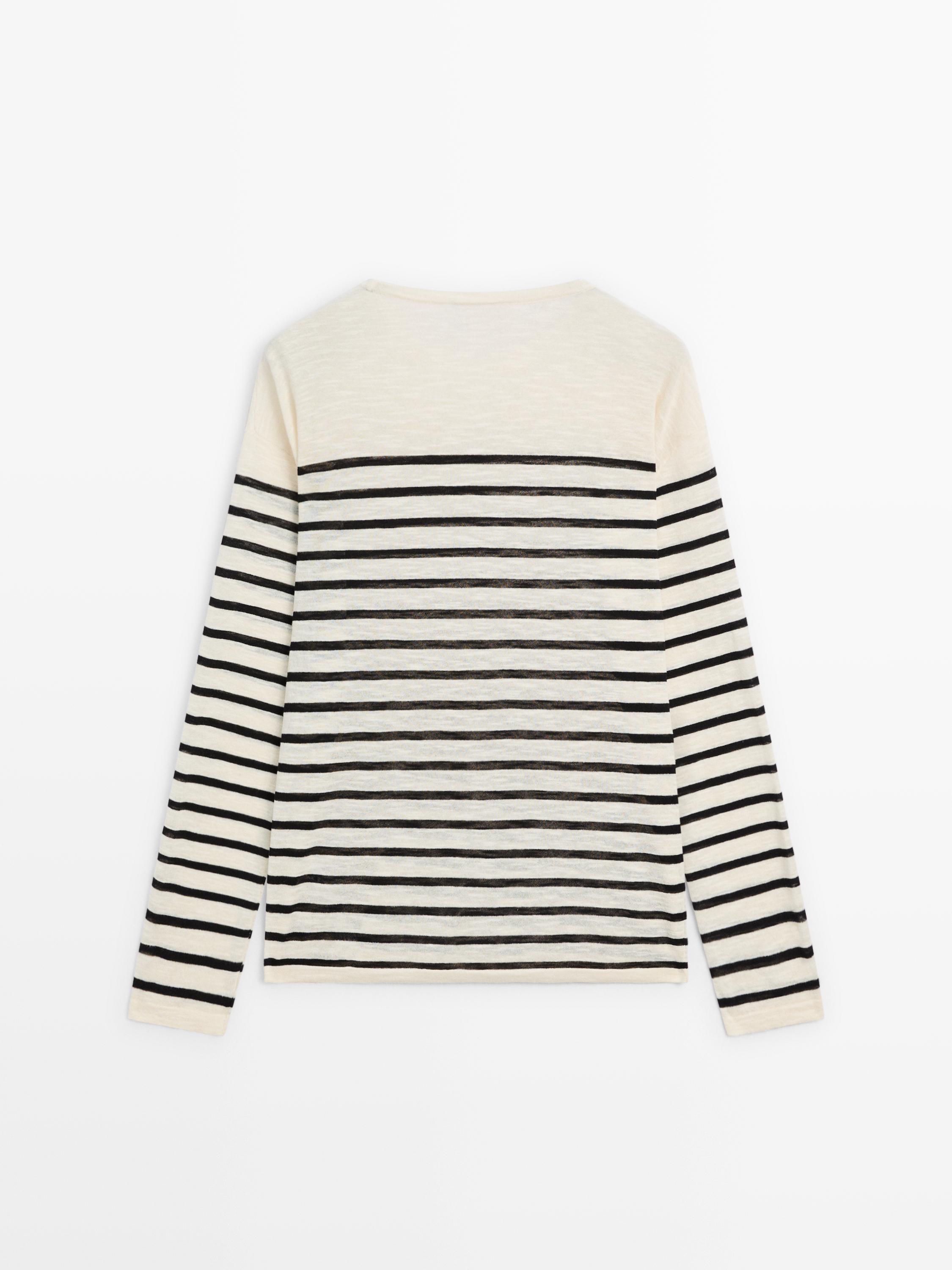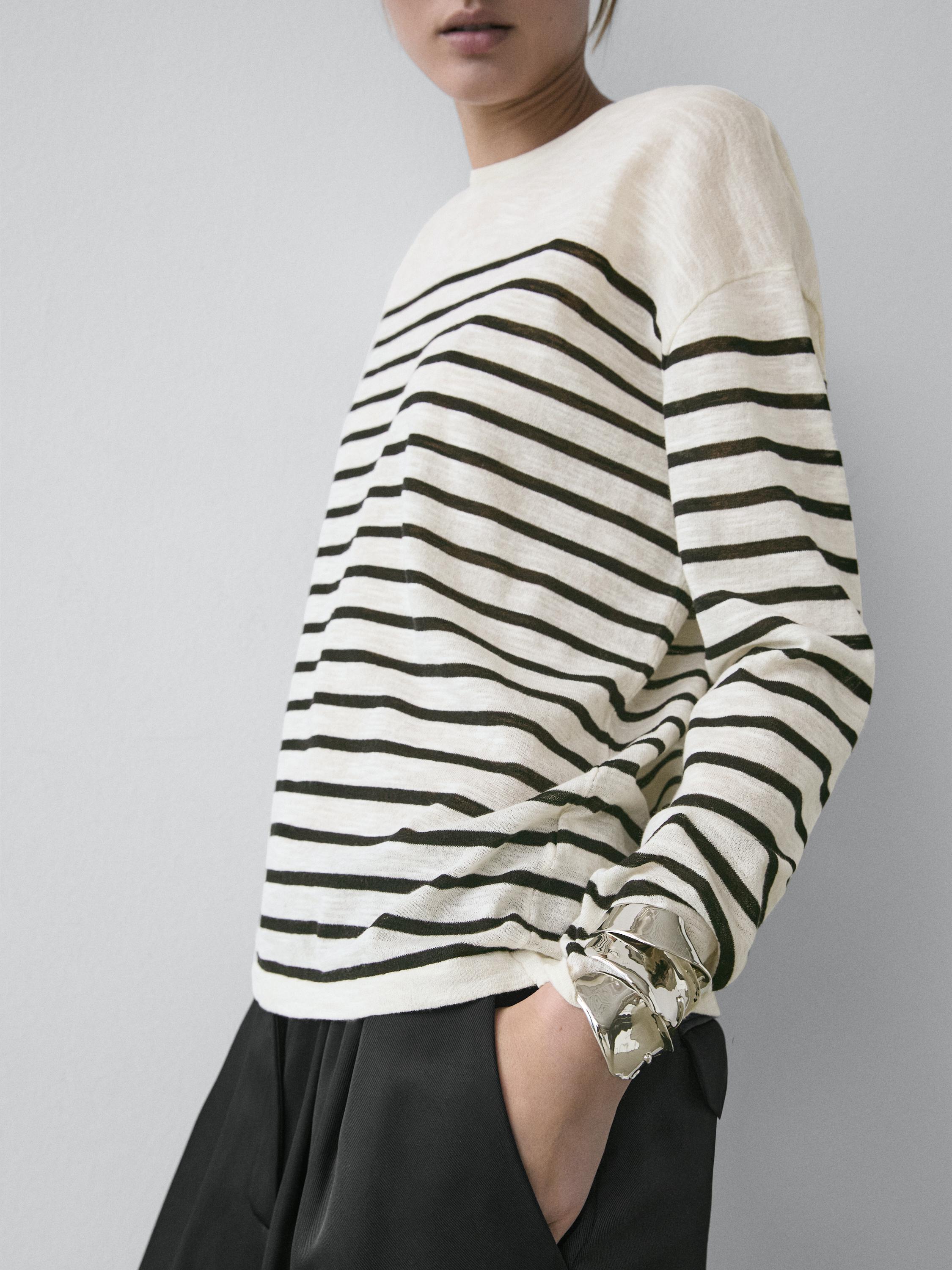 Massimo Dutti Футболка из смесового хлопка в полоску с длинными рукавами, натуральный/кремовый