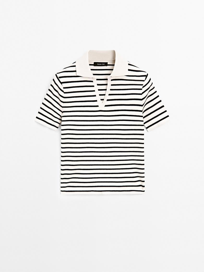 Massimo Dutti Футболка поло из смесового хлопка в полоску, натуральный, кремовый