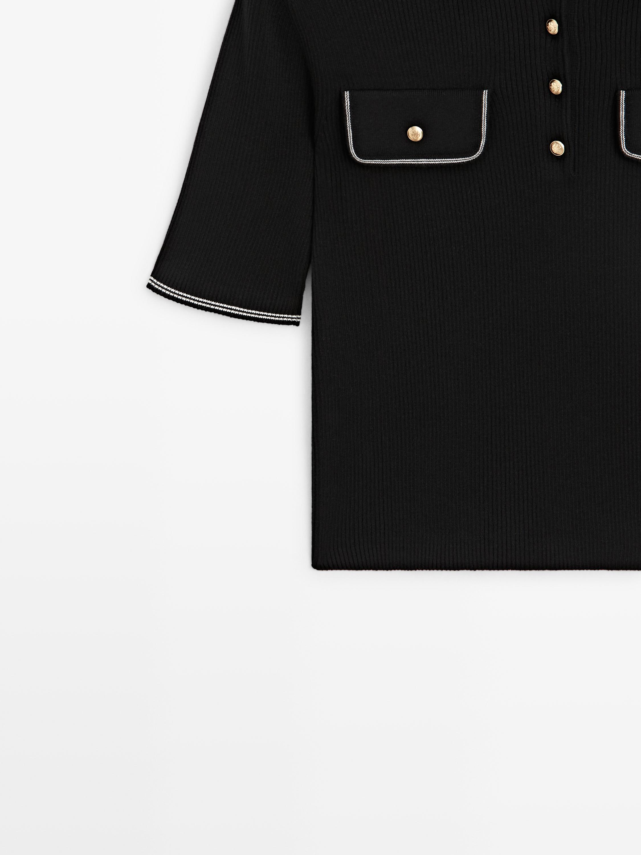 Рубашка поло из 100% хлопкового трикотажа. Короткие рукава. Элегантные золотистые пуговицы с кристаллами на горловине.. Два накладных нагрудных кармана на пуговицах. Контрастная окантовка.