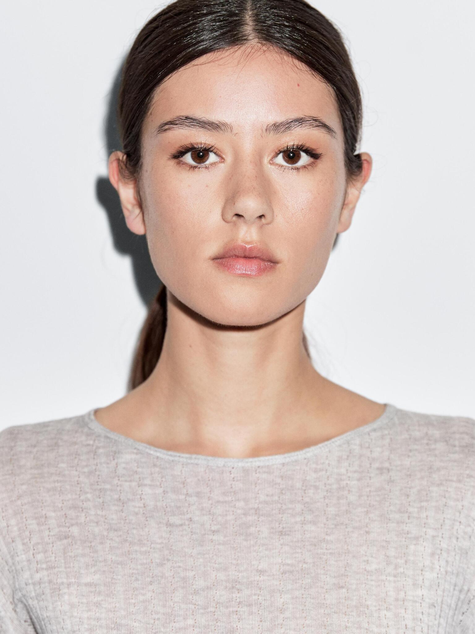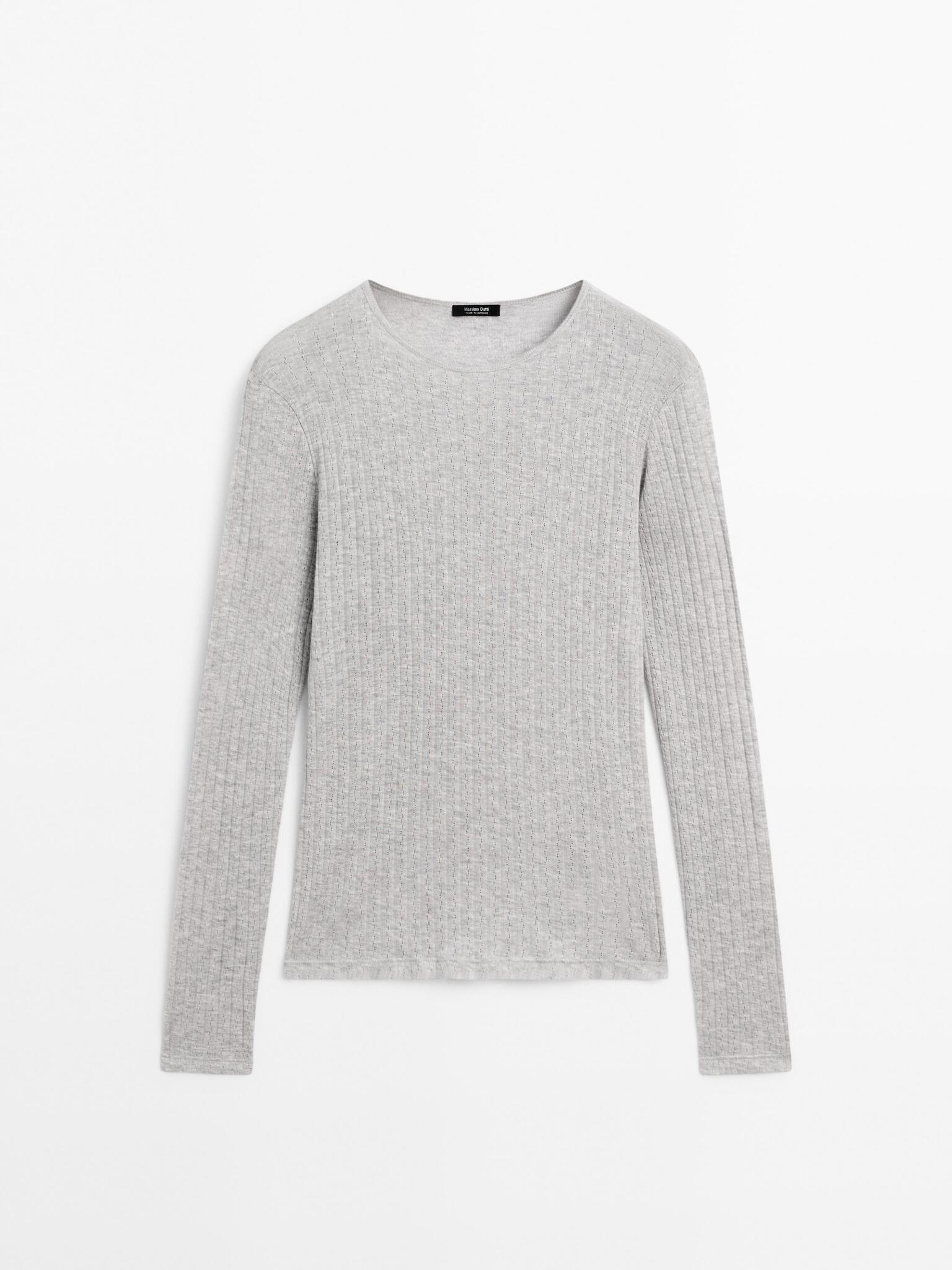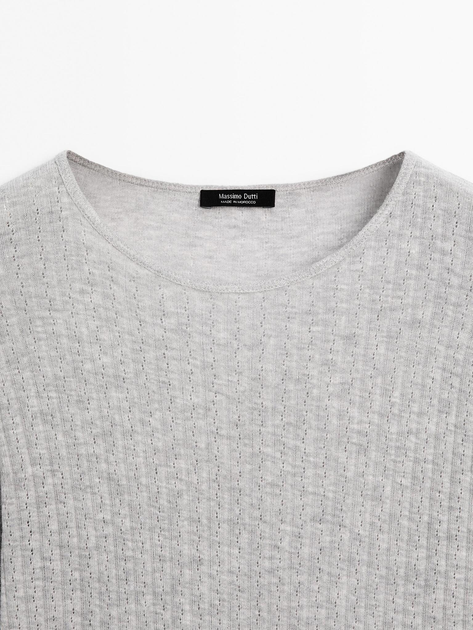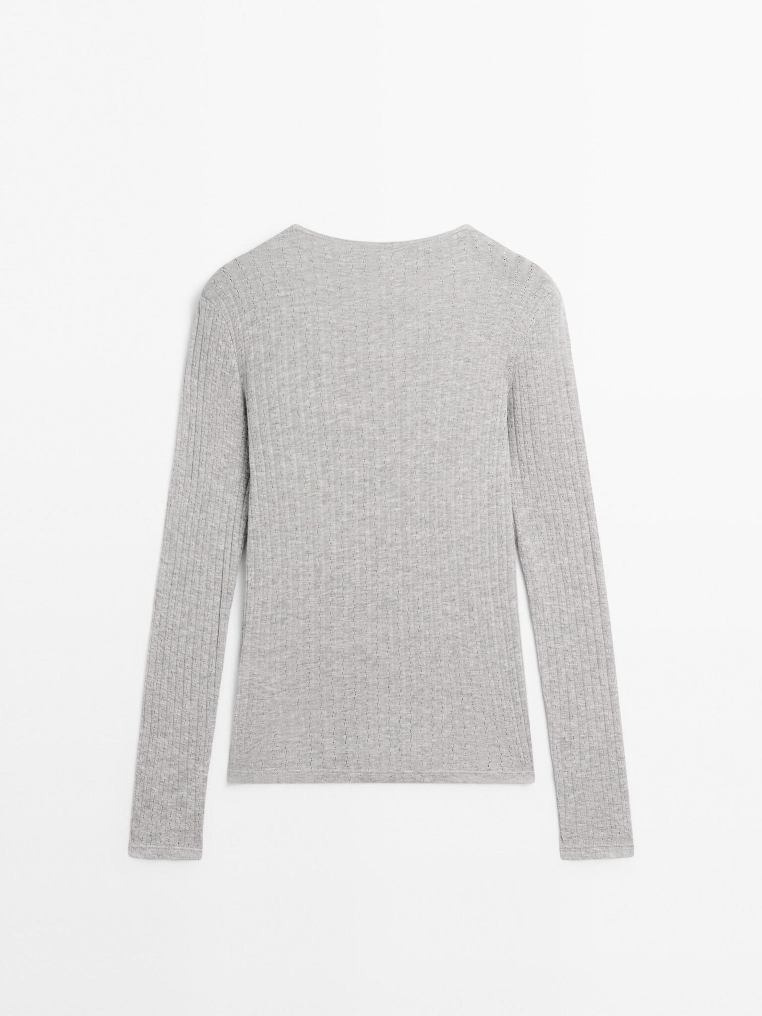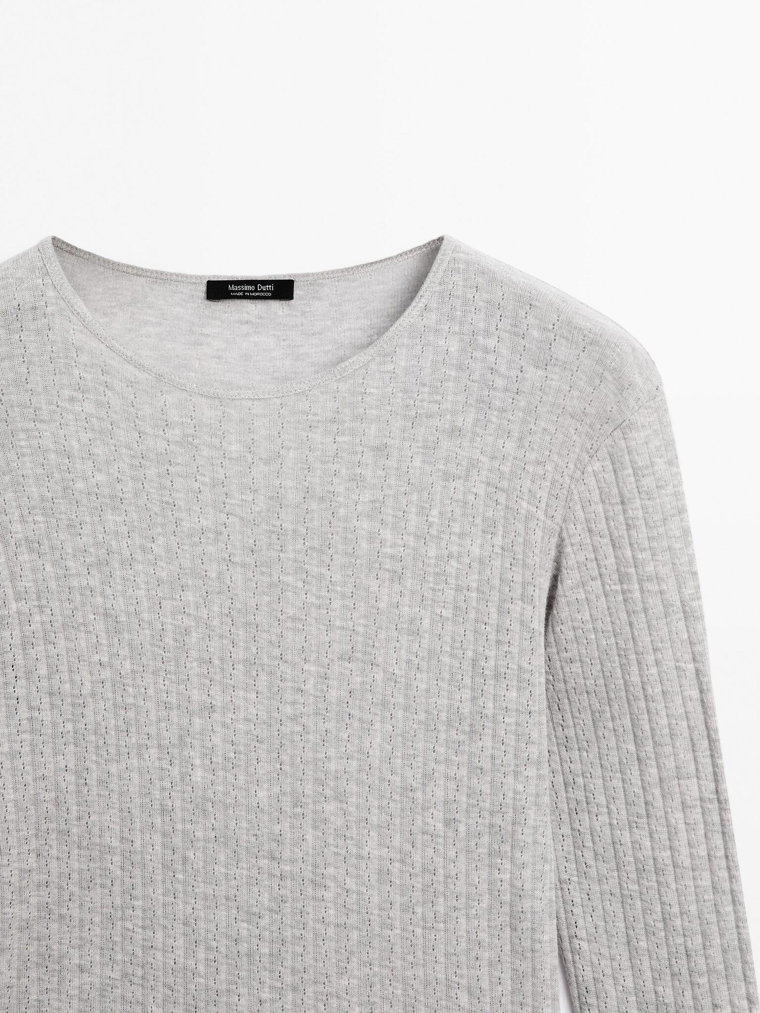 Футболка из тонкой, струящейся ткани. Круглый вырез горловины. Длинные рукава. Ажурная отделка на ткани.