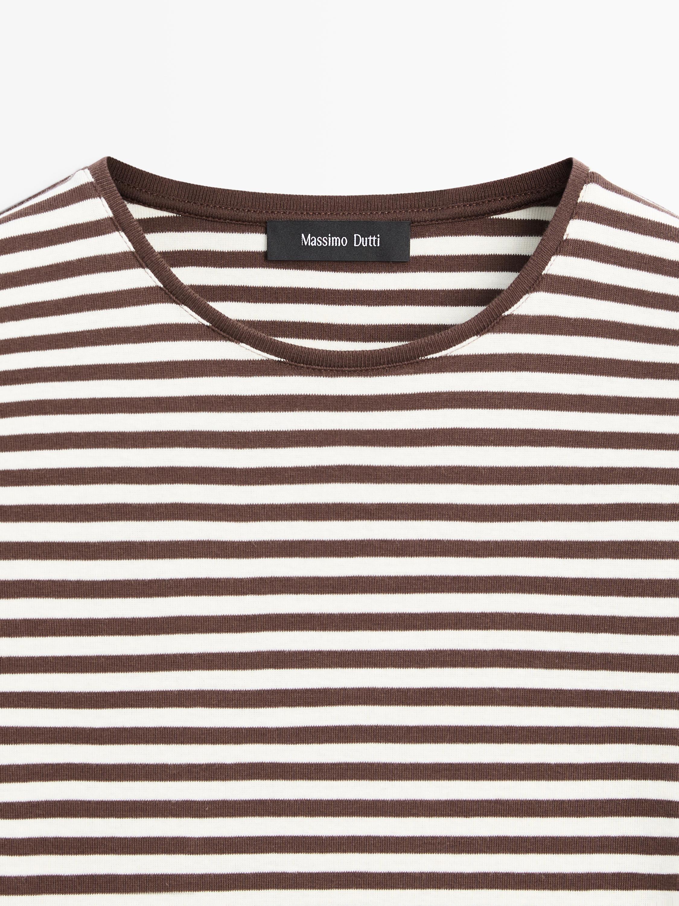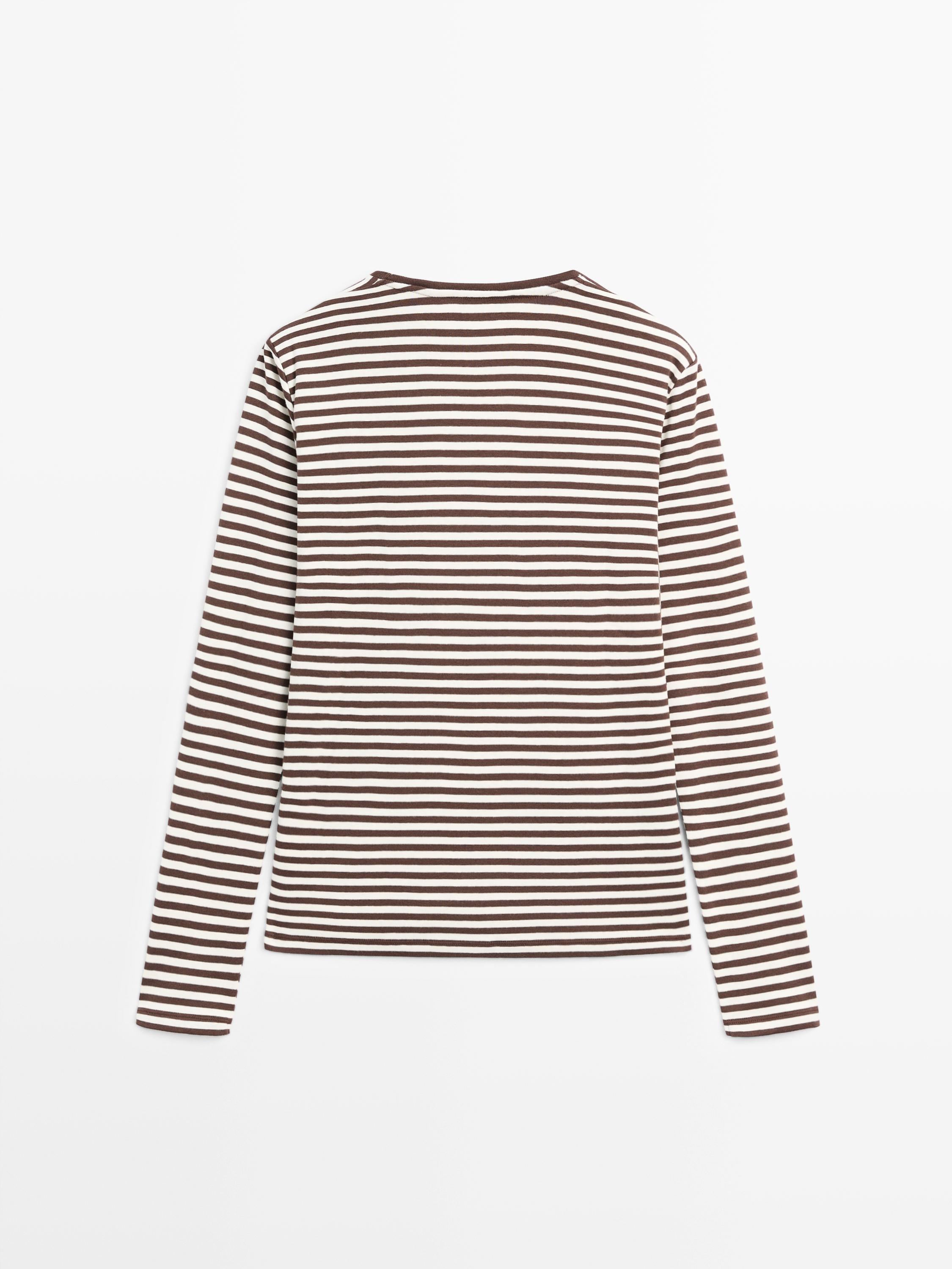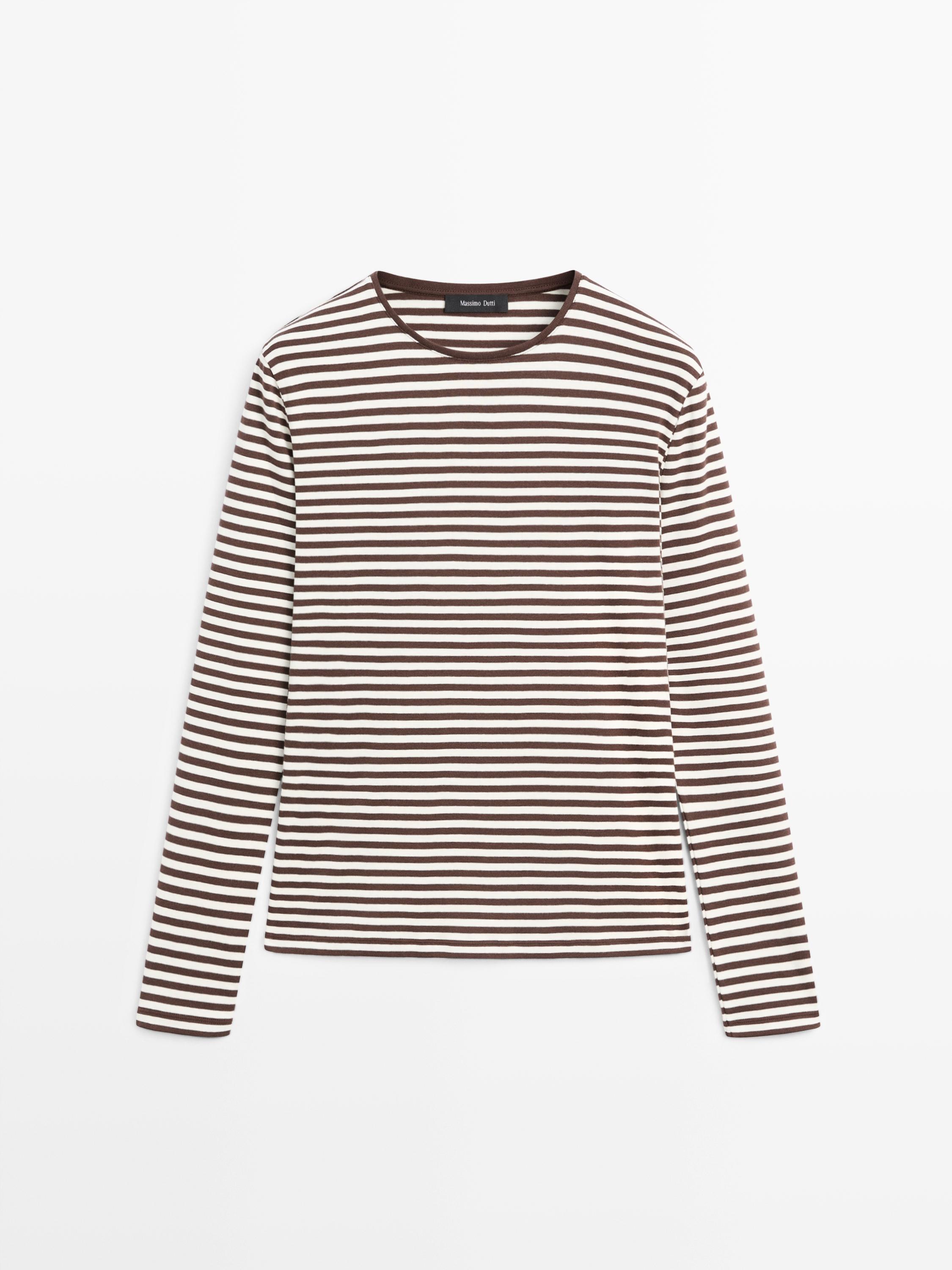 Massimo Dutti Футболка в полоску с длинными рукавами и контрастной отделкой, светло-коричневый