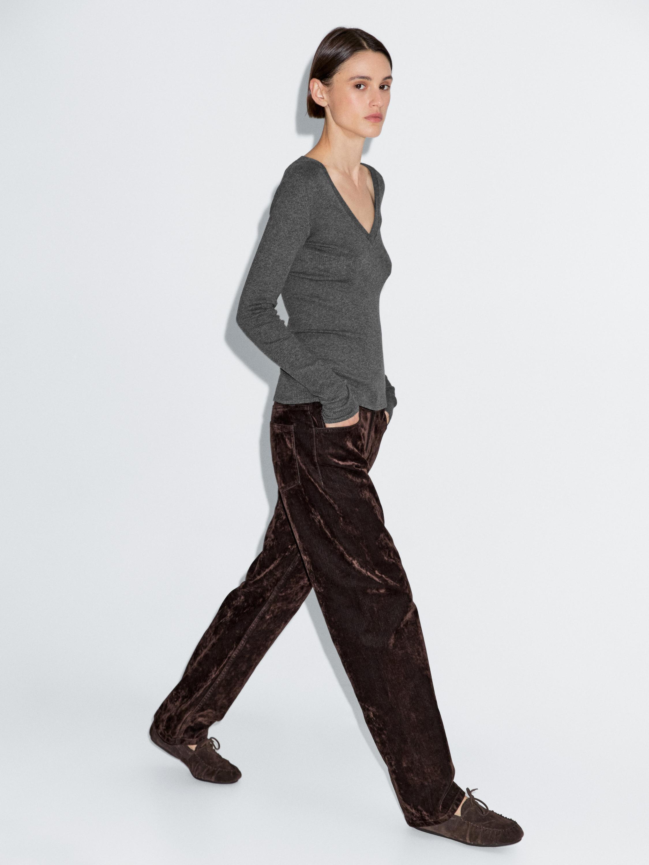 Футболка из смесового хлопка. Слегка зауженный крой, который задает более четкие контуры, делая фигуру визуально стройнее. V-образный вырез. Длинные рукава.