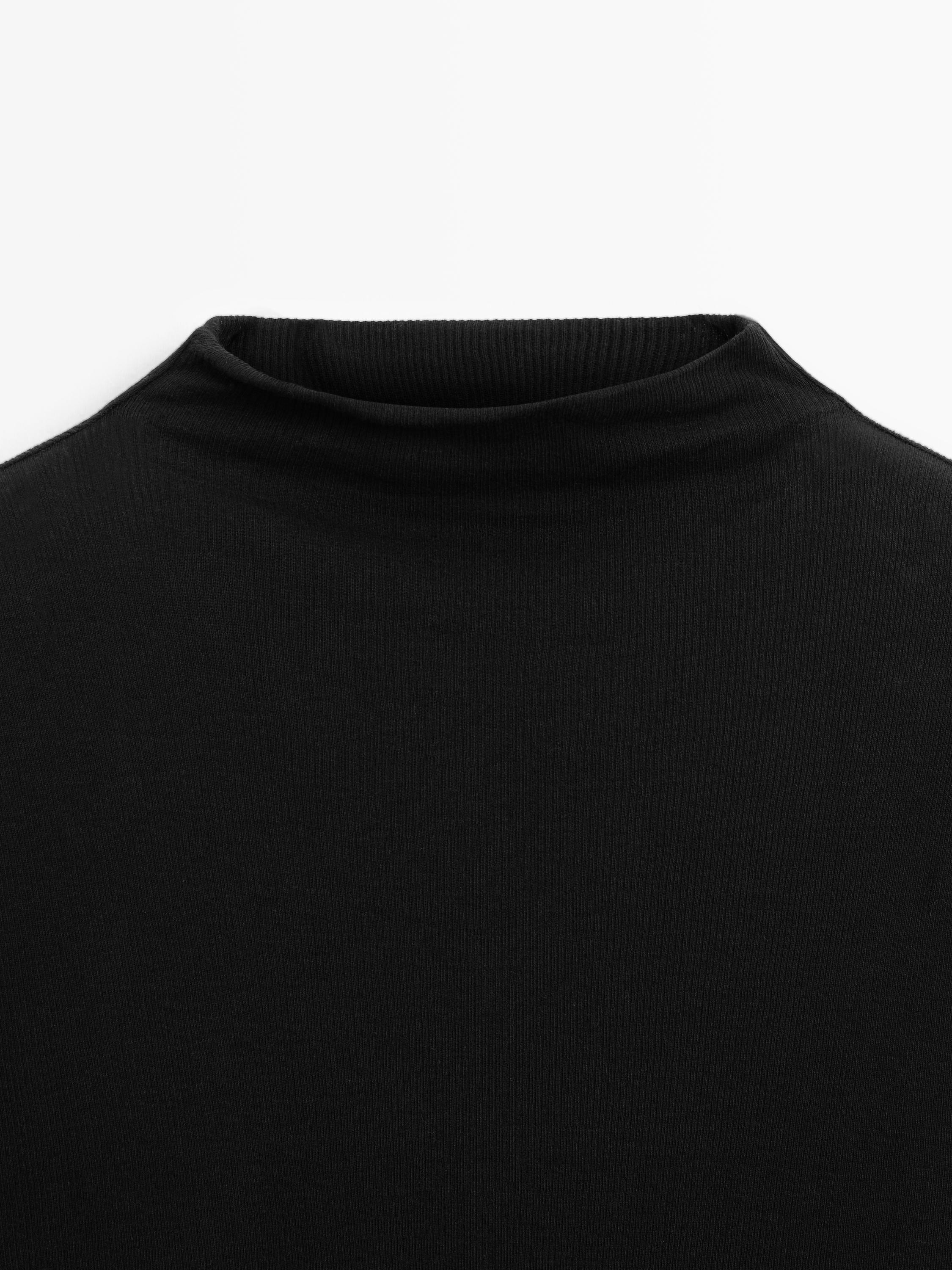 Футболка из 100% хлопка. Слегка зауженный крой, который задает более четкие контуры, делая фигуру визуально стройнее. Длинные рукава. Высокий воротник. Ткань в рубчик .