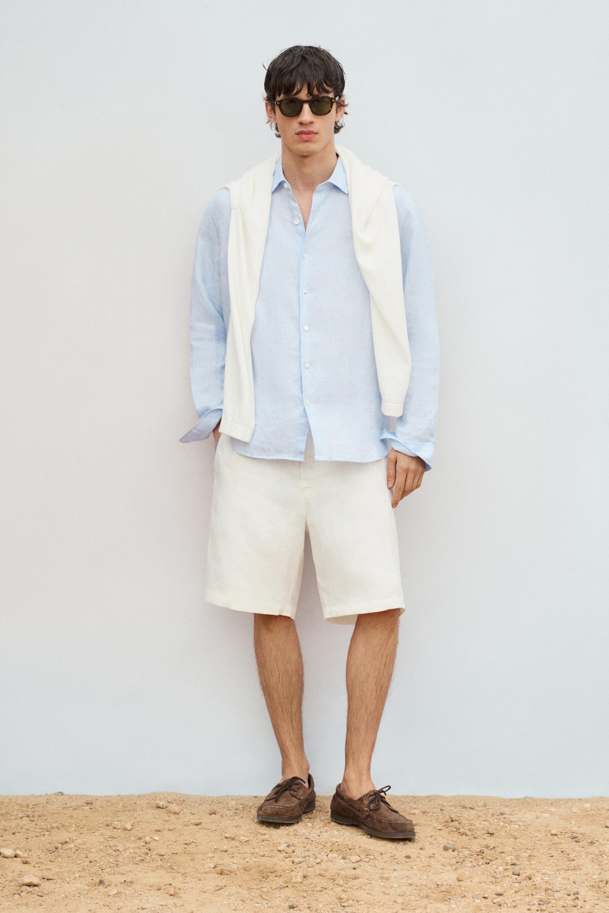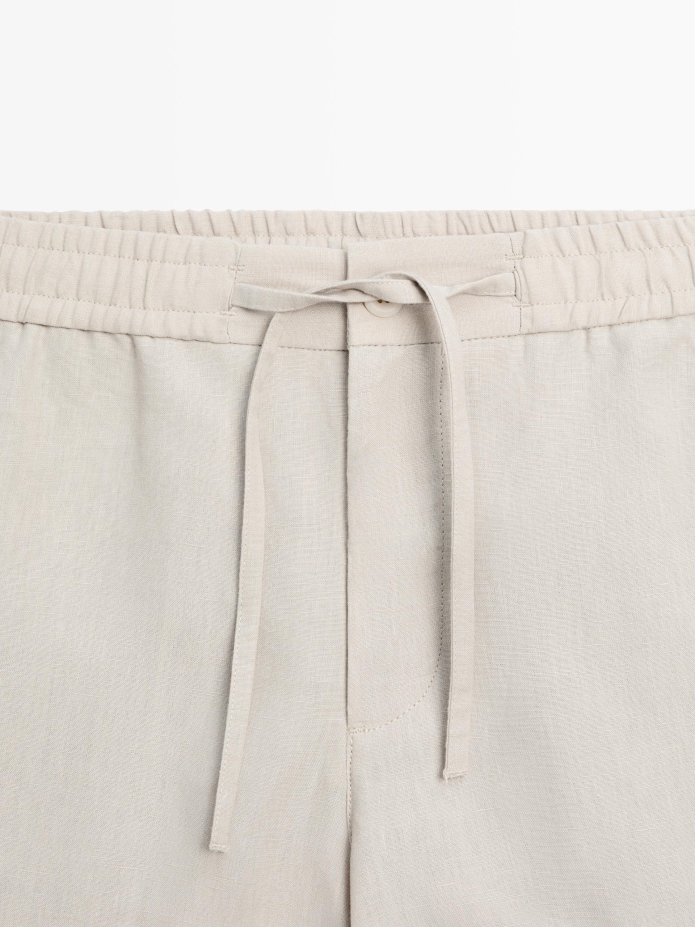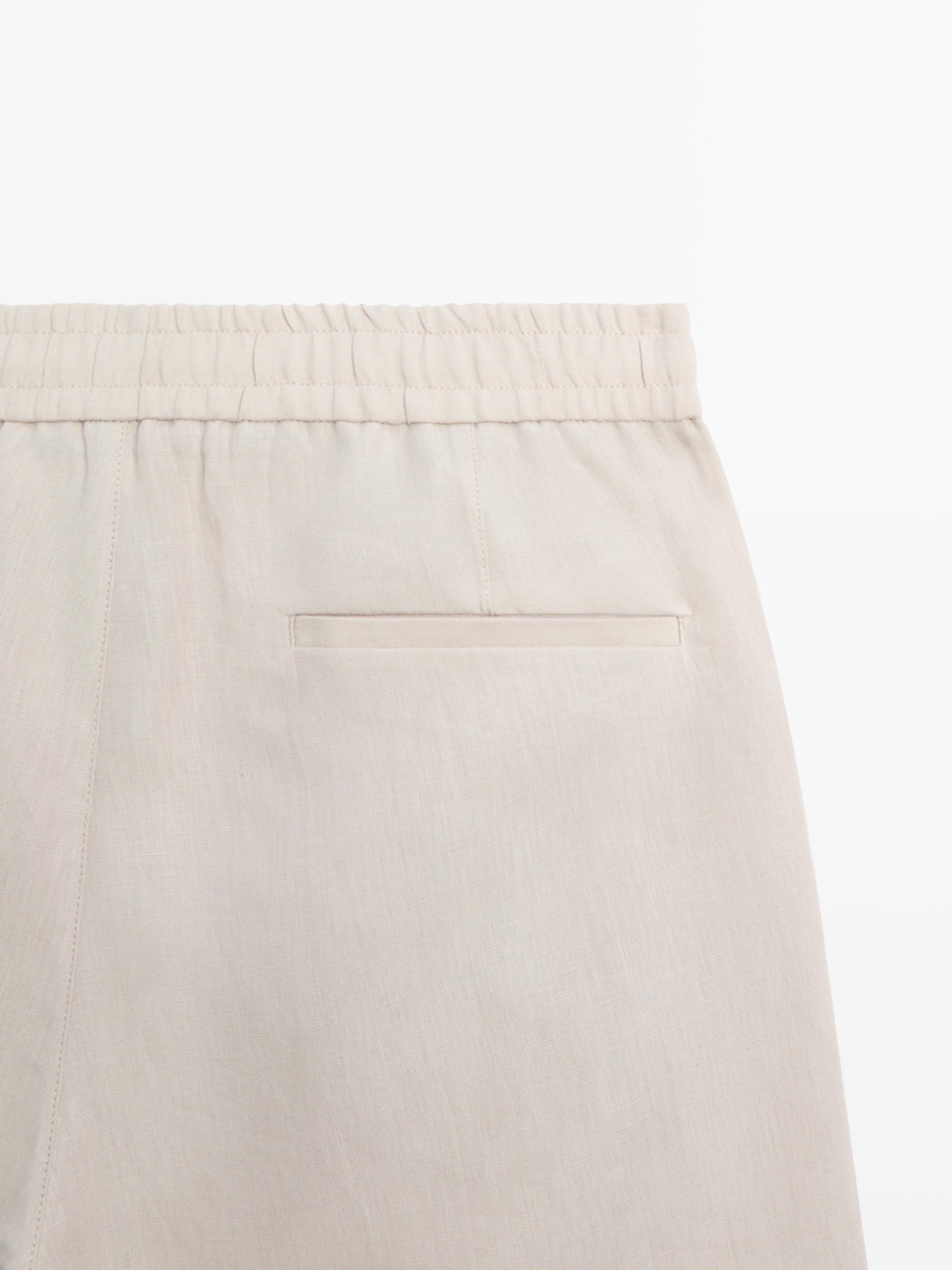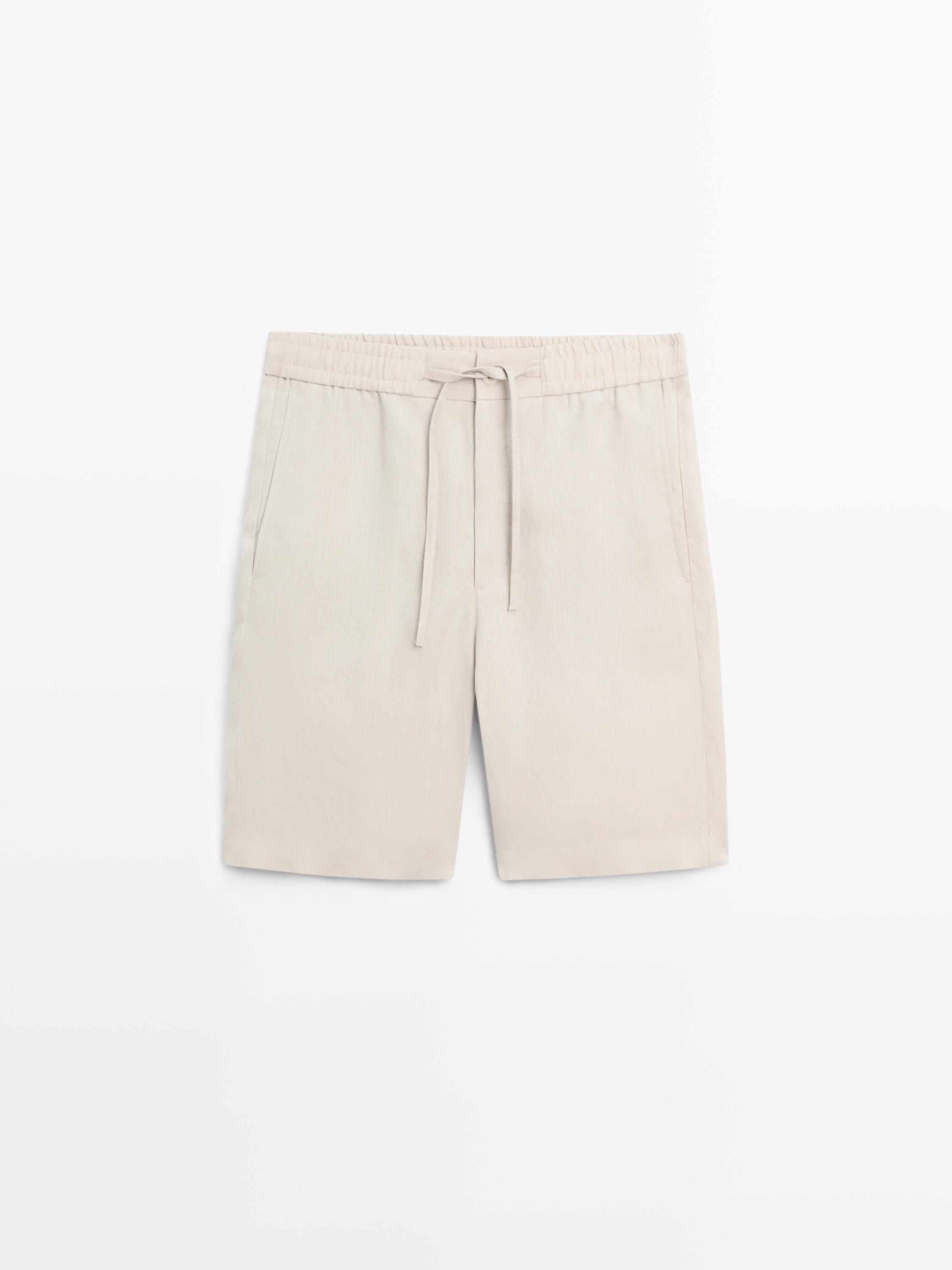 Бермуды из 100% льна. Застежка на молнию и потайную пуговицу. Эластичный пояс. Два боковых кармана.