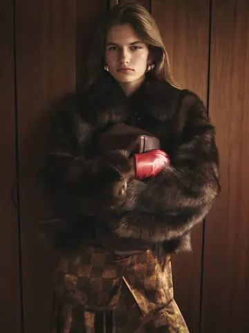 Короткое пальто из 100% кожи с мехом. Рубашечный воротник. Длинные рукава. Застежка на пуговицы спереди. Два боковых кармана.