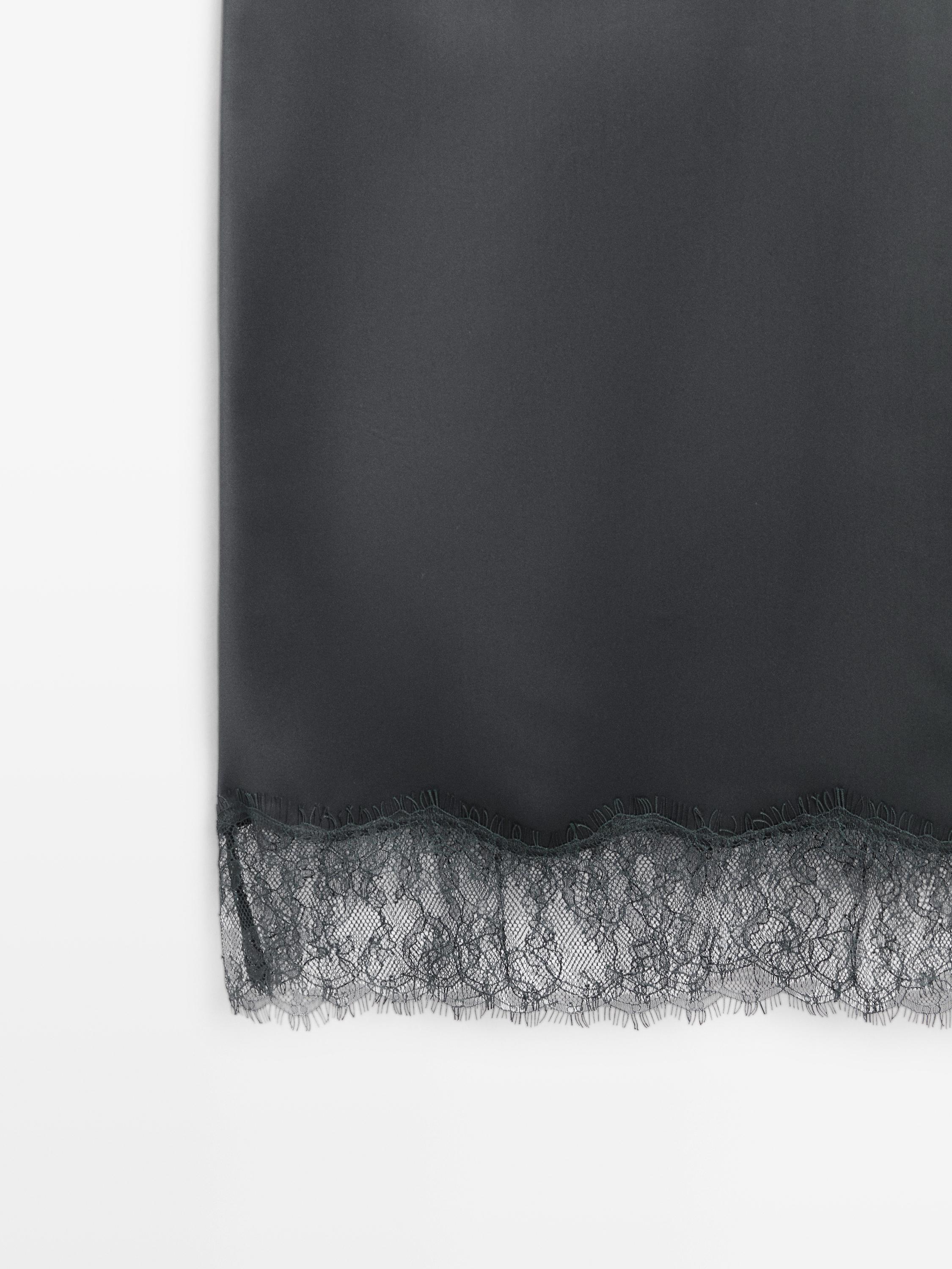 Короткое струящееся атласное платье. Круглые вырезы спереди и сзади. Широкие бретели. Застежка на молнию сбоку. Кружевная отделка по нижнему краю .