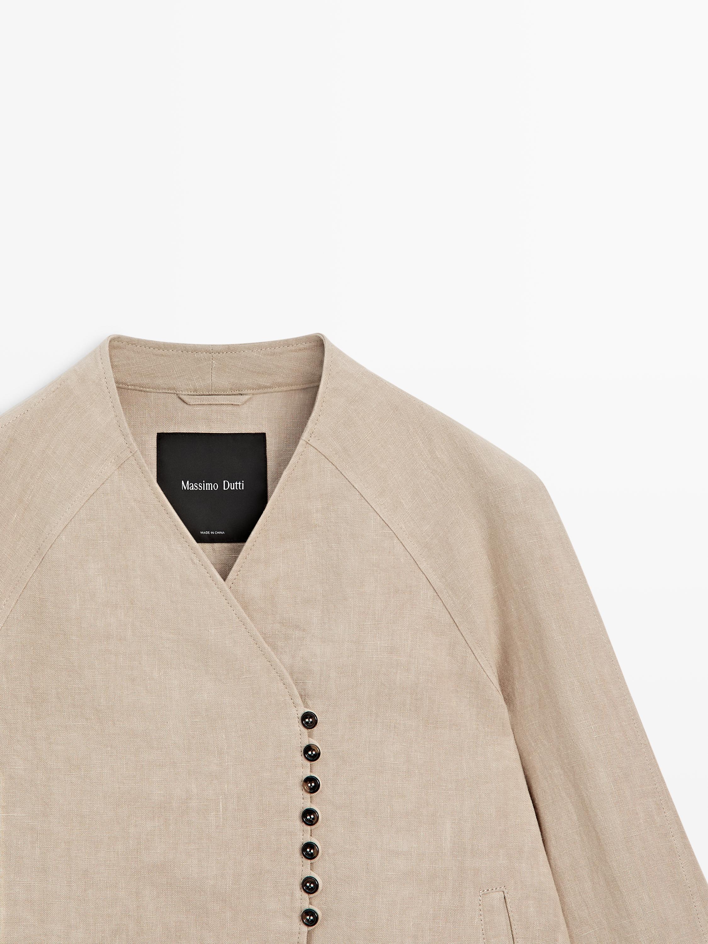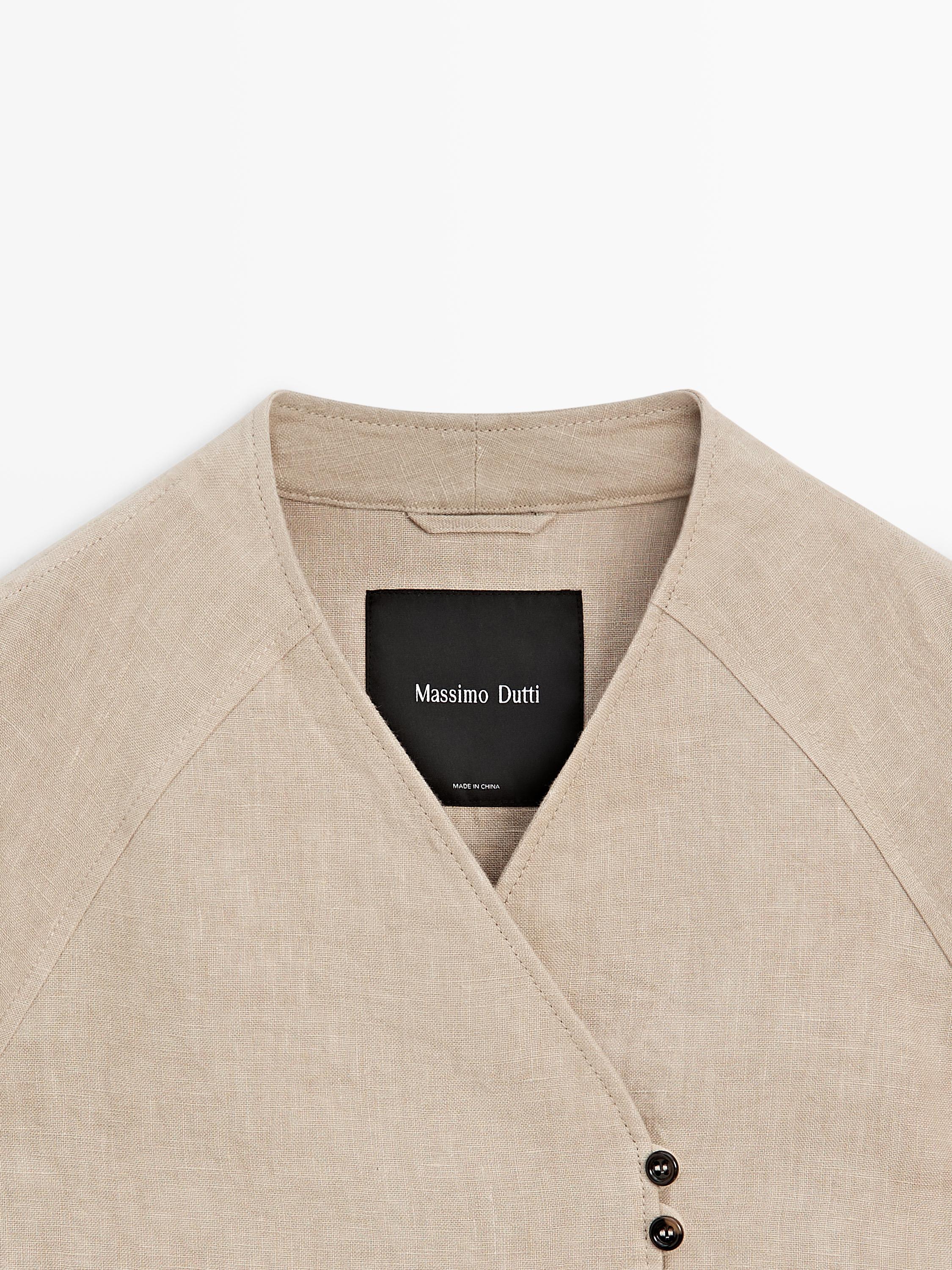 Куртка из 100% льна. V-образный вырез. Длинные рукава с пуговицами . Застежка на пуговицу сбоку. Два боковых кармана.