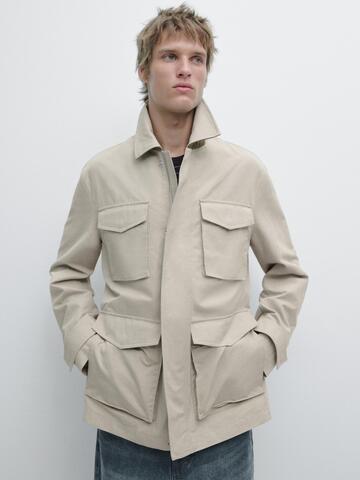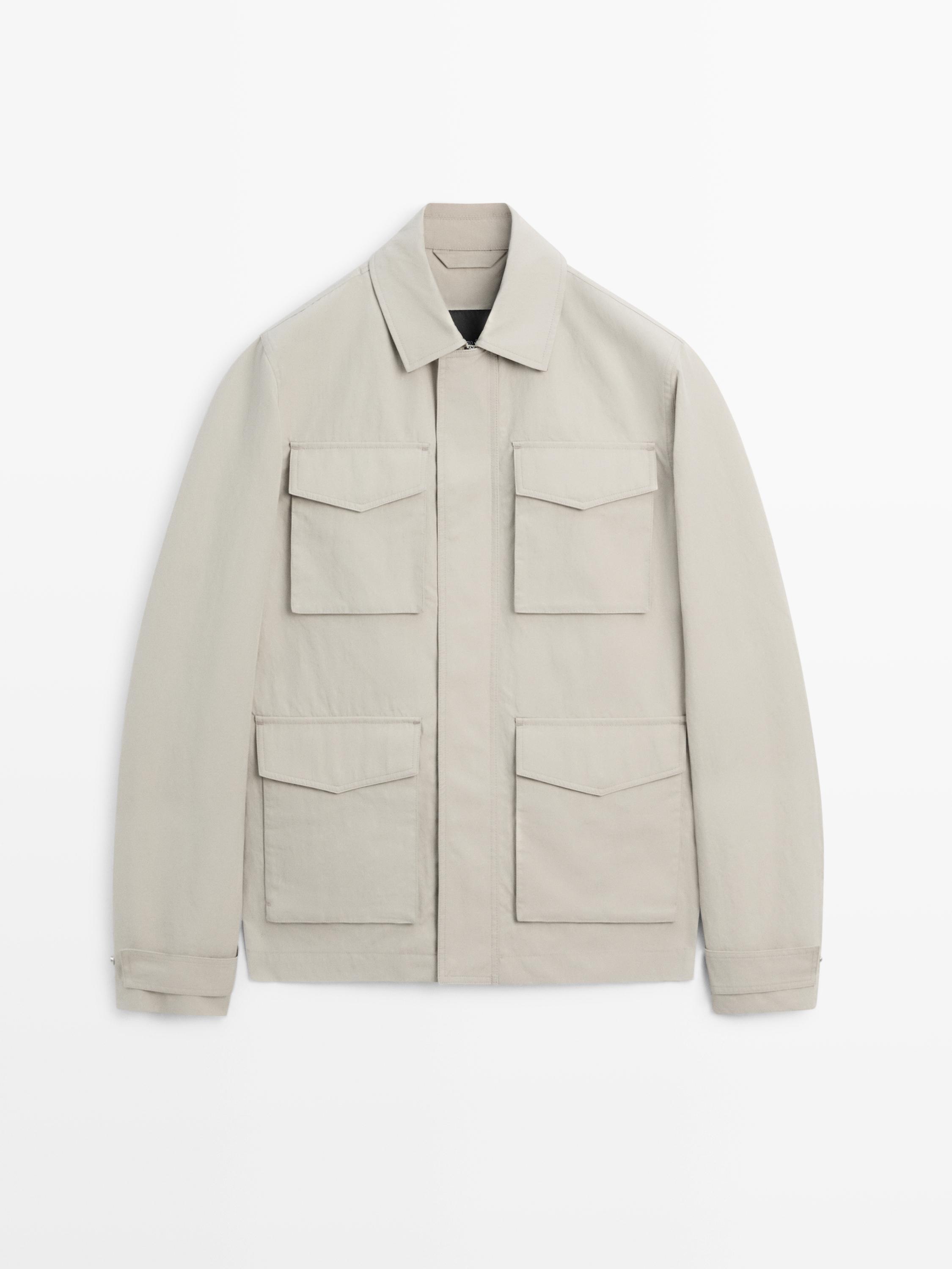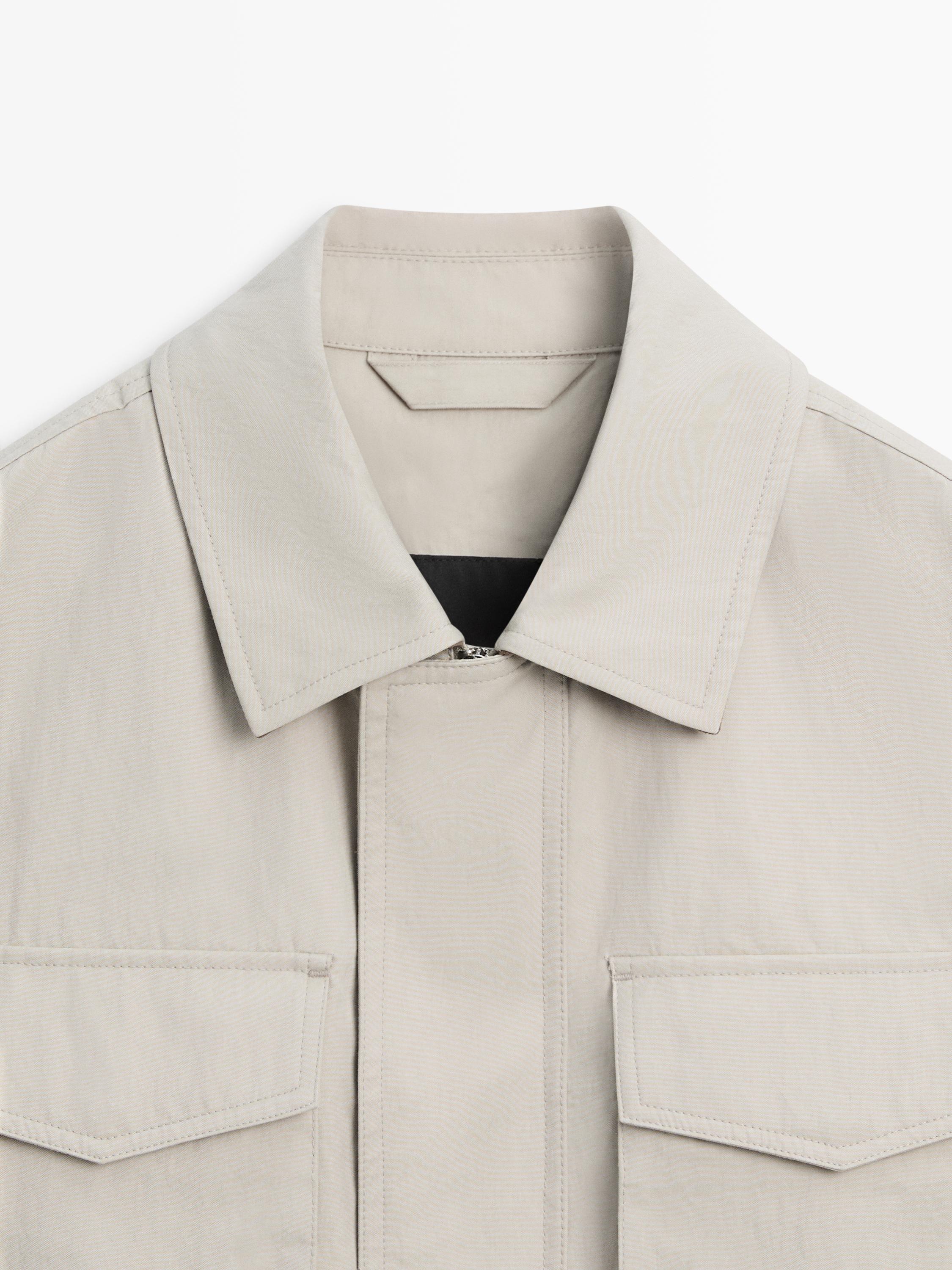 Куртка из смесового хлопка. Длинные рукава с пуговицами . Застежка-молния под планкой, пуговица и ремешок с крючком и петлей. Высокий воротник. Четыре накладных кармана с клапанами.
