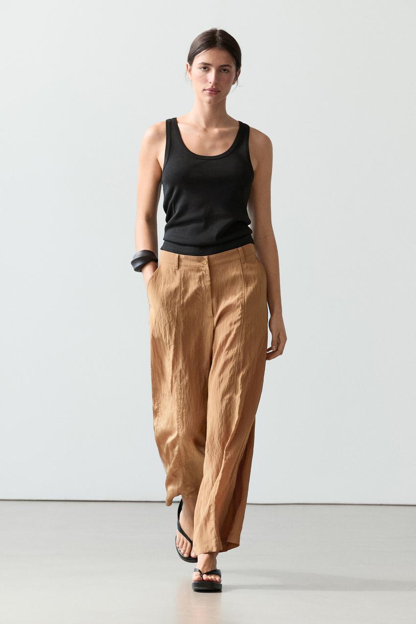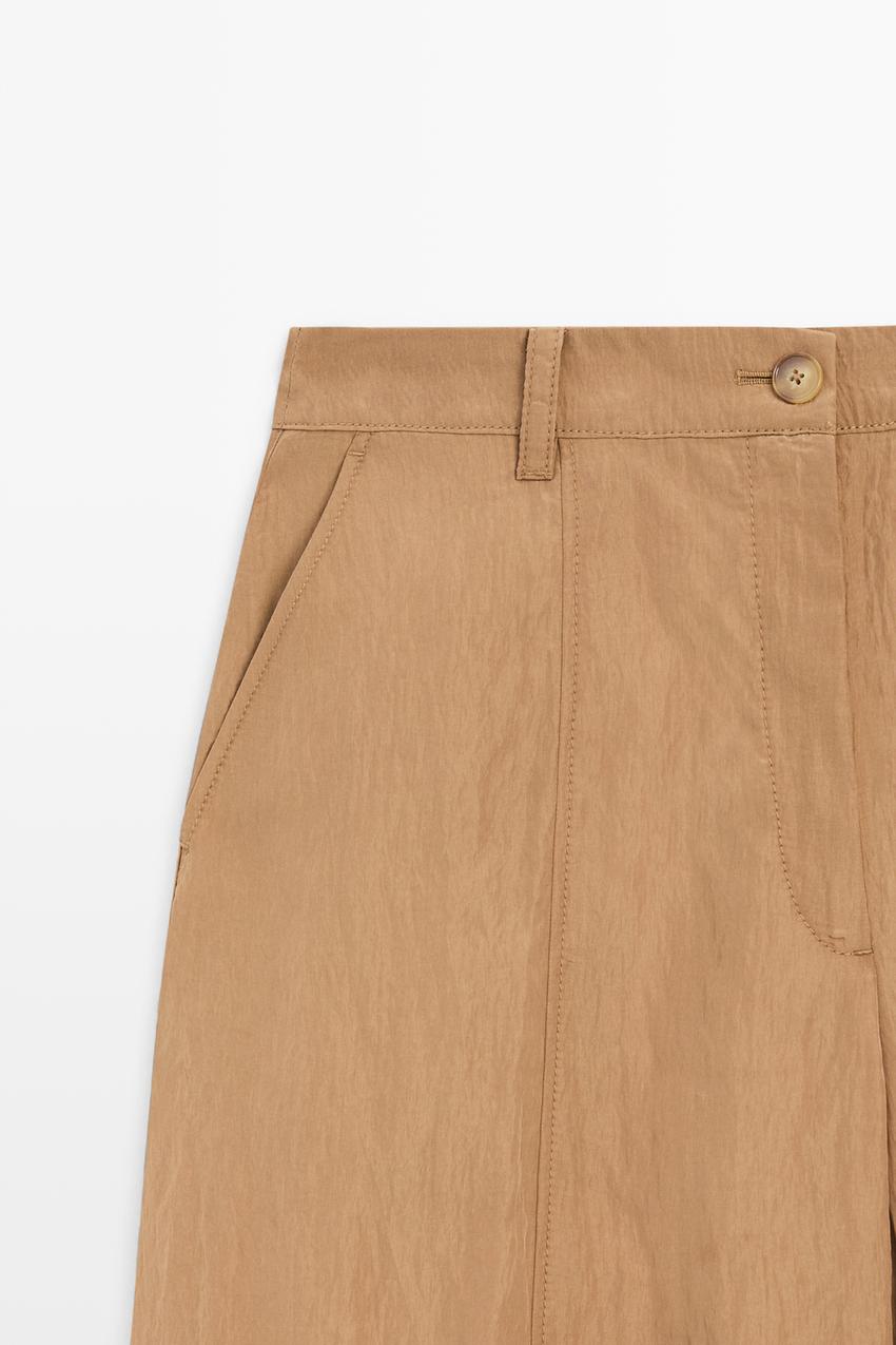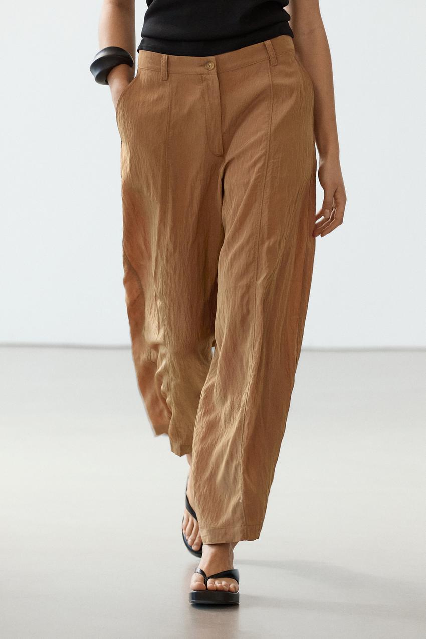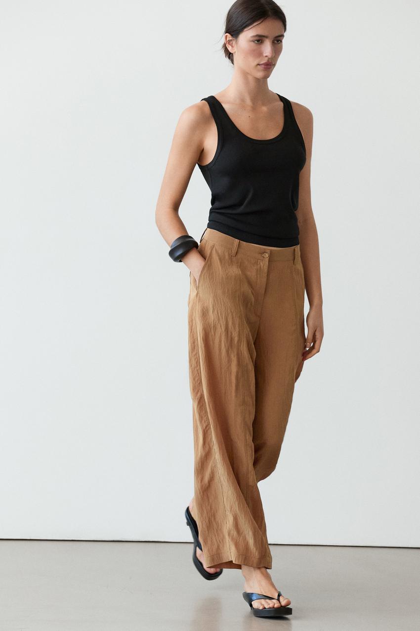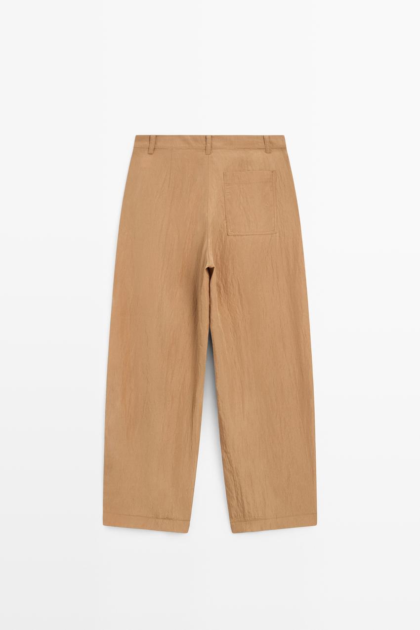 Брюки прямого кроя: этот крой отличается более широкой формой в бедрах и более узкими штанинами к щиколотке, представляя собой нечто среднее между облегающим и стандартным кроем. Детали: петли для ремня. Застежка на молнию и пуговицу сверху. Два боковых кармана. Один накладной карман сзади. Тонкая, легкая ткань.