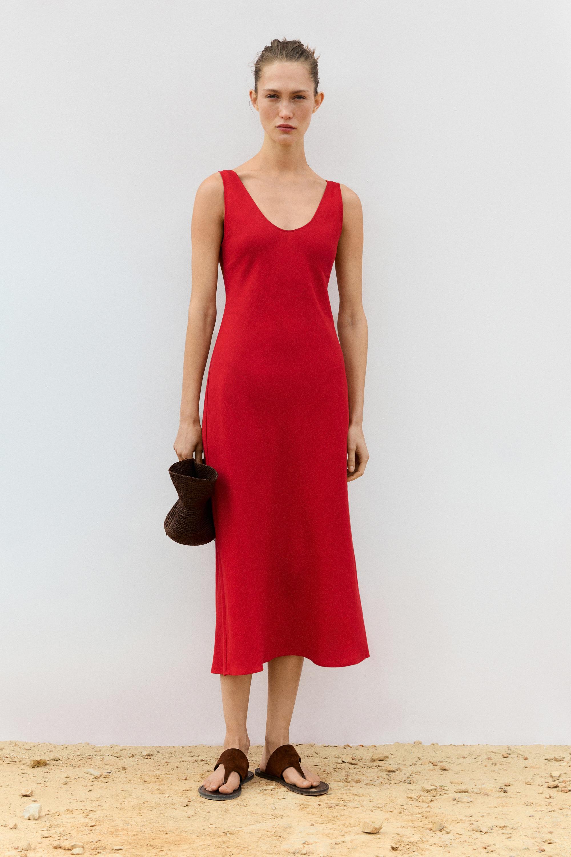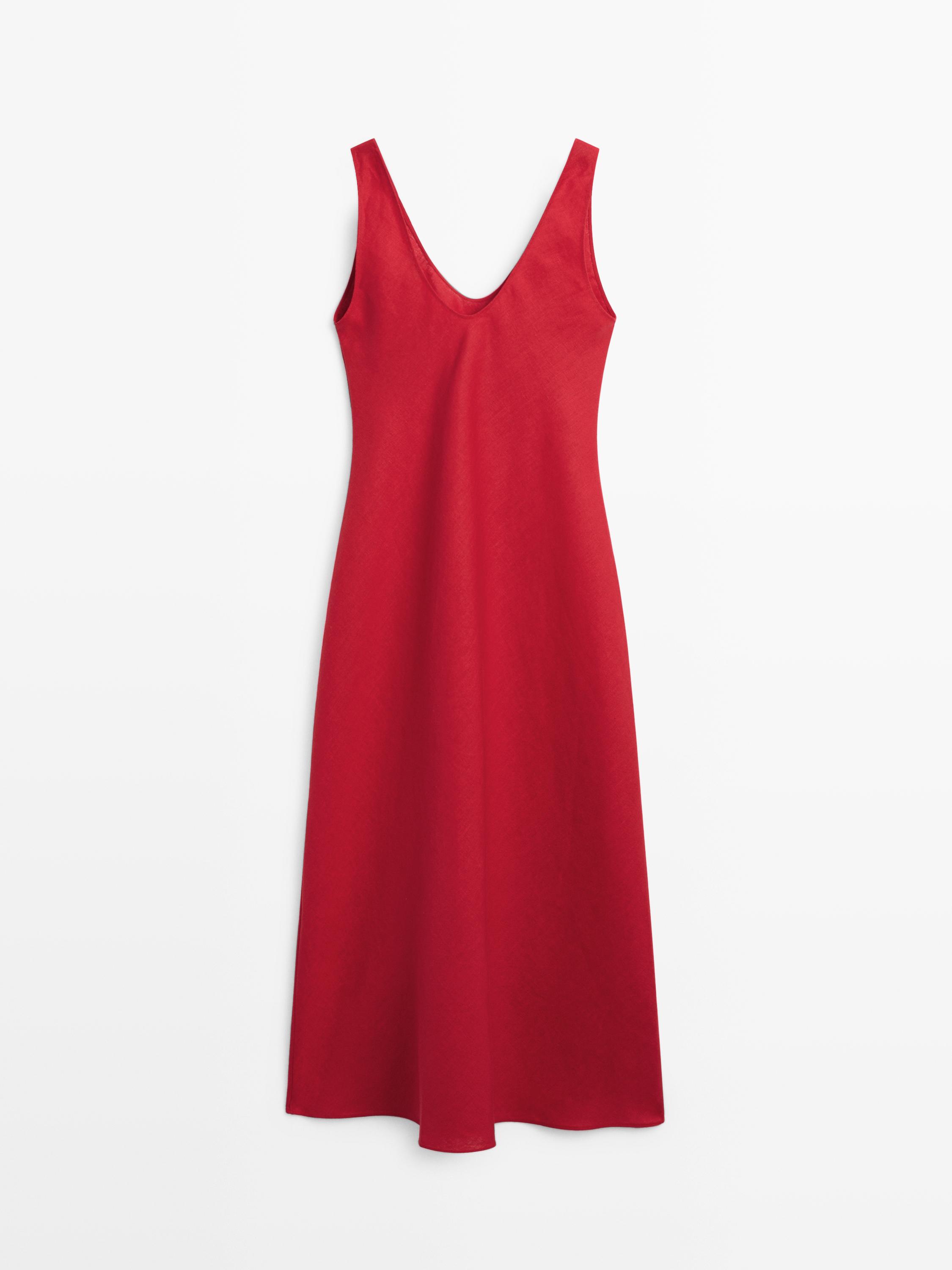 Massimo Dutti Льняное платье миди на бретелях, красный