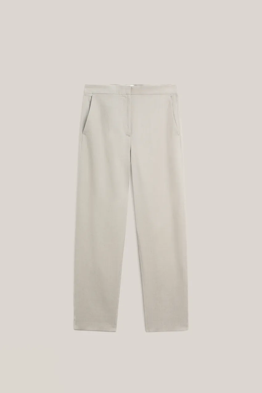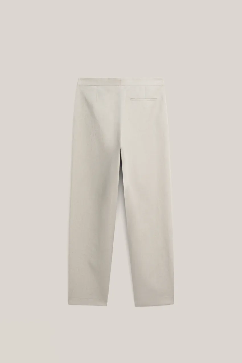 Брюки из льна. Застежка на молнию спереди и потайную пуговицу. Два боковых кармана. Один прорезной карман сзади. Эта вещь является частью костюма.