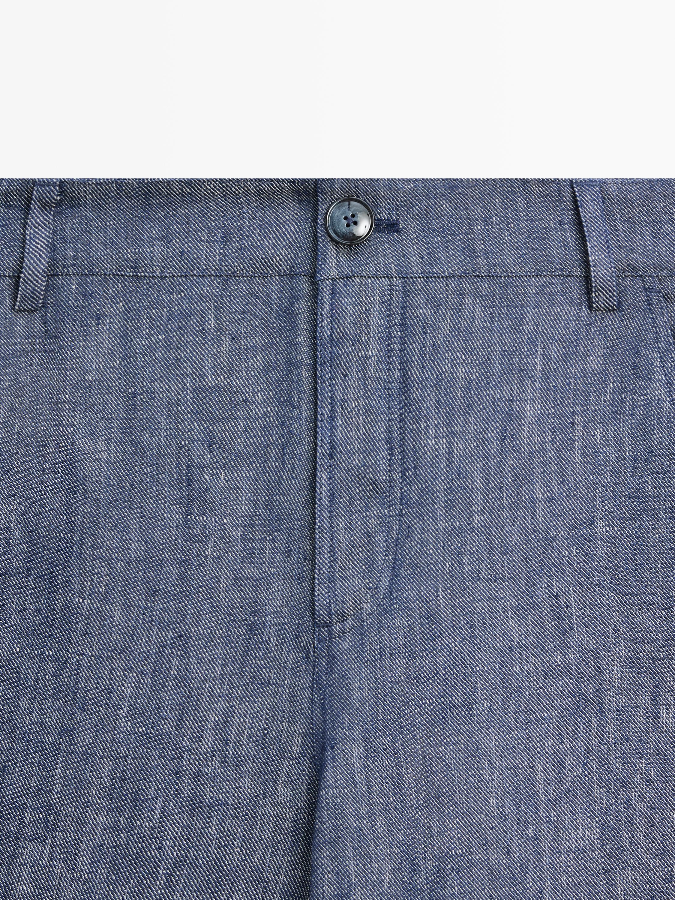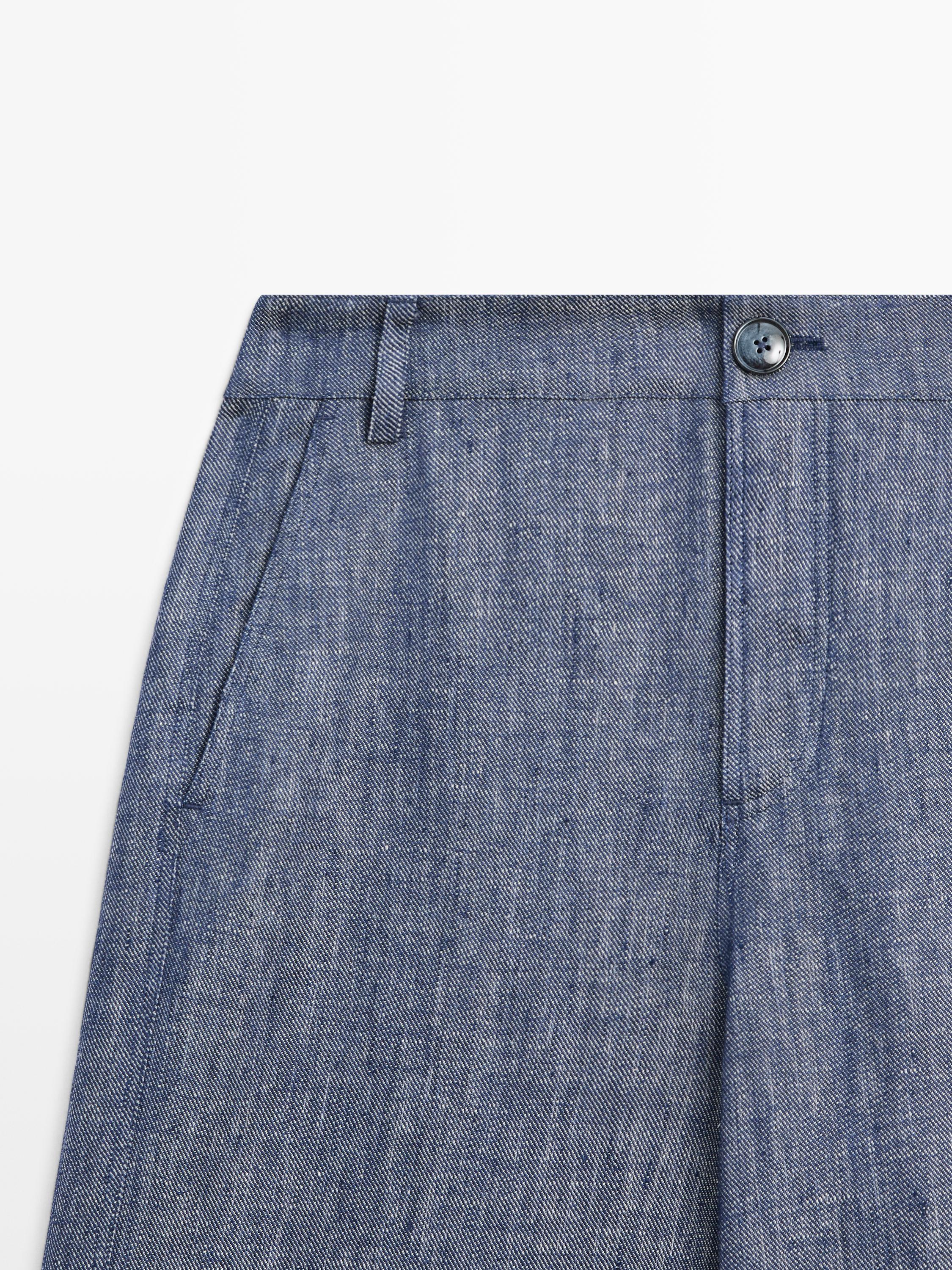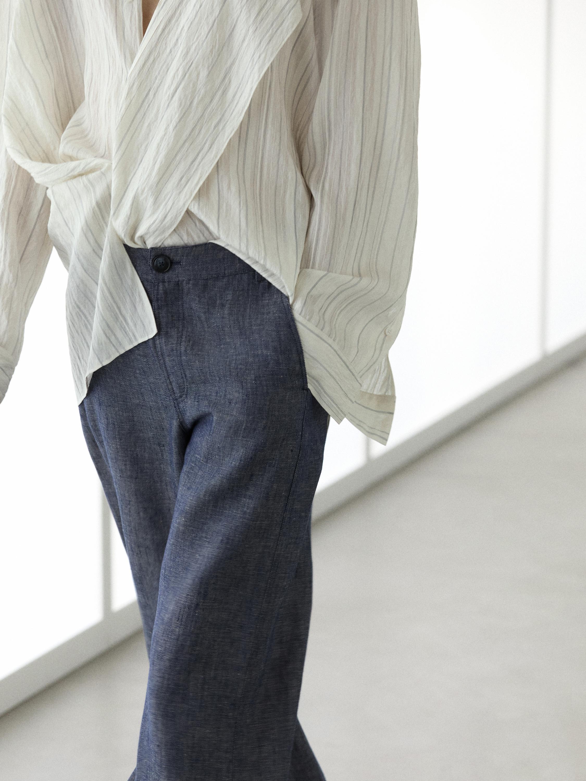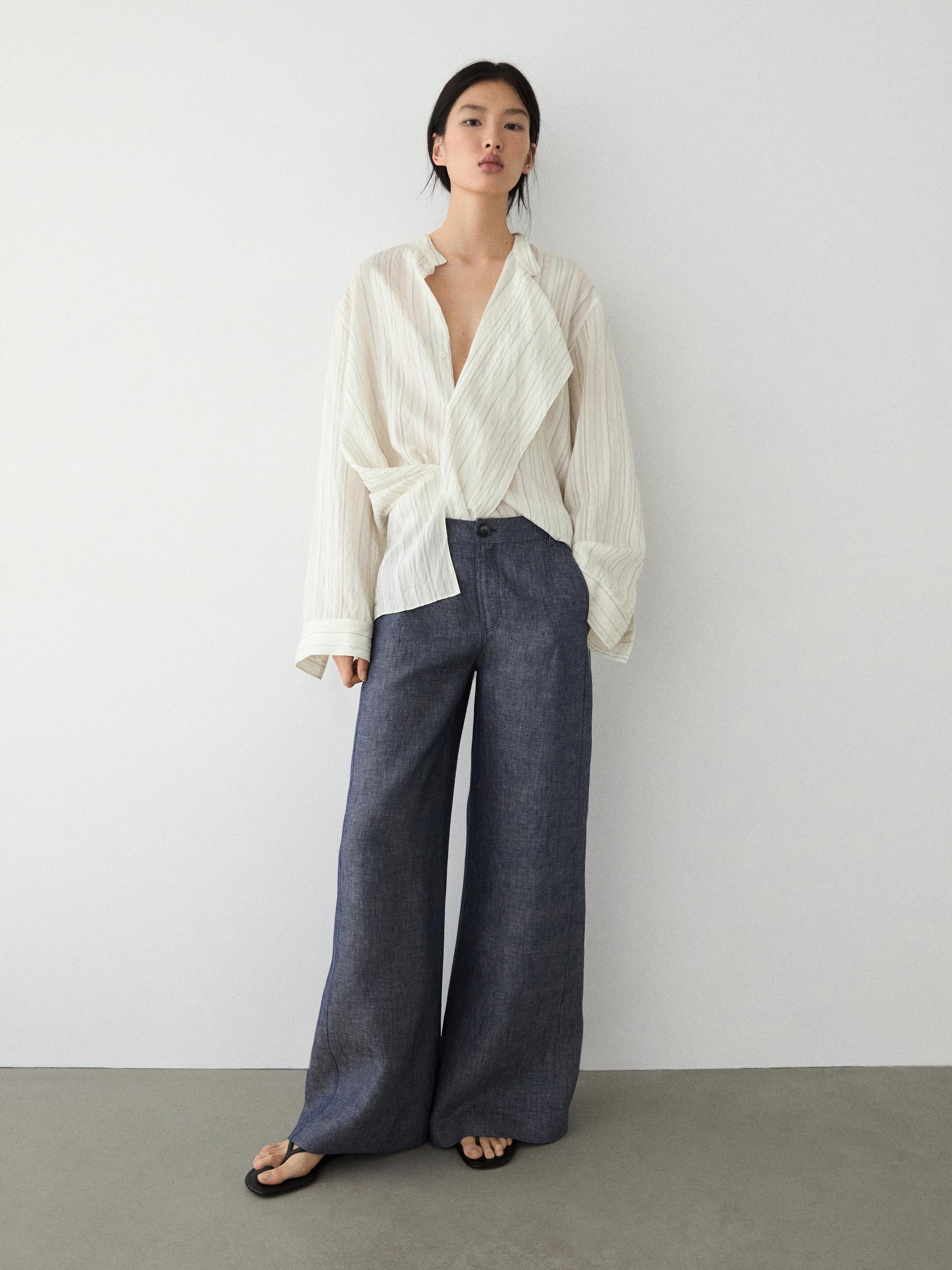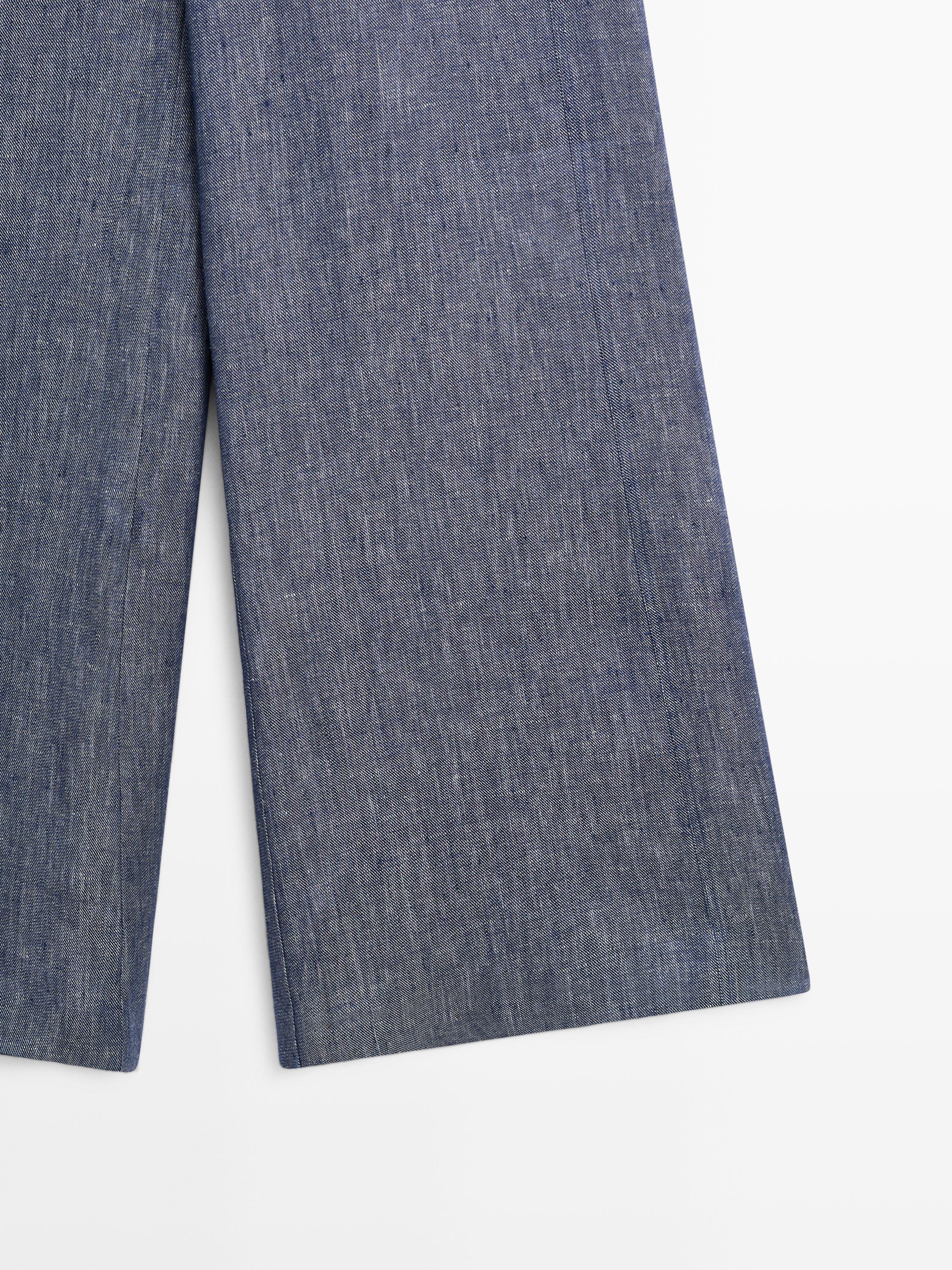 Брюки-палаццо: этот крой характеризуется приталенной талией и широкими штанинами от бедра до низа. Пояс с петлями для ремня. Застежка на молнию и пуговицу сверху. Два боковых кармана. Два накладных кармана сзади. Изготовлены из 100% льна. Отделка под деним.