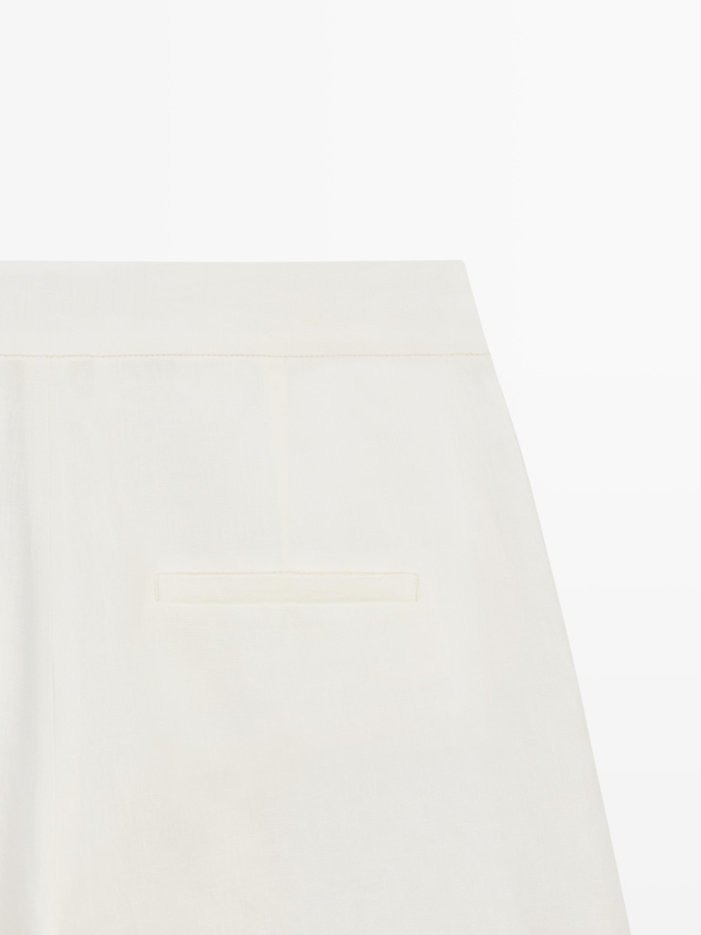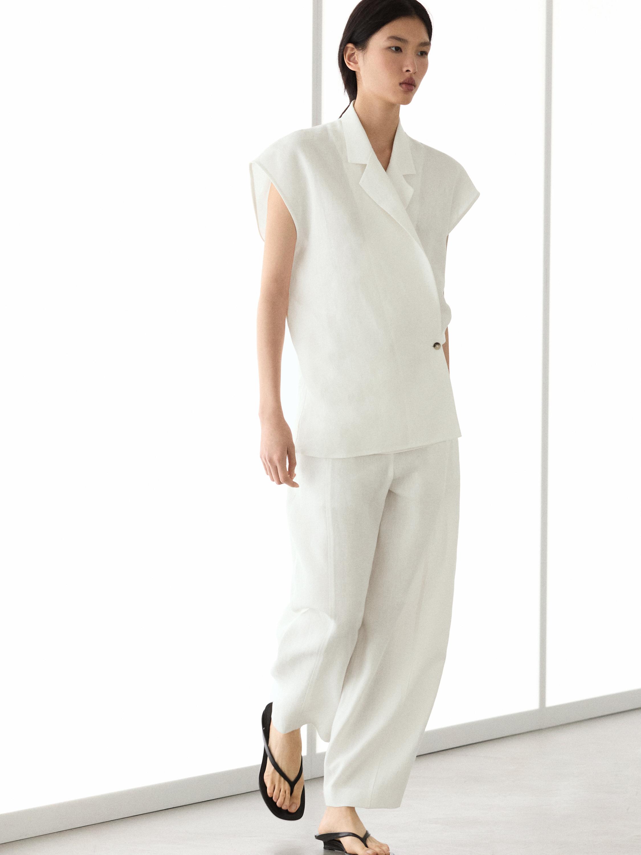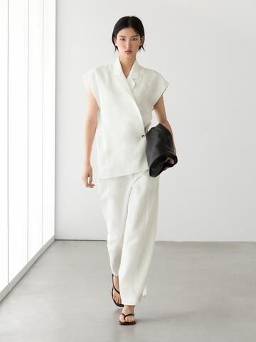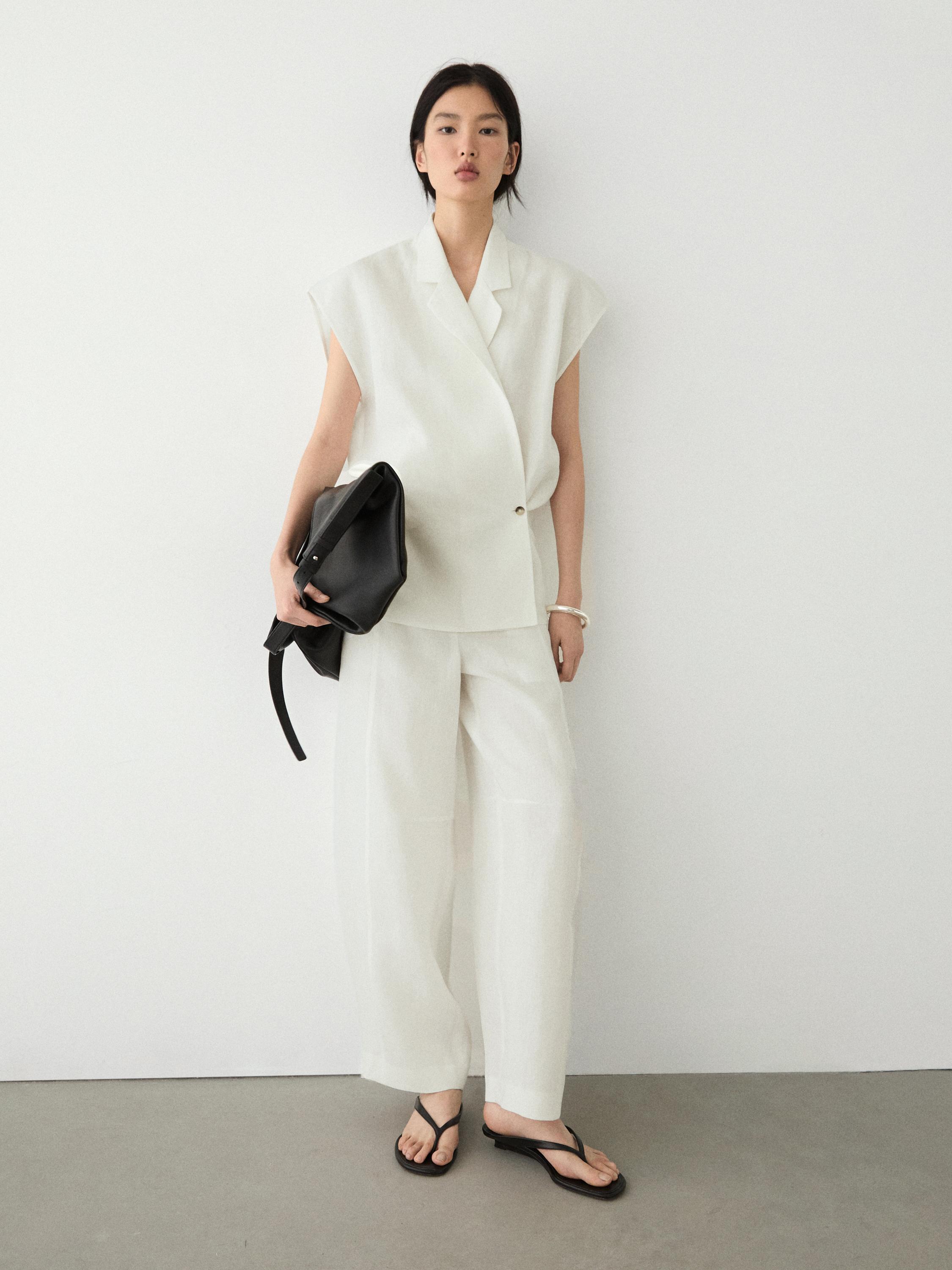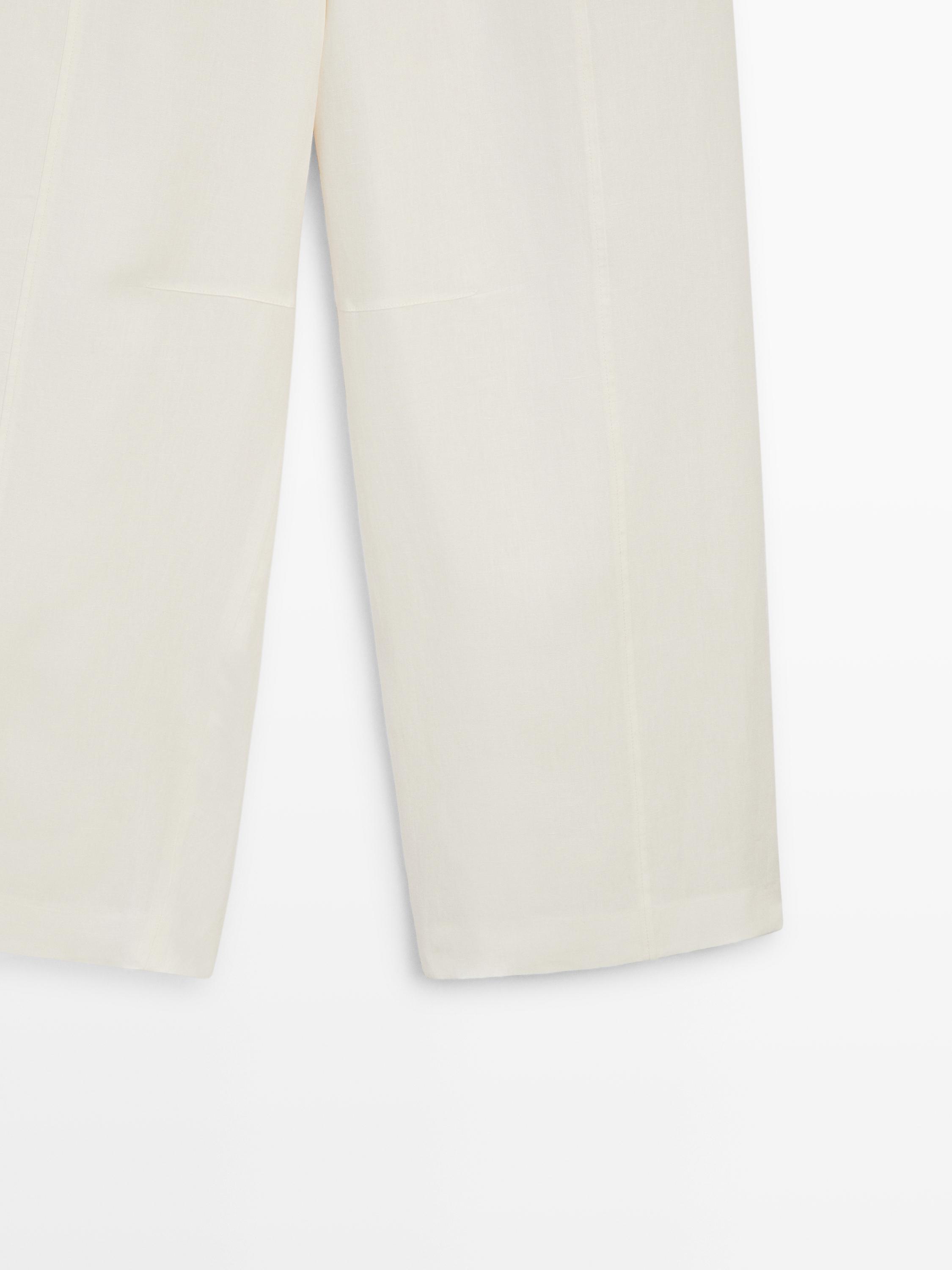 Брюки прямого кроя: этот крой отличается более широкой формой в бедрах и более узкими штанинами к щиколотке, представляя собой промежуточный вариант между узким и стандартным кроем. Брюки из льна. Молния скрыта планкой, пуговицей и ремешком с застежкой на крючок и петлю. Два боковых кармана. Два прорезных кармана сзади.