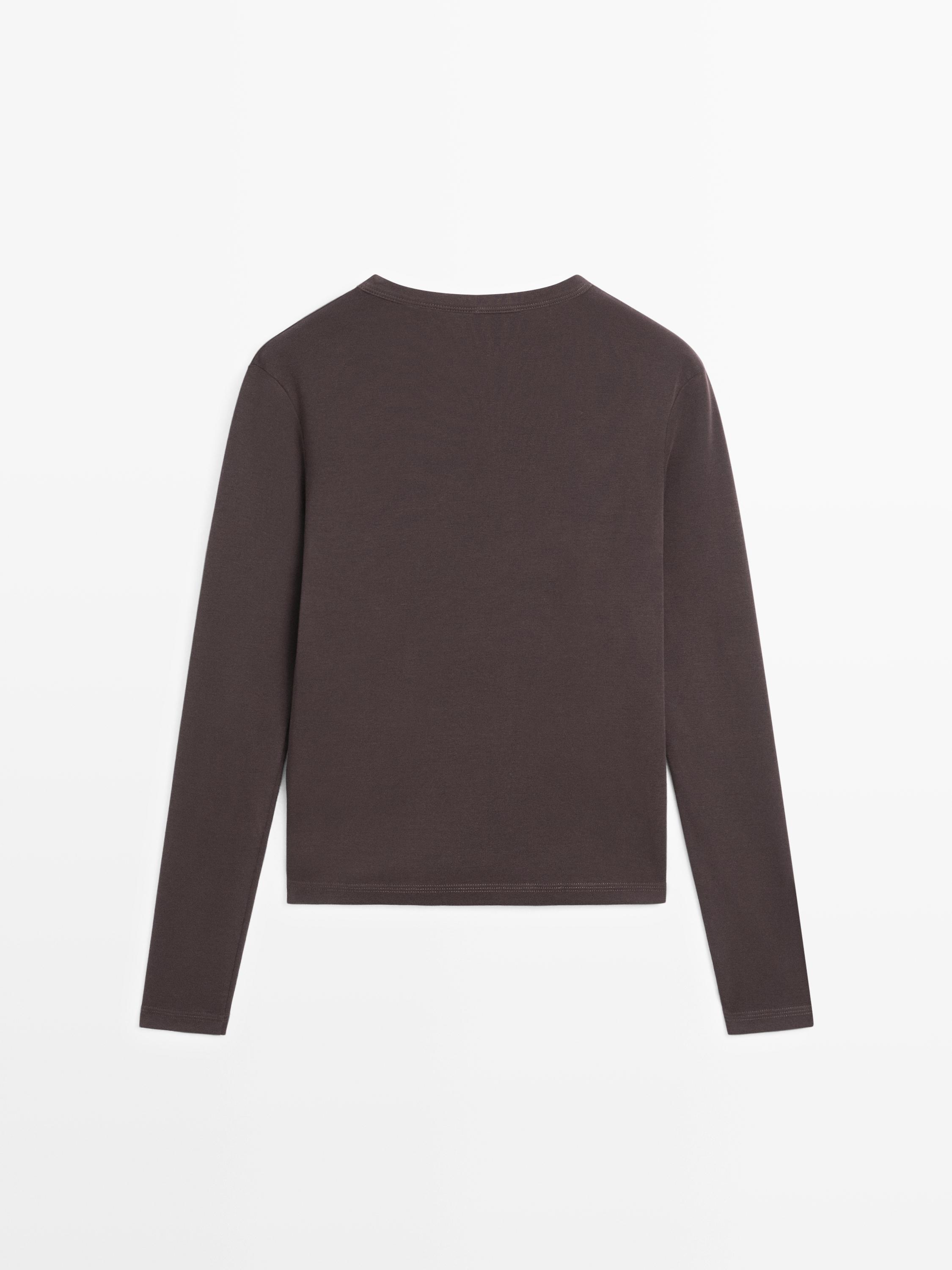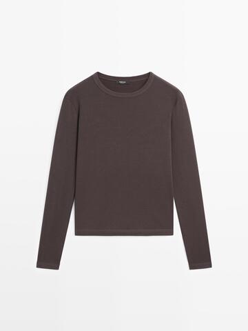Футболка из 100% хлопка. Слегка зауженный крой, который задает более четкие контуры, делая фигуру визуально стройнее. Круглый вырез. Длинные рукава.
