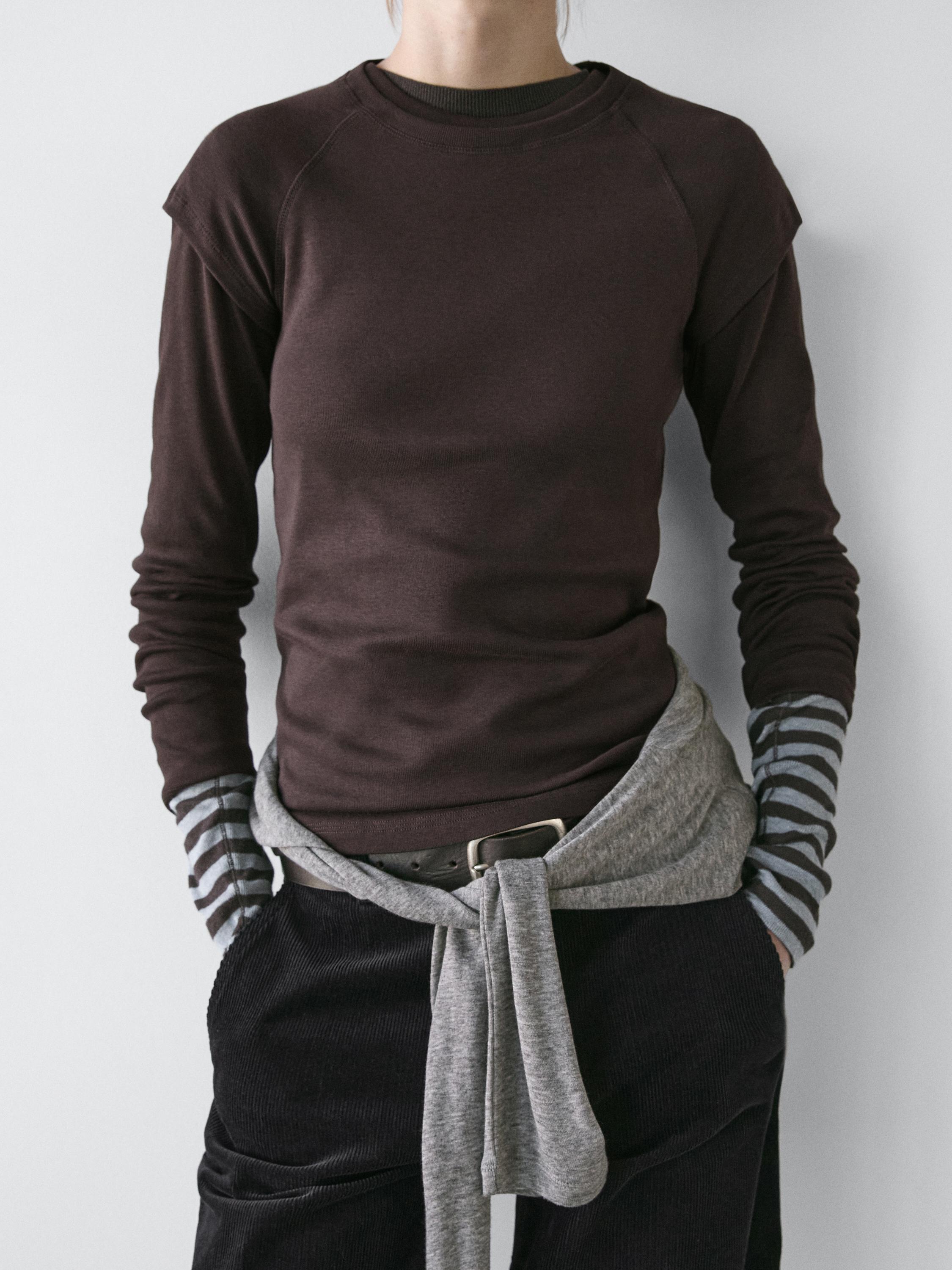 Massimo Dutti Меланжевая футболка в рубчик с длинными рукавами, коричневый