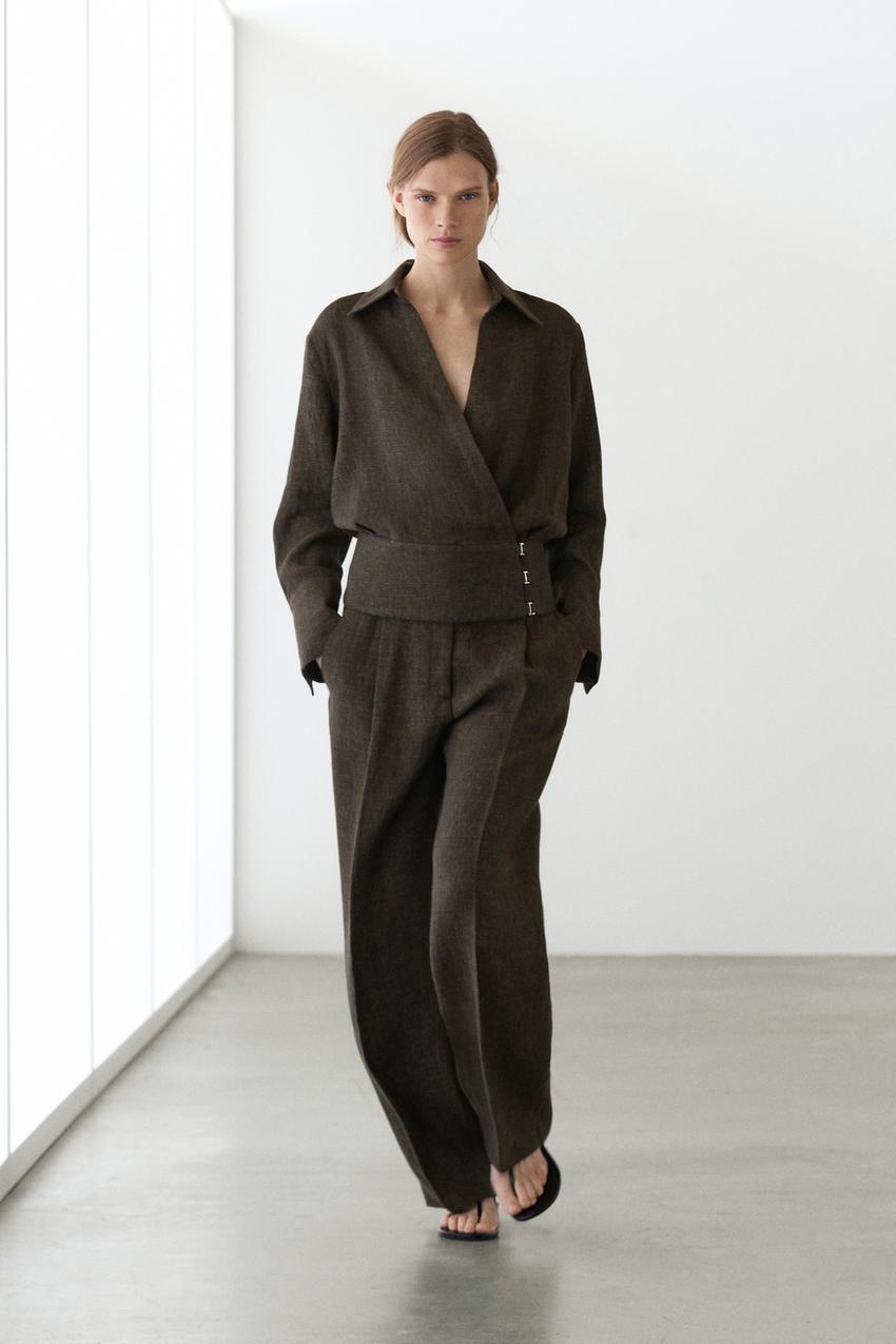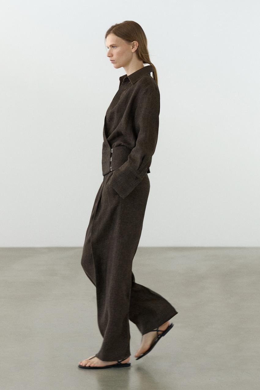Брюки прямого кроя из 100% льна. Пояс с петлями для ремня. Застежка-молния, скрытая планкой, кнопкой и ремешком на пуговицах. Два боковых кармана. Два прорезных кармана сзади. Вытачки спереди.