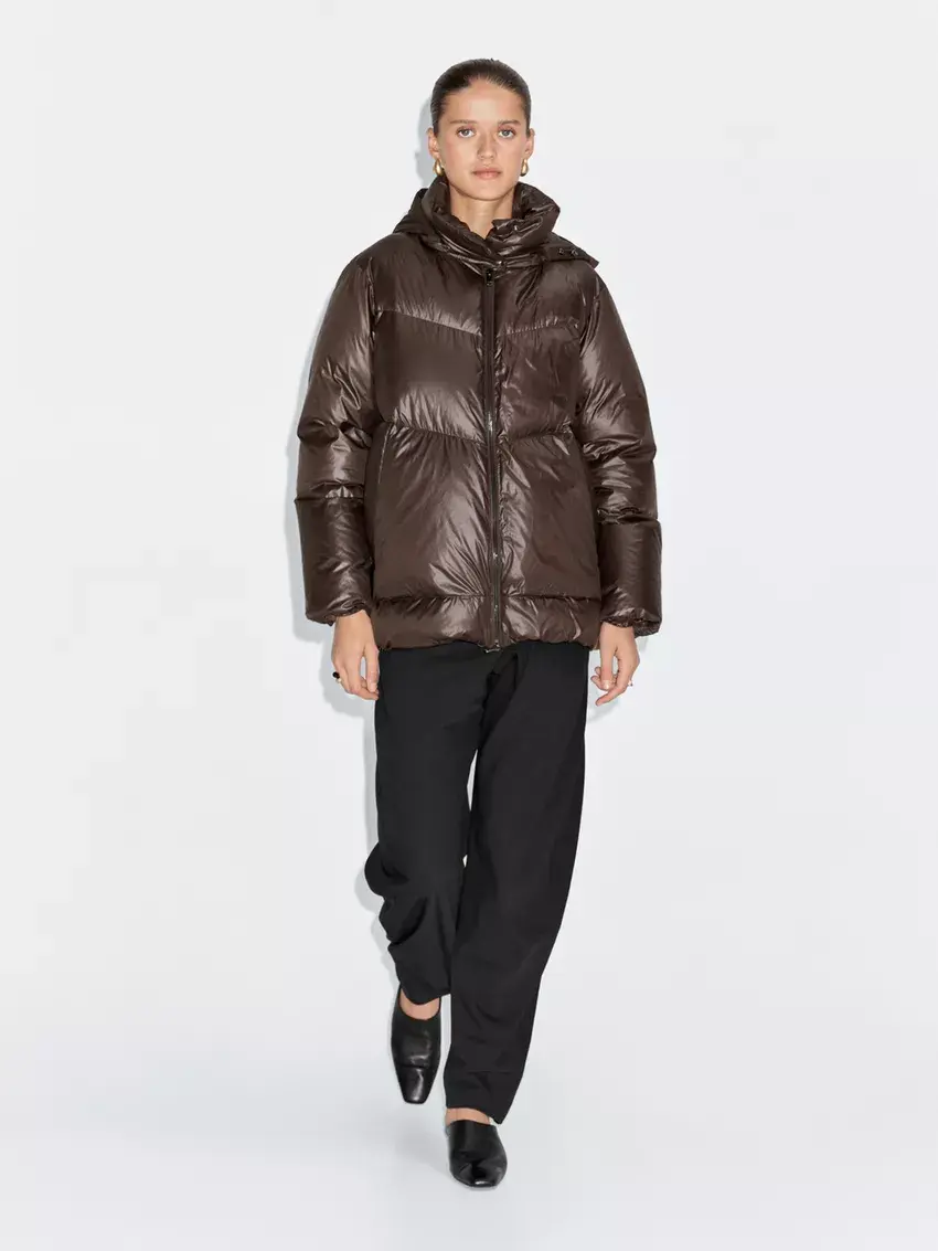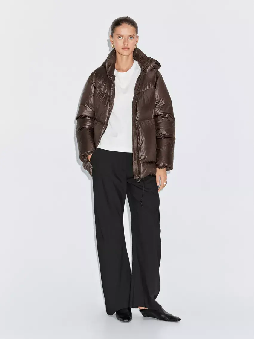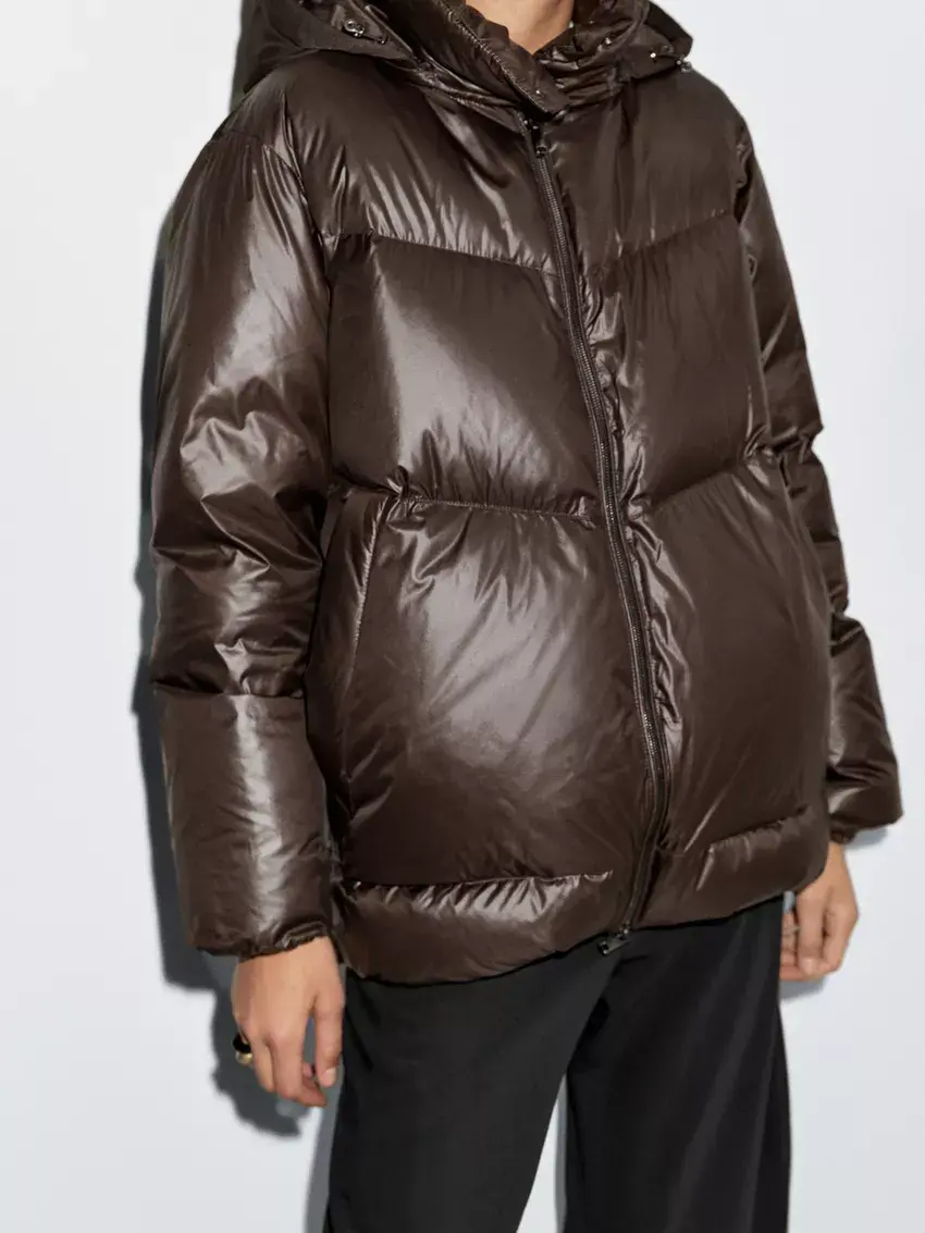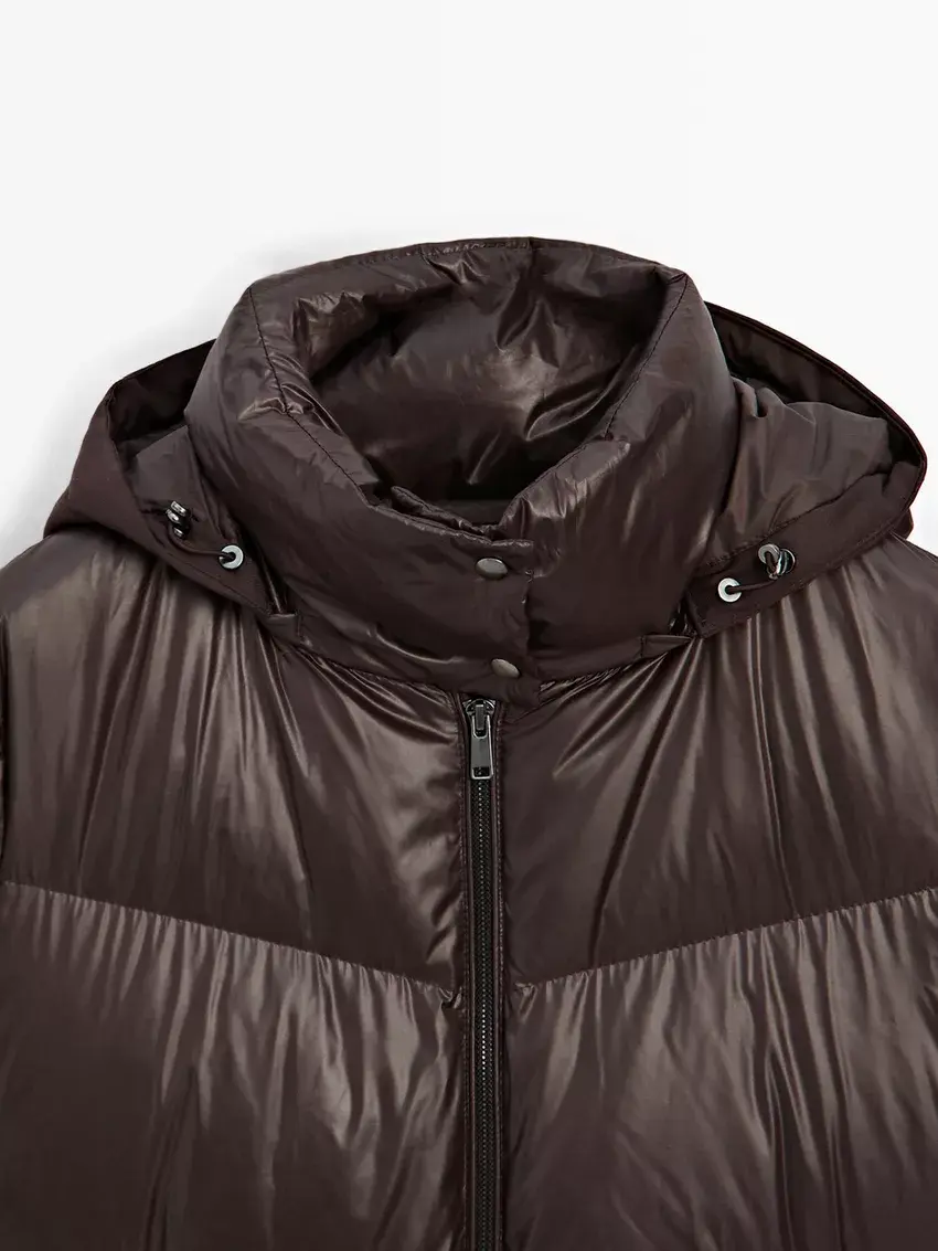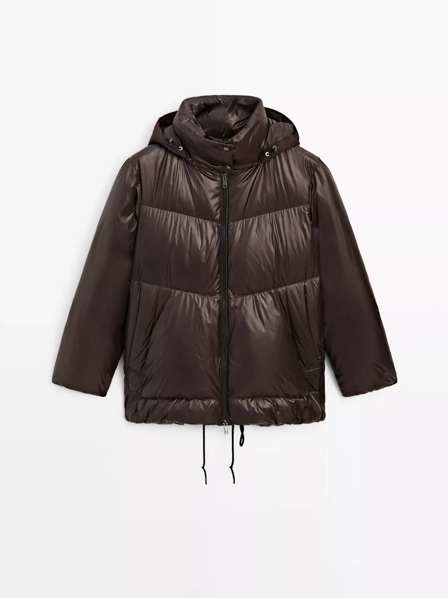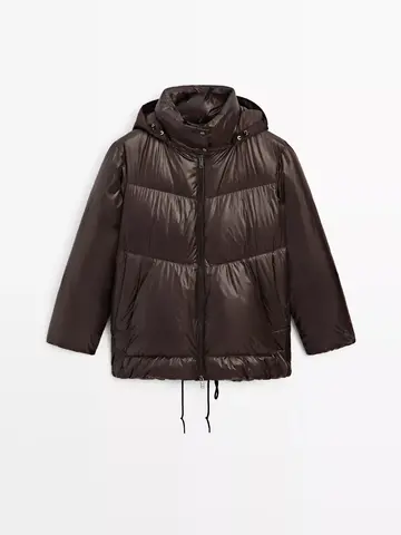 Стеганая куртка с пуховым наполнителем. Высокий воротник с планкой на кнопках. Застегивается на молнию с двойным бегунком.. Отстегивающийся регулируемый капюшон. Два боковых кармана. Регулируемый низ со шнурком. Деталь из контрастной ткани .