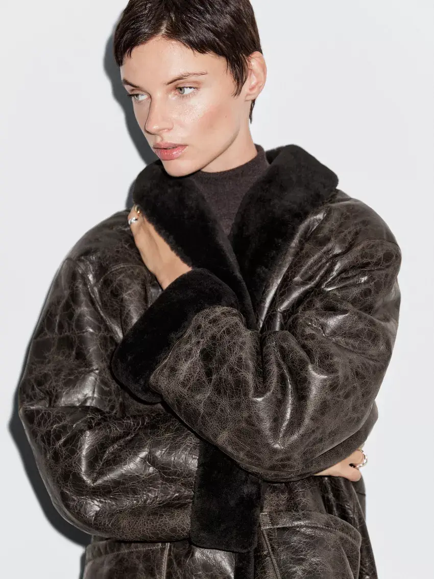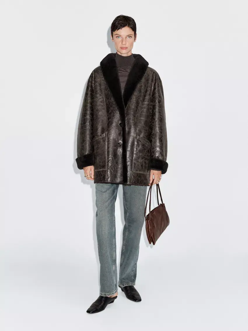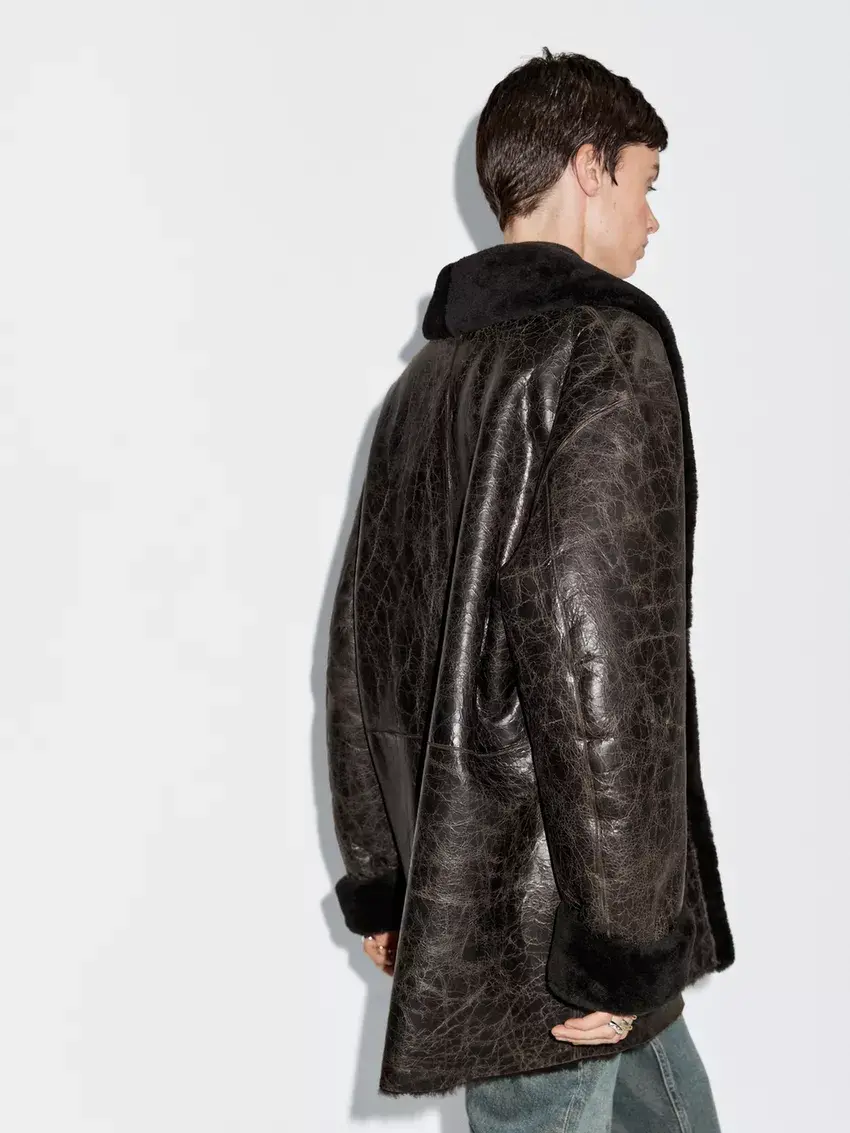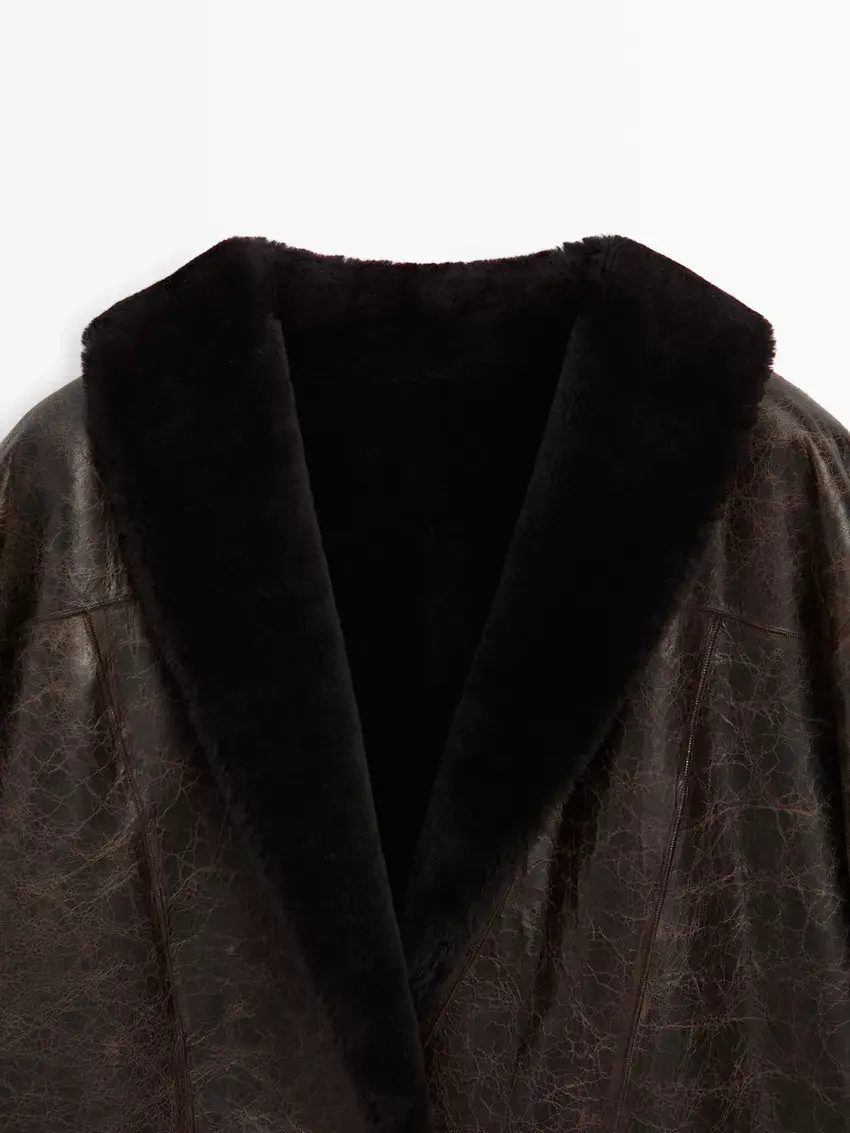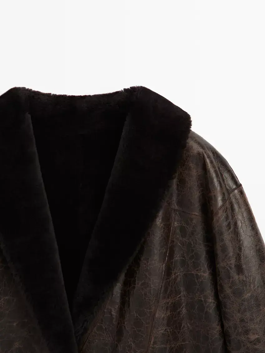 Massimo Dutti Пальто из мутоновой кожи с эффектом кракле, коричневый