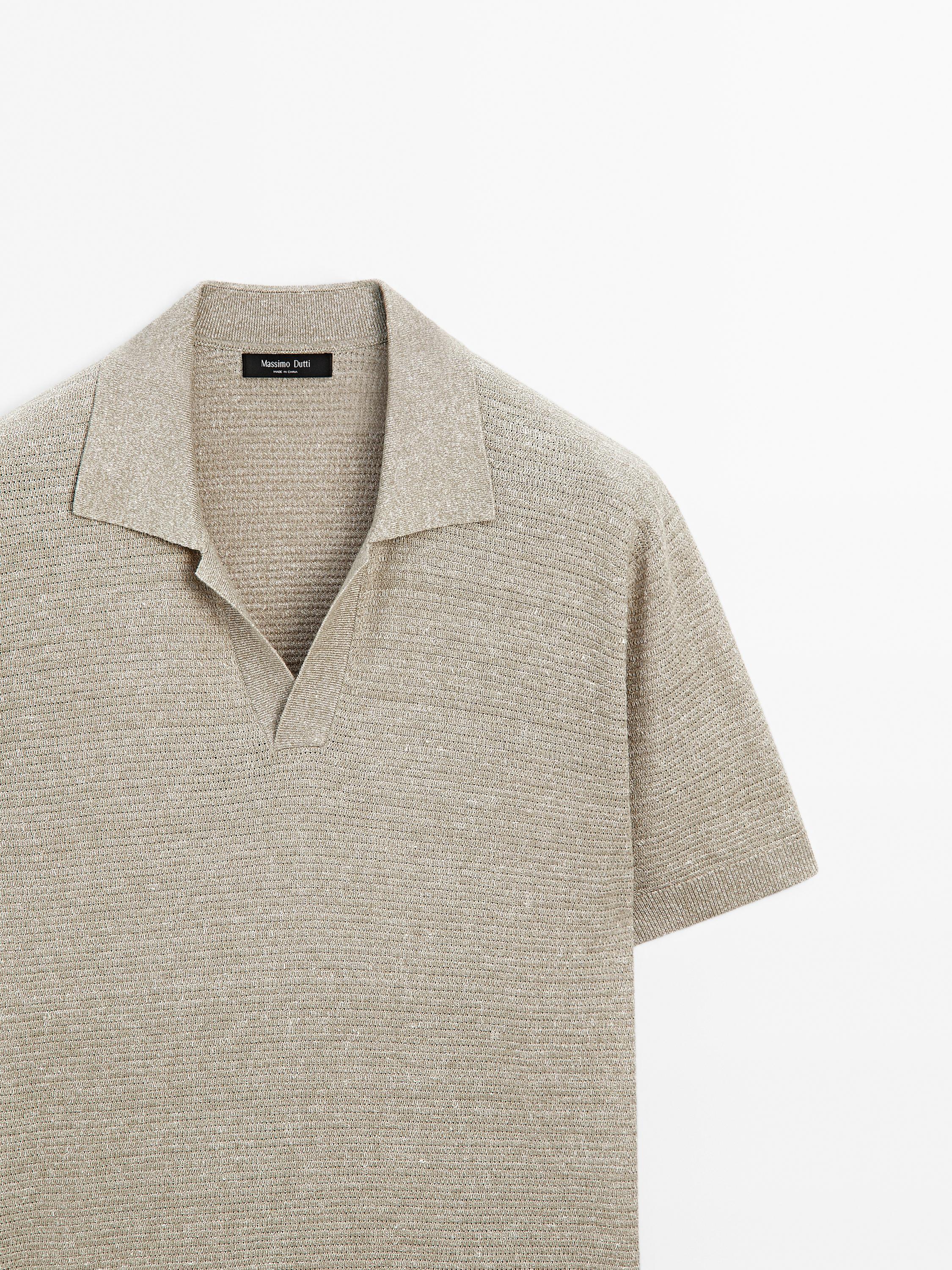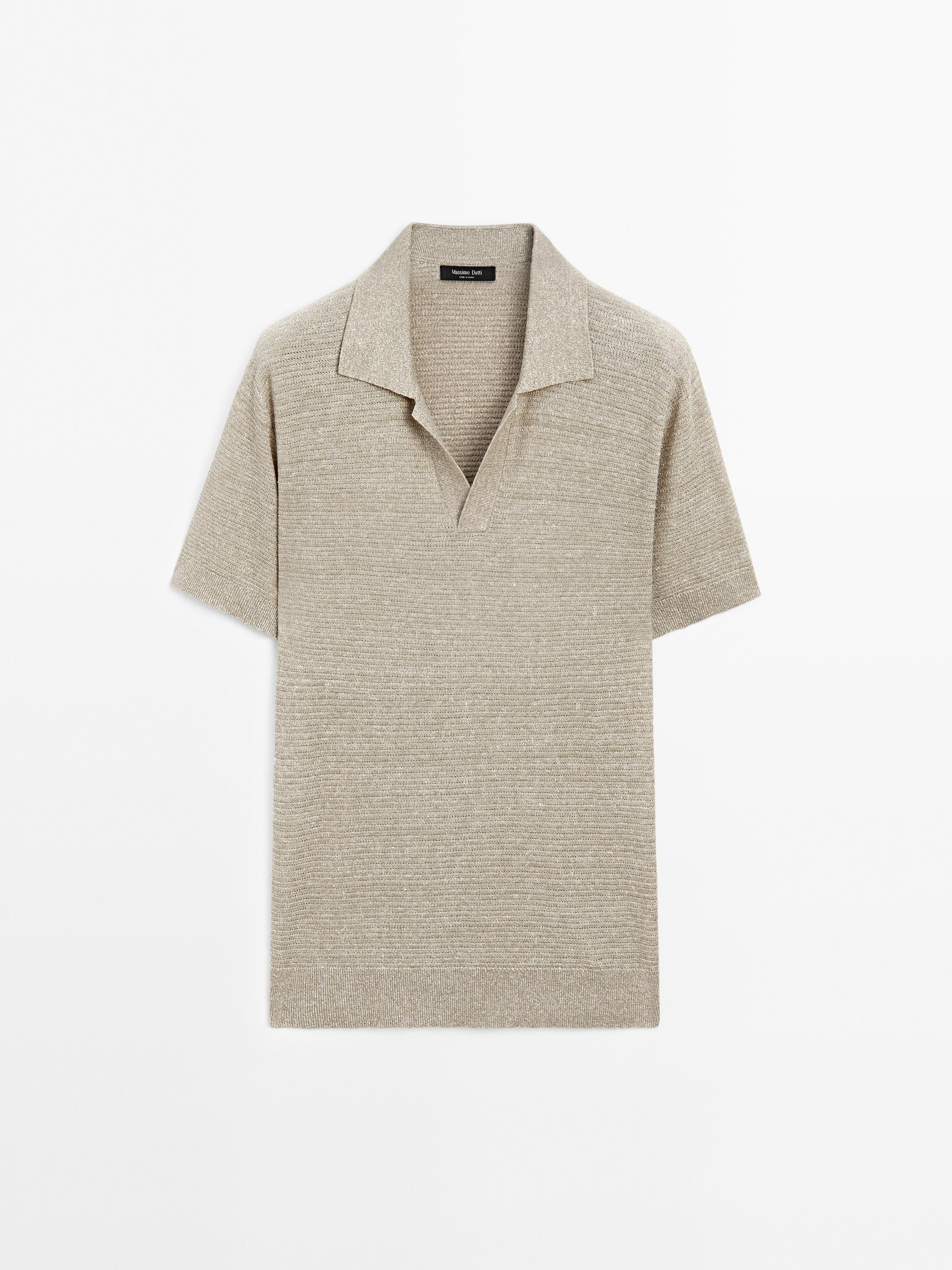 Поло из смеси льна и хлопка. V-образный вырез. Короткие рукава. Контрастная текстура. Слегка свободный крой для дополнительного комфорта.