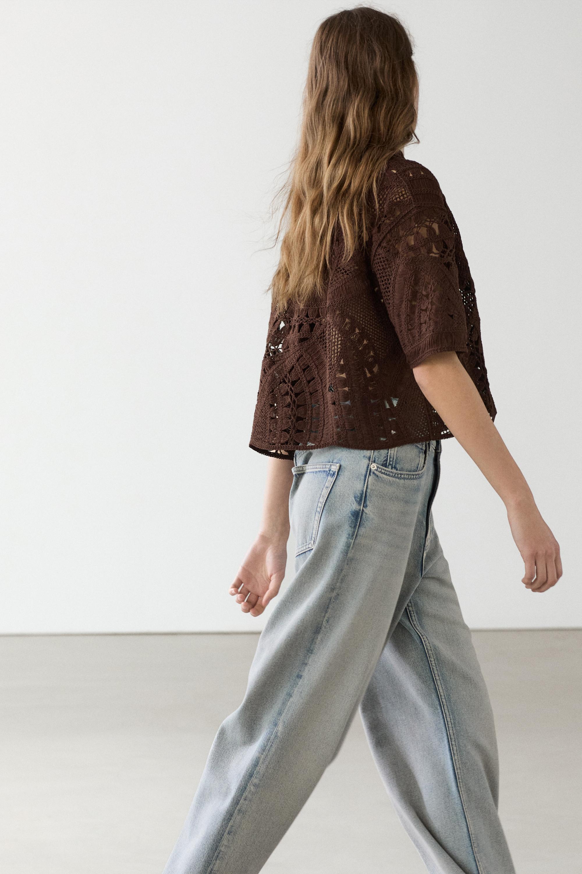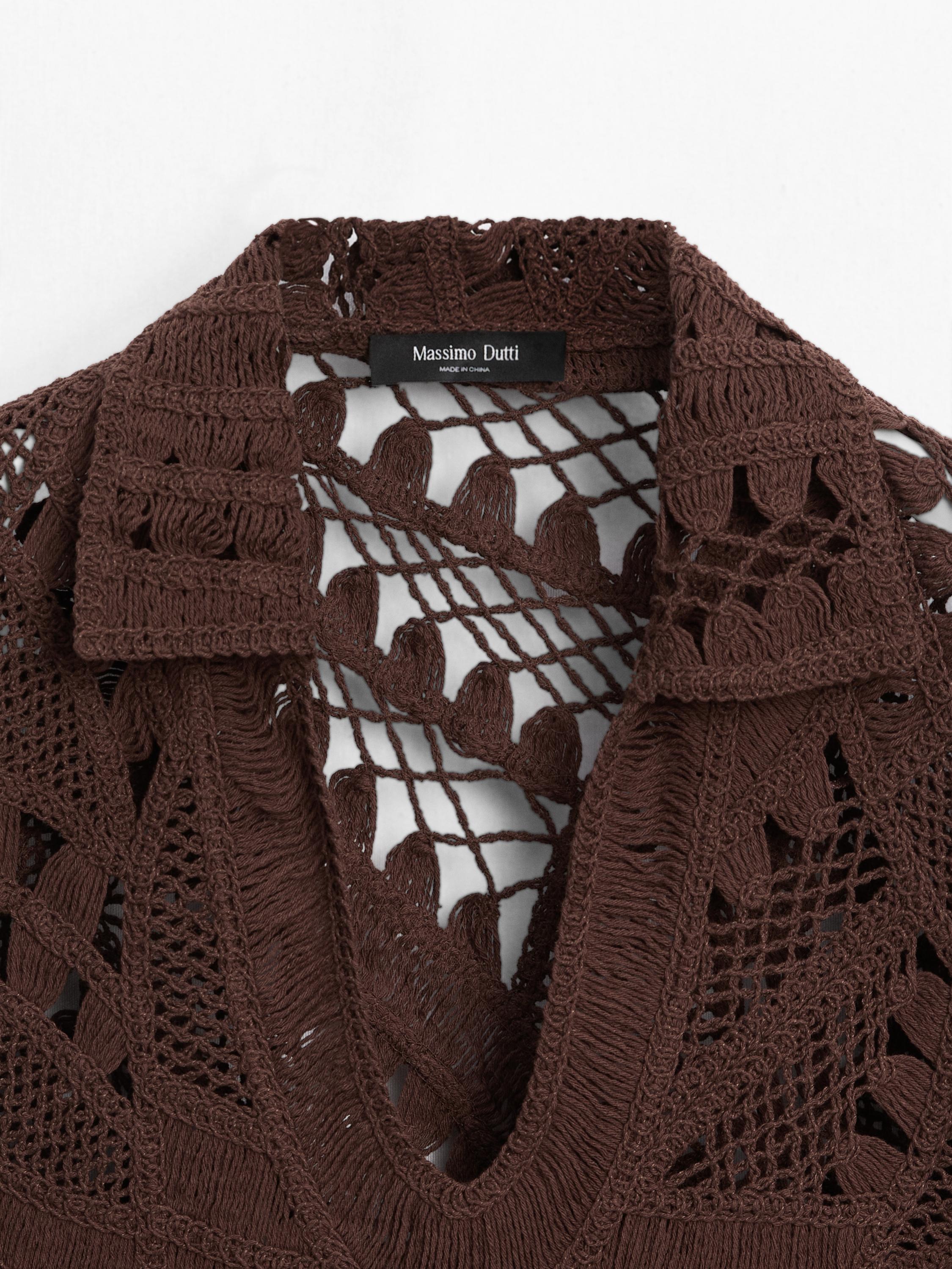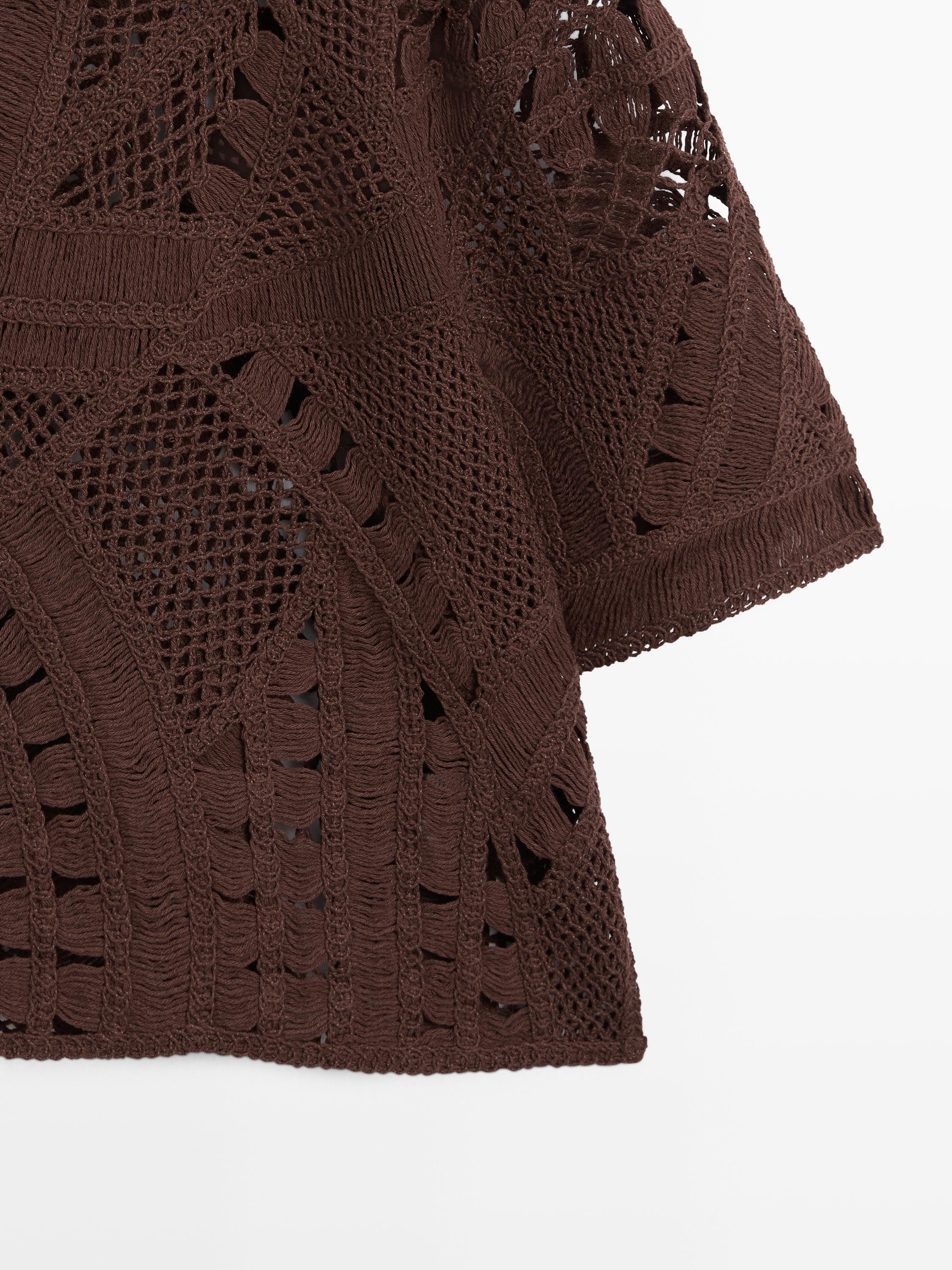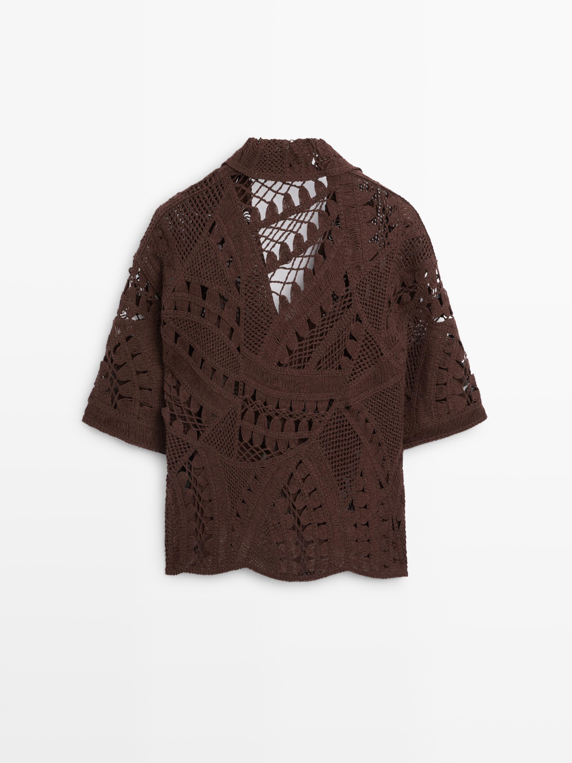 Футболка из смесовой хлопковой ткани. Широкий многослойный воротник. Короткие рукава. Ажурная ткань. Ткань, связанная крючком.