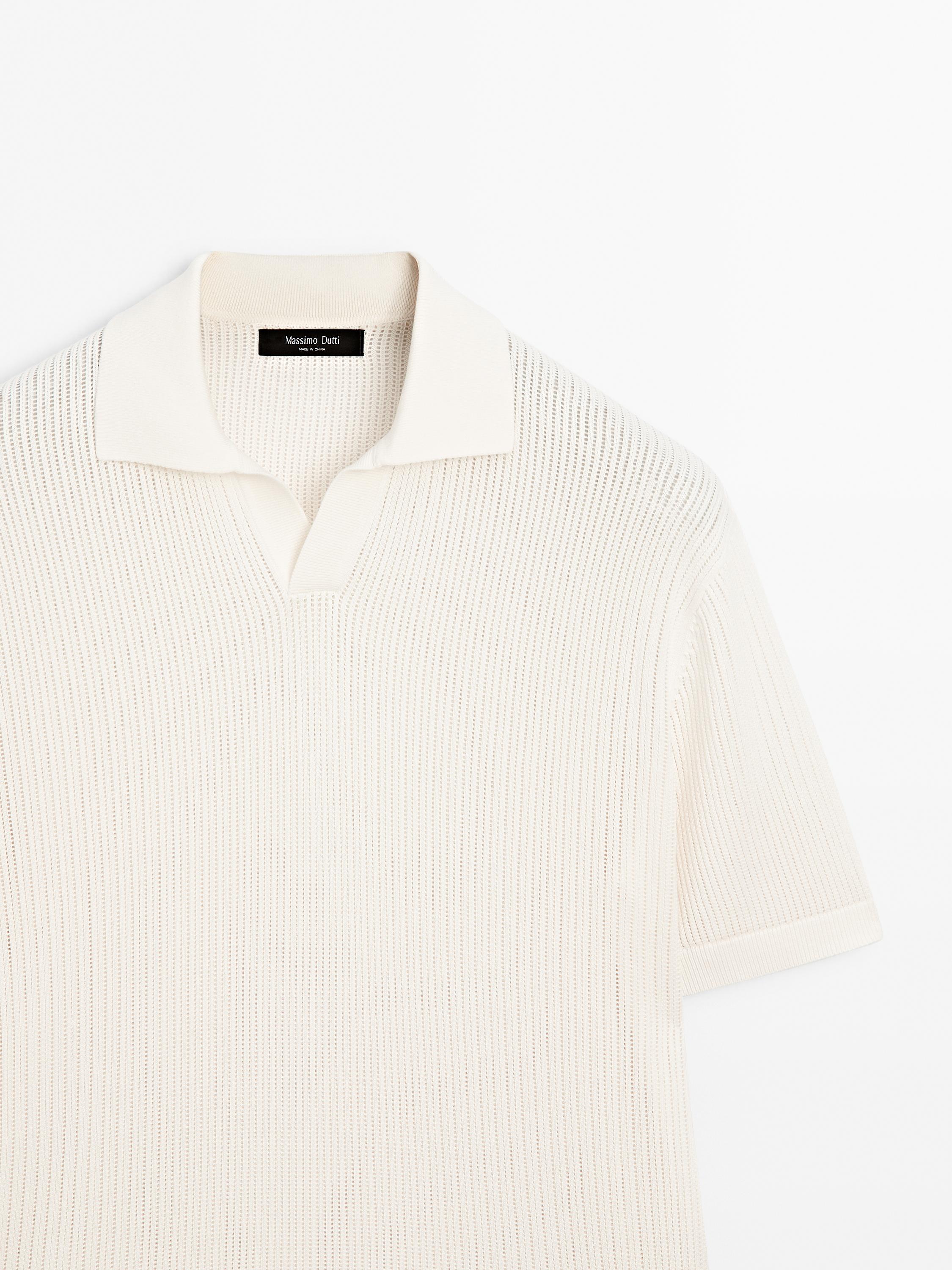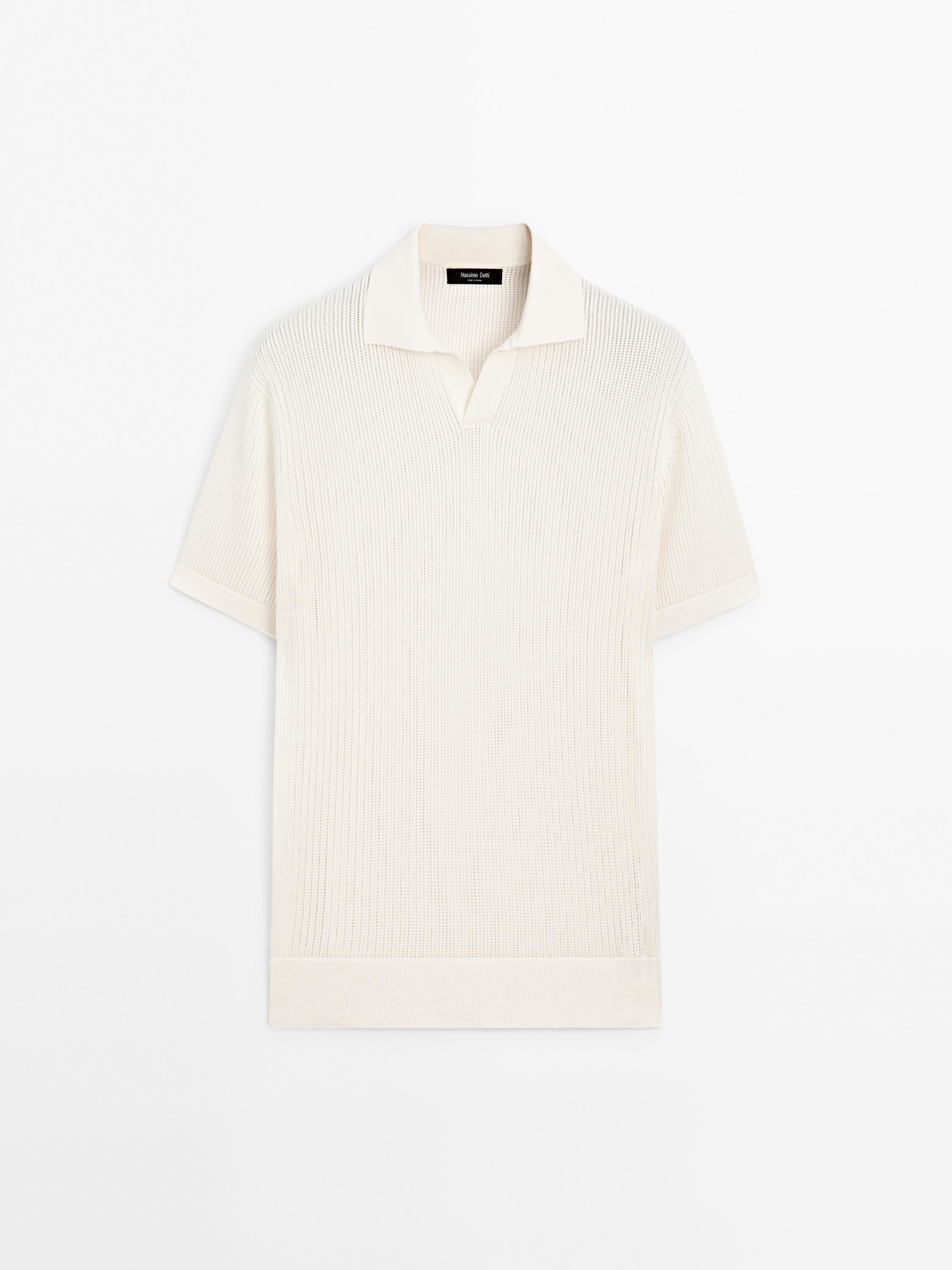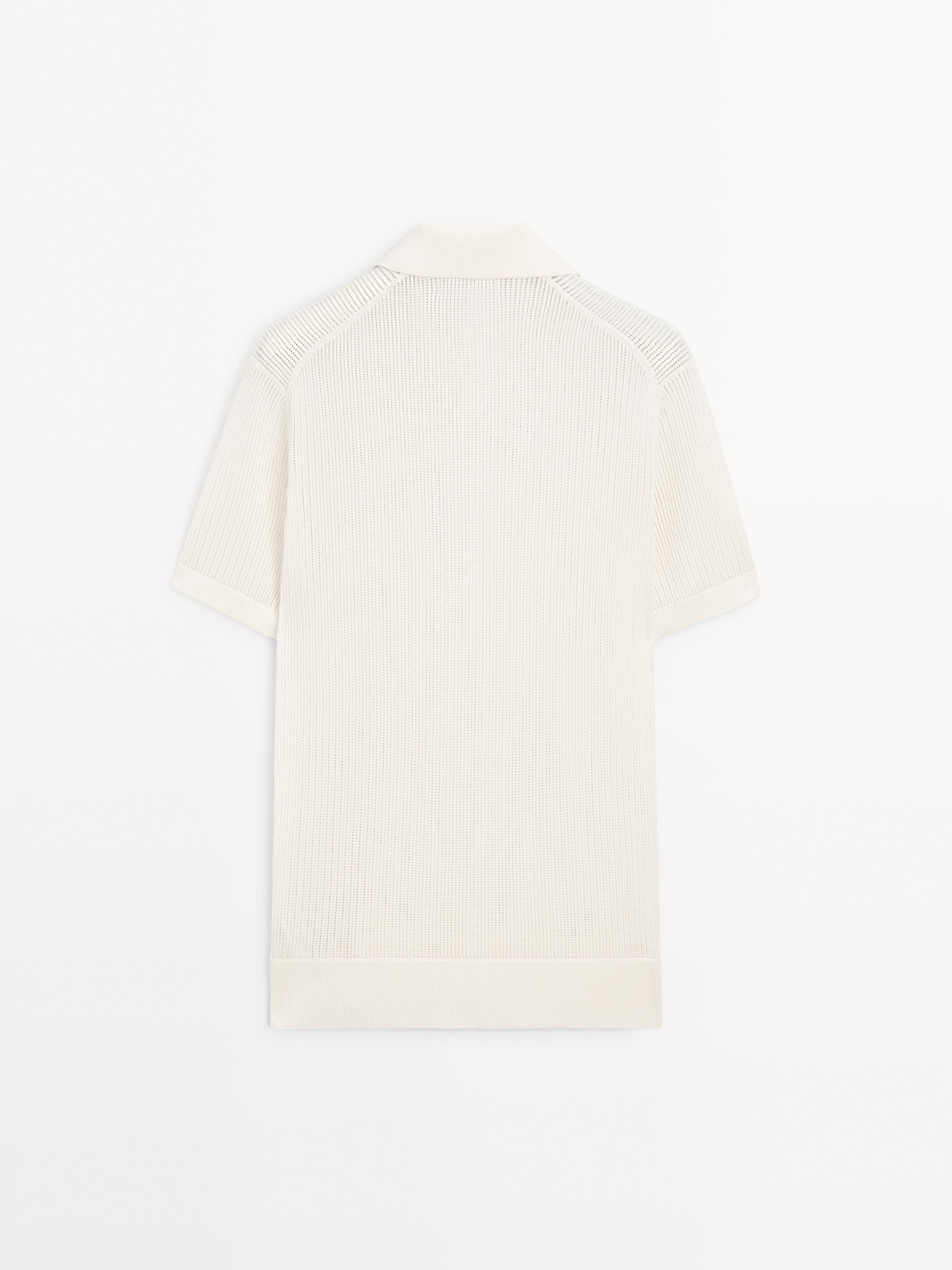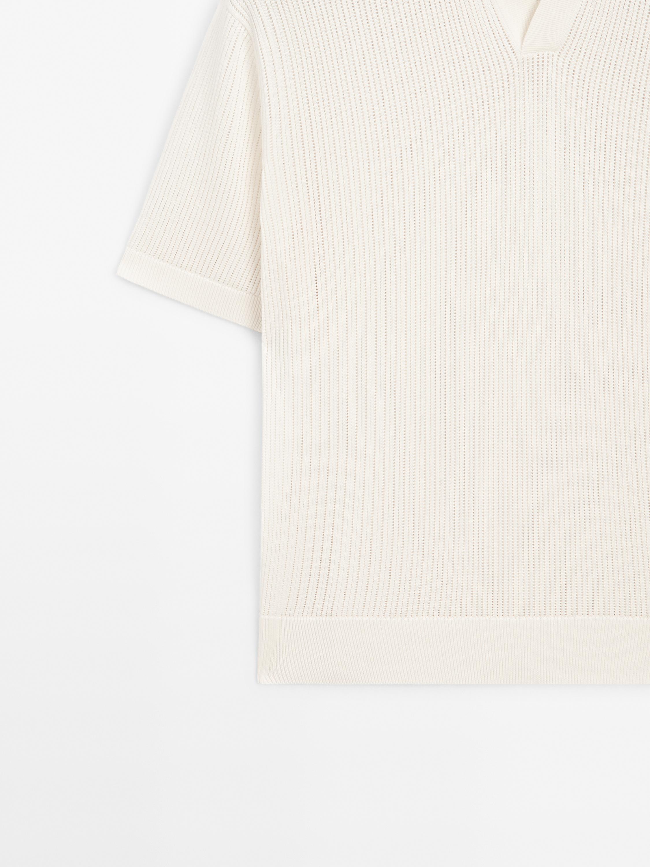Massimo Dutti Поло с V-образным вырезом и ажурной отделкой, белый