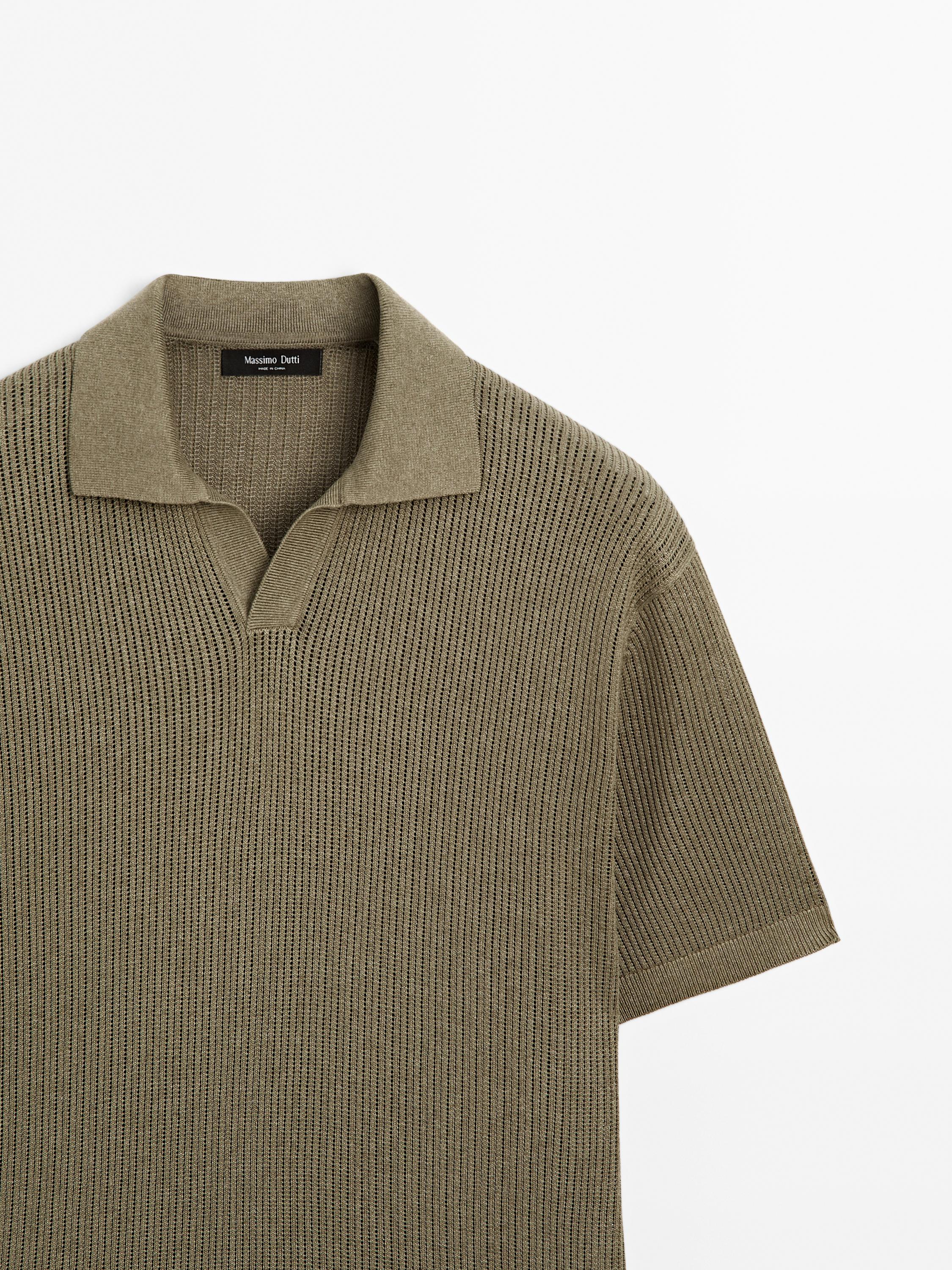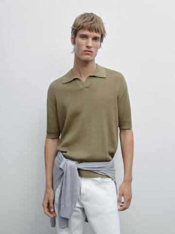 Massimo Dutti Поло с V-образным вырезом и ажурной отделкой, светлый хаки