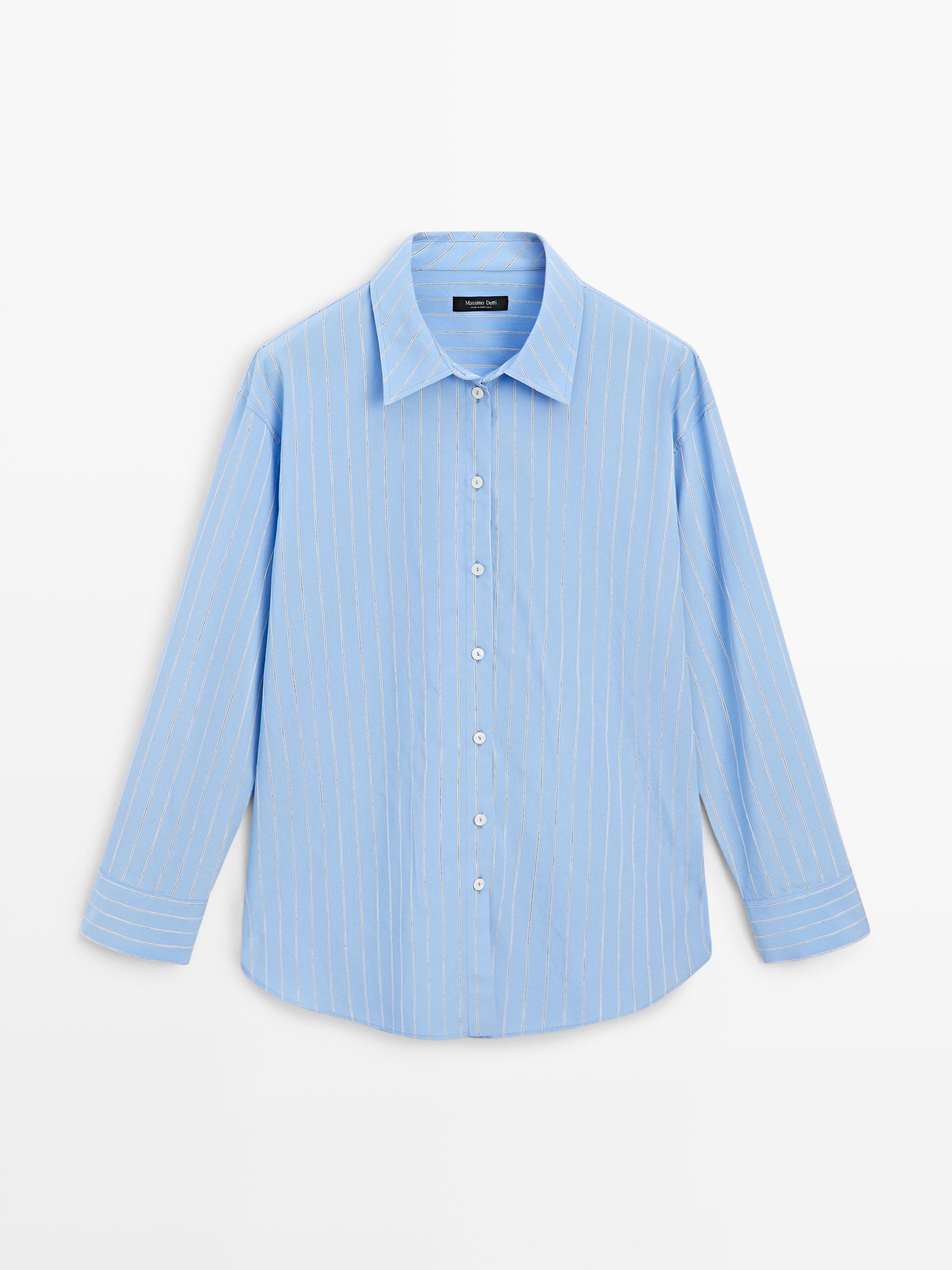 Пустая рубашка с длинными рукавами. Воротник рубашки. Манжеты на пуговицах. Застежка на пуговицах спереди. Полосатый принт.