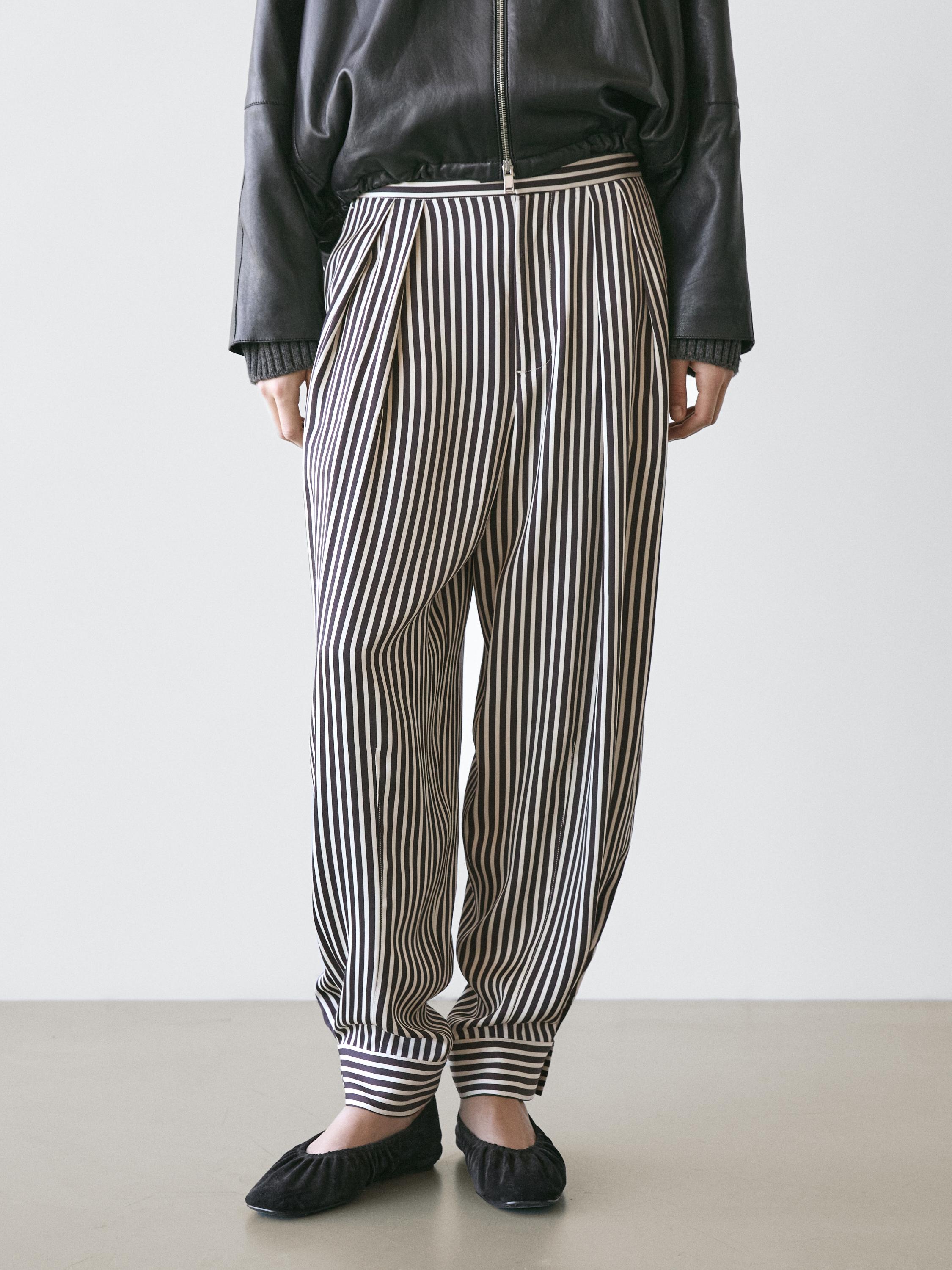Брюки Sarouel: свободный силуэт, широкие штанины и облегающий крой до щиколотки. Скрытая застежка на молнию и крючок. Два боковых кармана. Вытачки спереди. Полосатый принт.