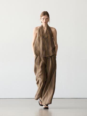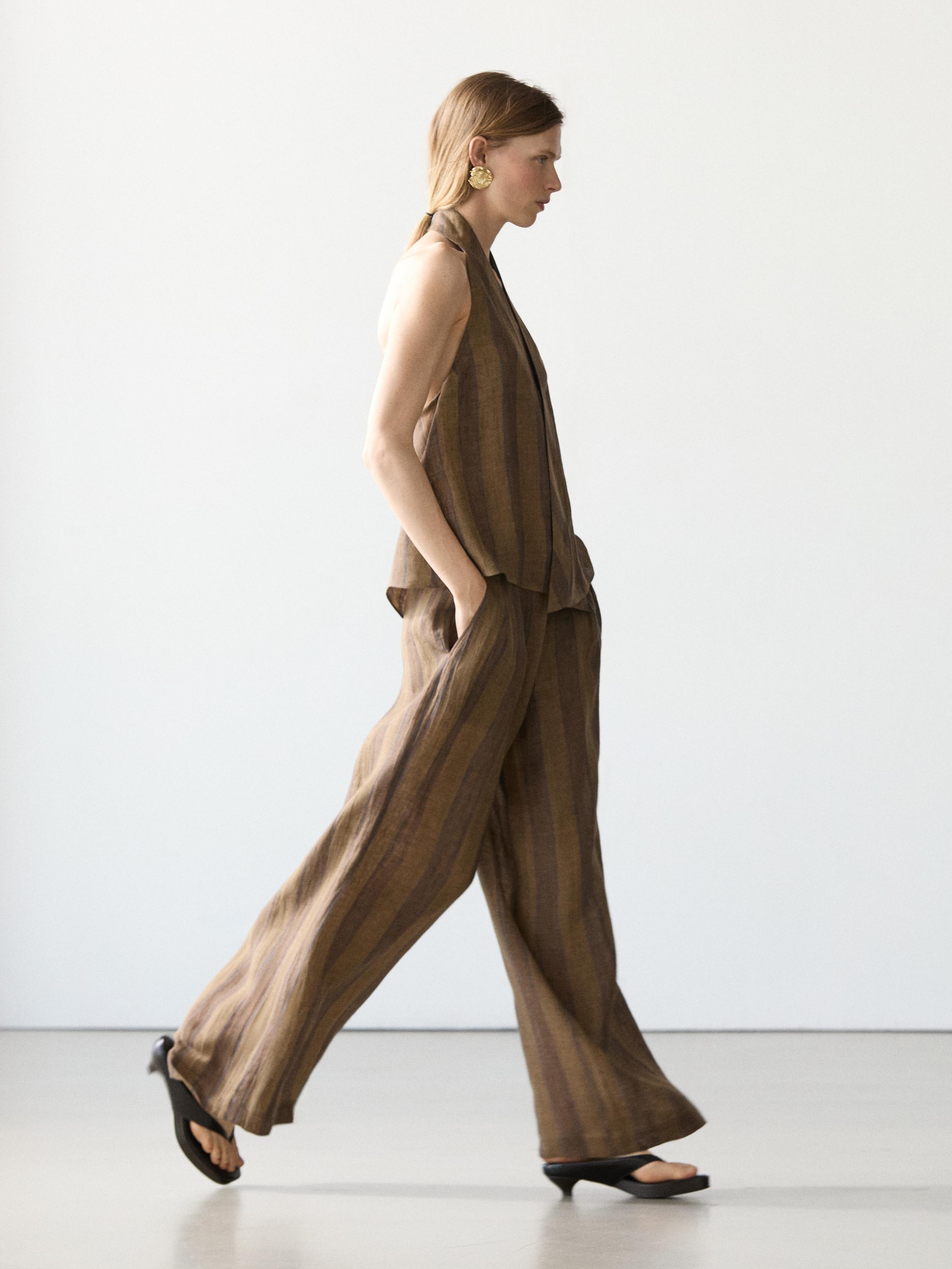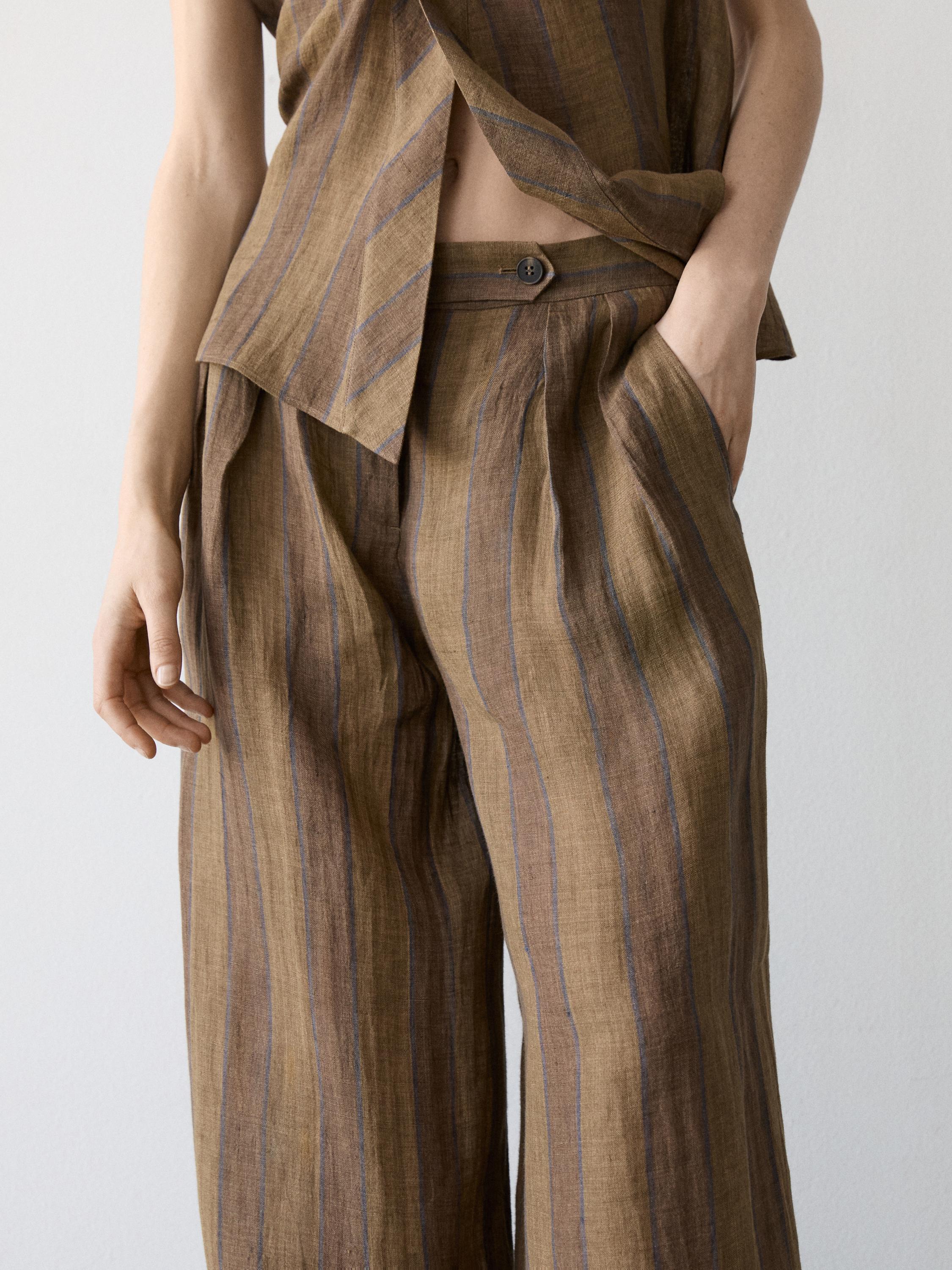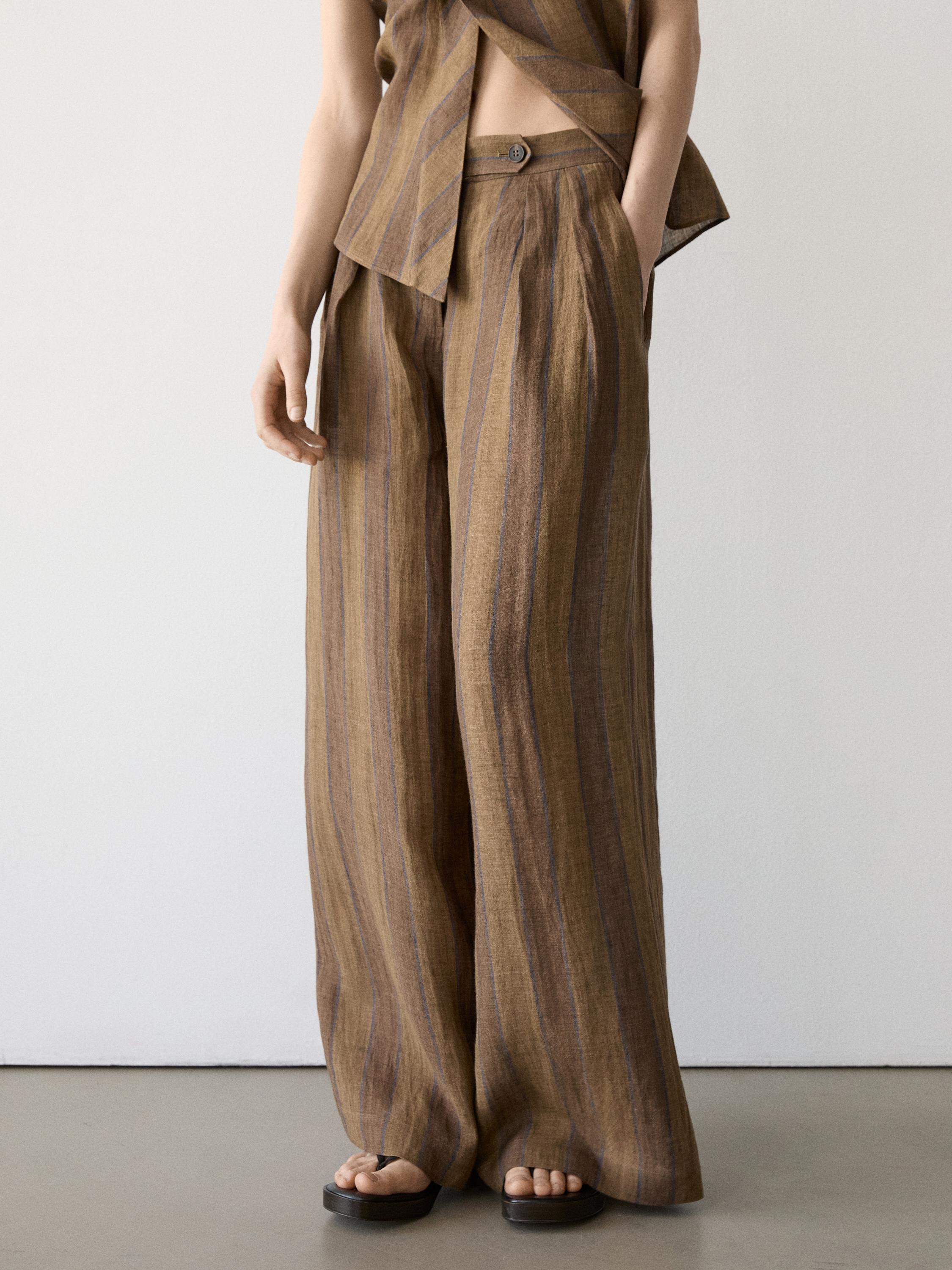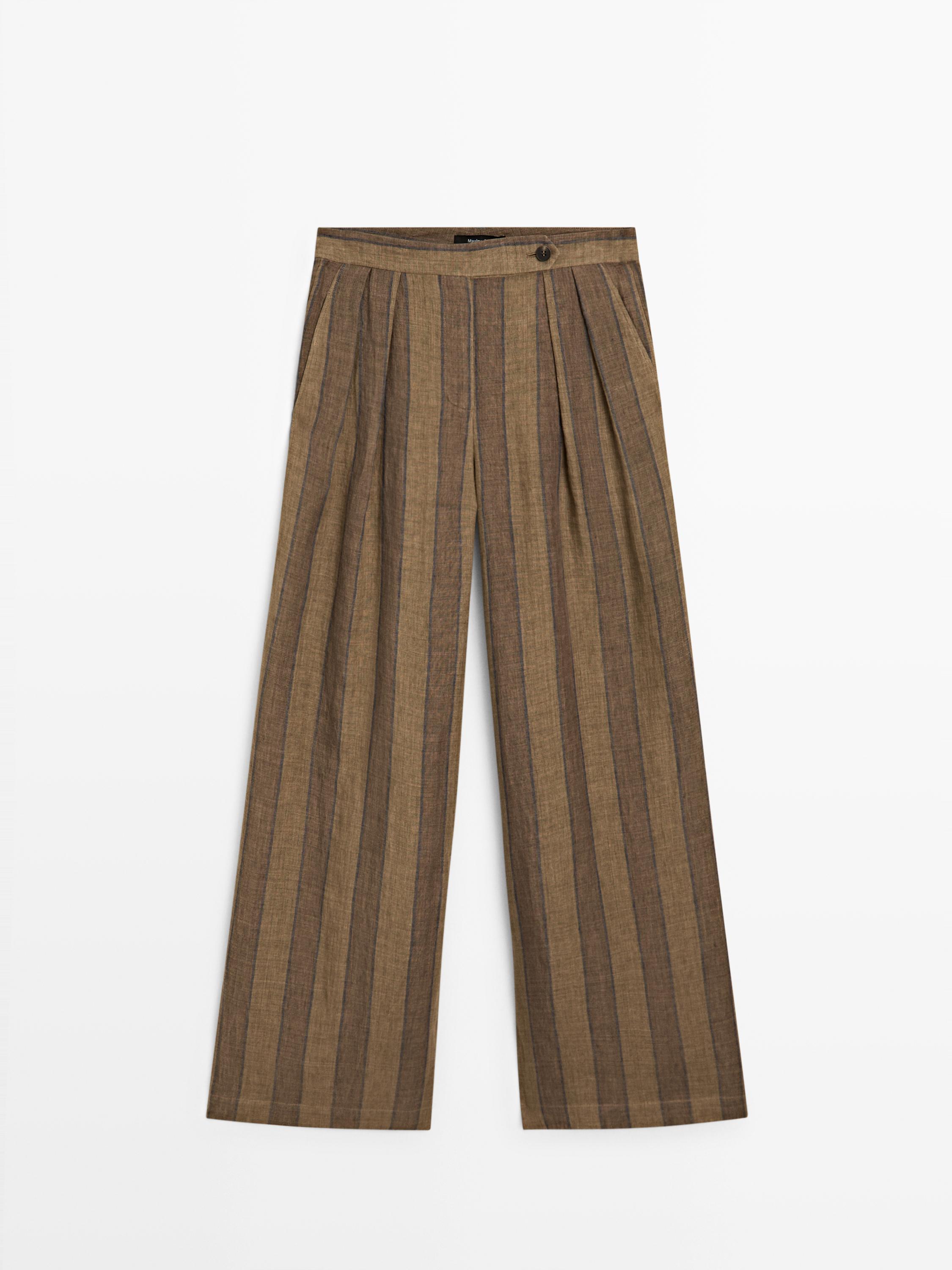 Massimo Dutti Полосатые льняные брюки с широкими штанинами, хаки