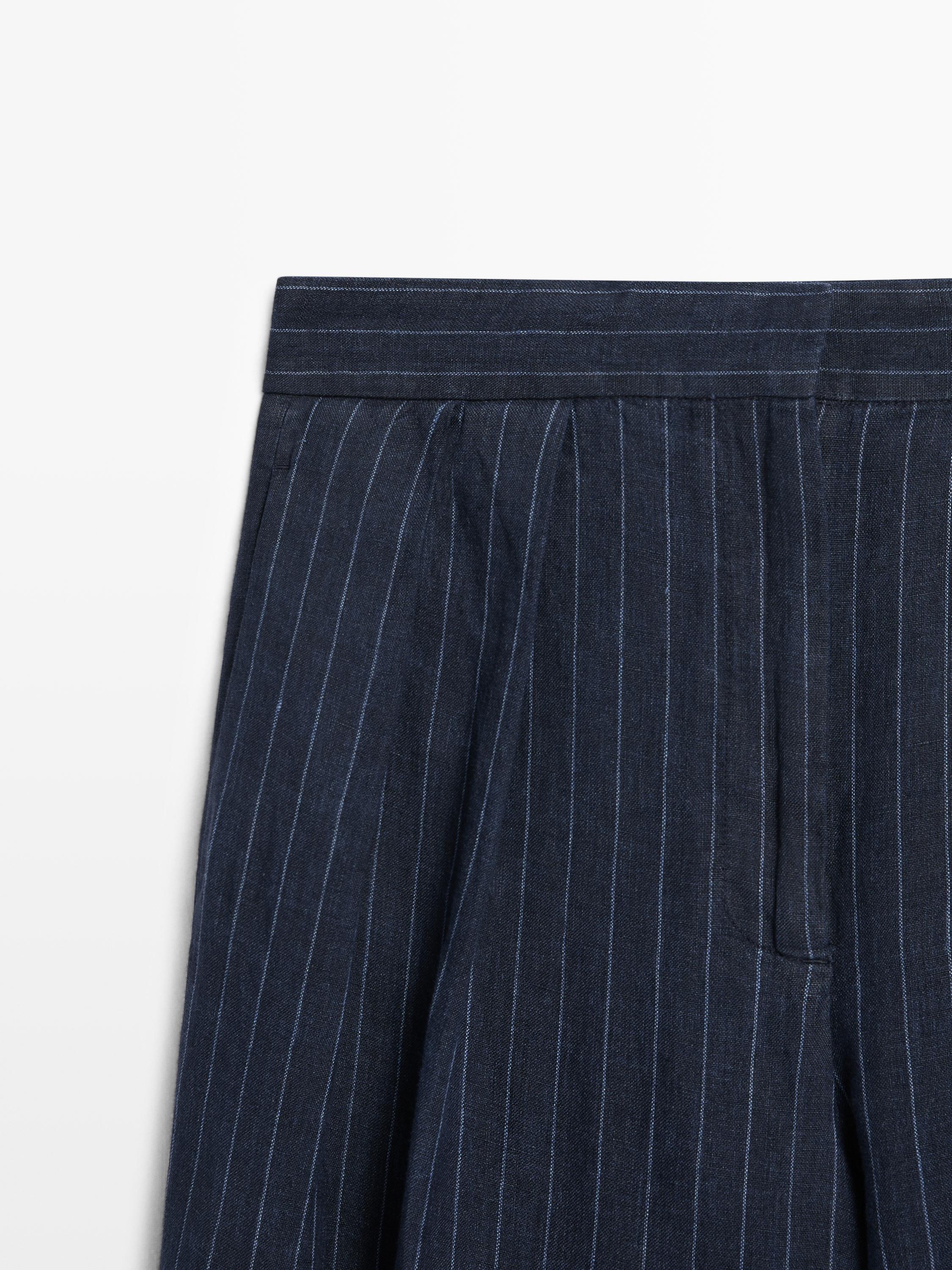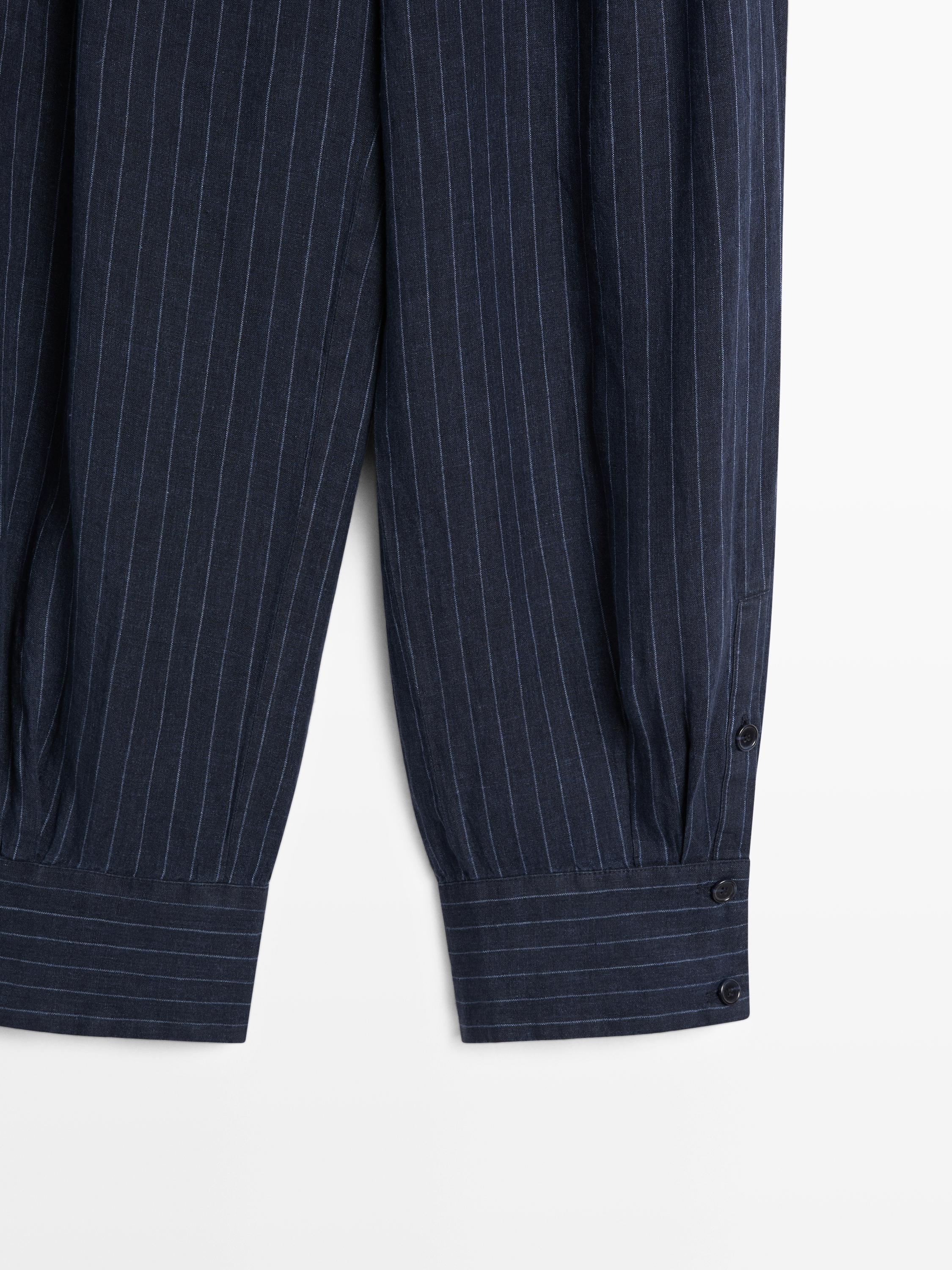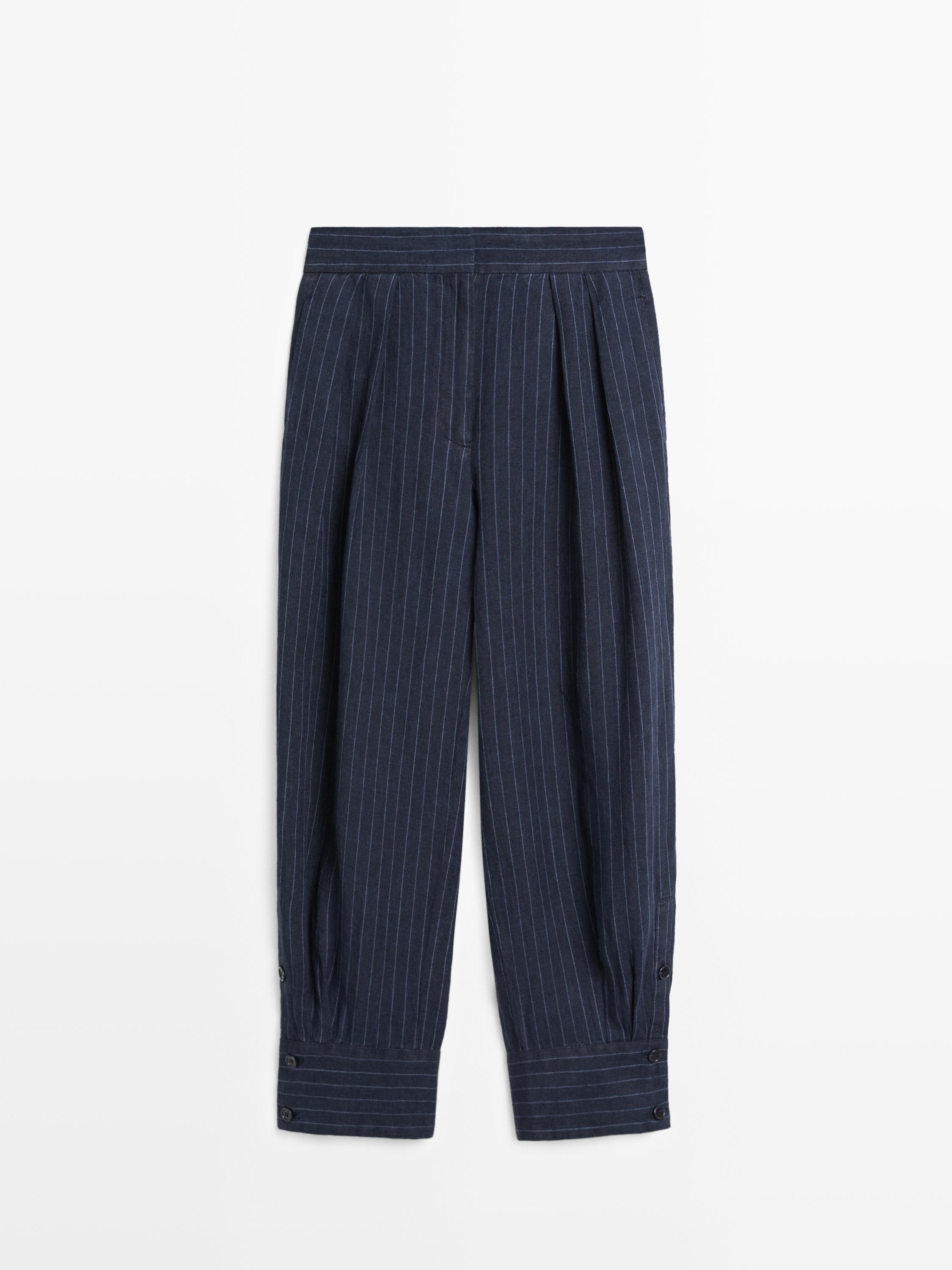 Брюки Sarouel: свободный силуэт, широкие штанины и облегающий крой до щиколотки. Скрытая застежка-молния, застежка на пуговицу, крючок и петля, а также внутренняя пуговица. Два боковых кармана. Два прорезных кармана сзади. Застежка на пуговицу внизу штанин. Вытачки спереди. Полосатый принт. В наличии аналогичная модель. Изготовлены из 100% льна.