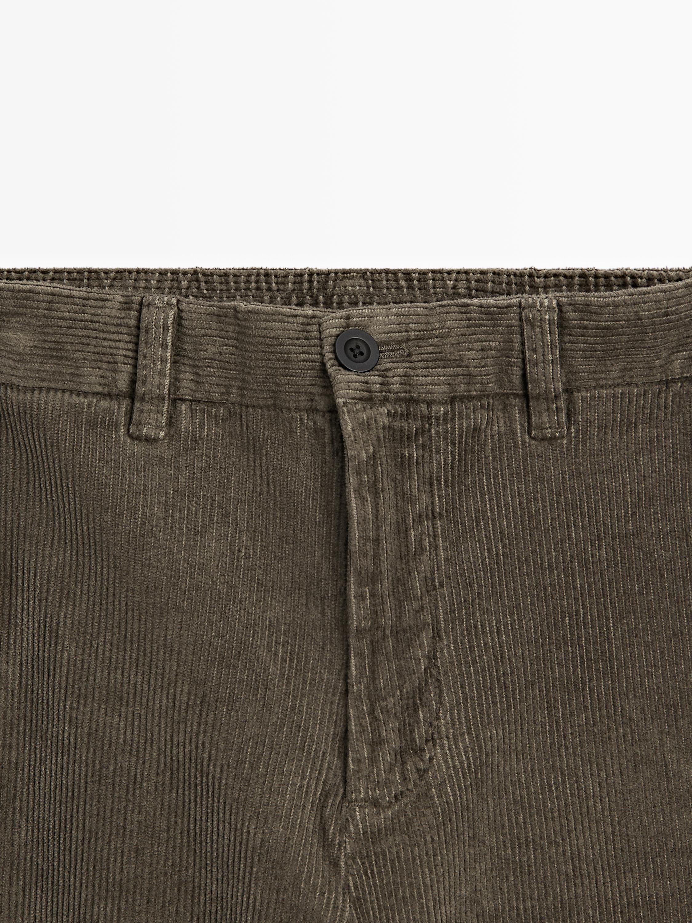 Брюки прямого кроя: прямой силуэт от талии до щиколотки, без дополнительной регулировки по длине штанин. Скрытая застежка-молния с клапаном, пуговицей и внутренней пуговицей. Эластичный пояс сзади. Два боковых кармана. Два прорезных кармана сзади. Вельветовая ткань.