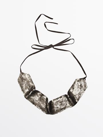 Пояс-лента из ткани, украшенной пайетками. Застежка в виде банта.
