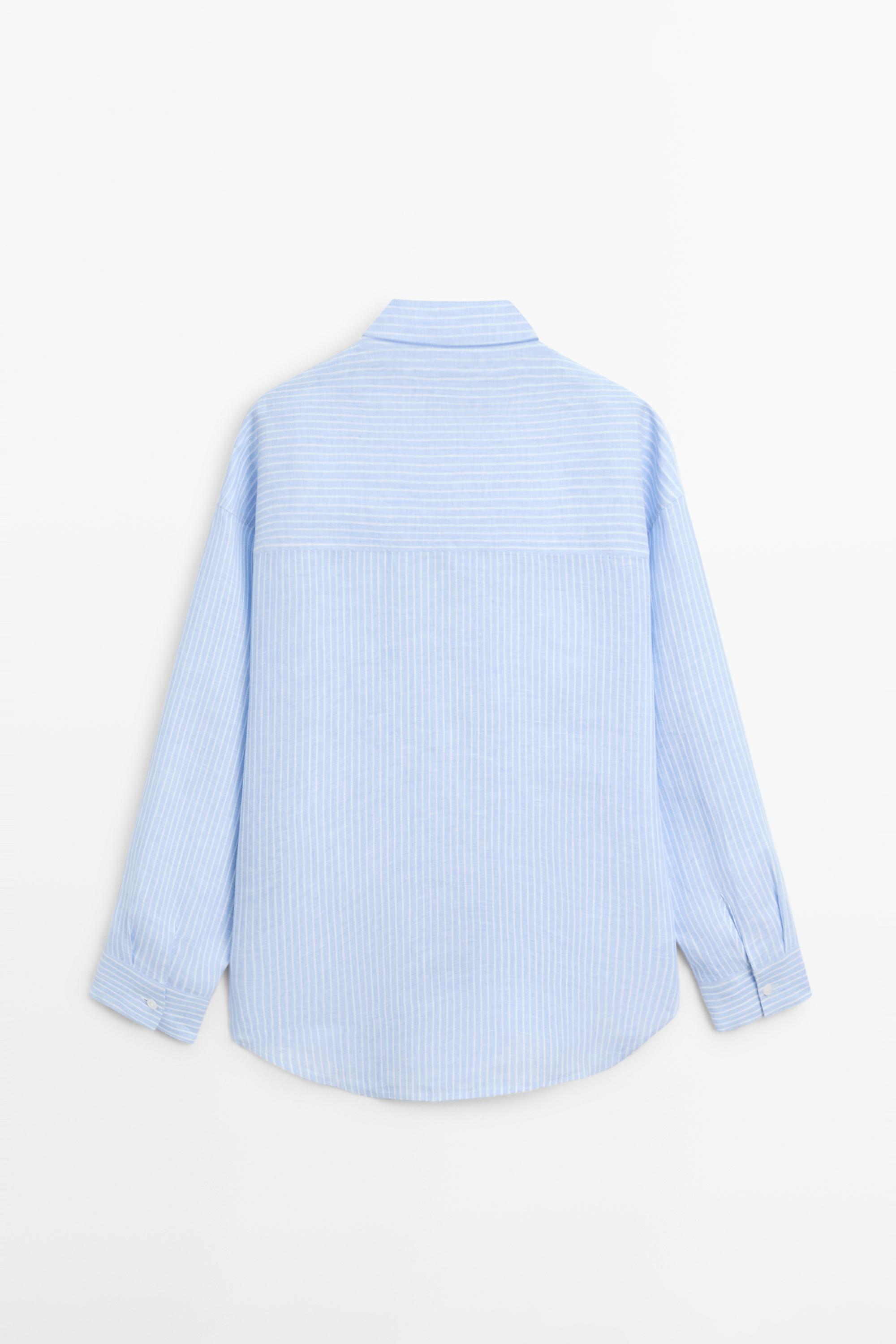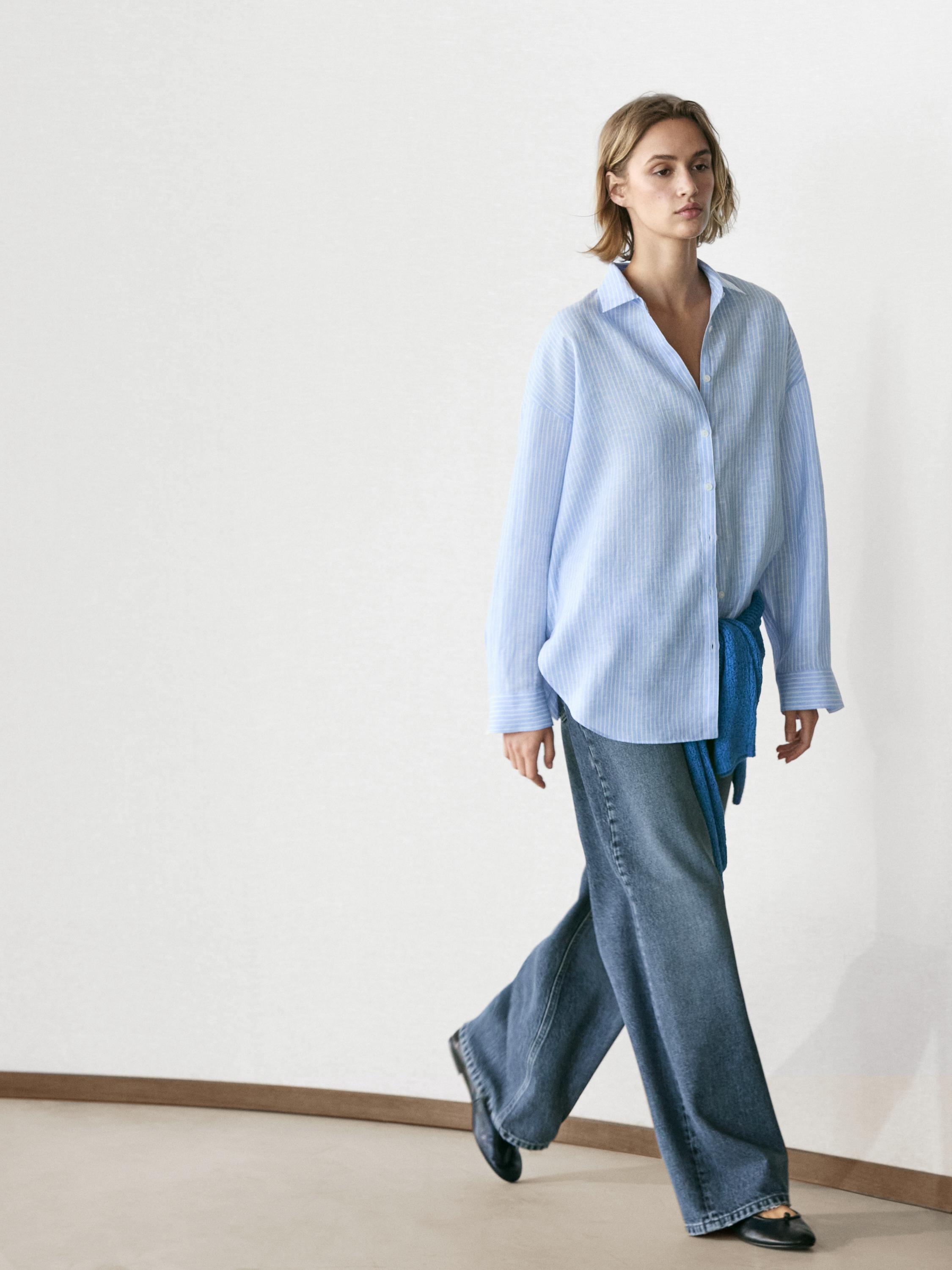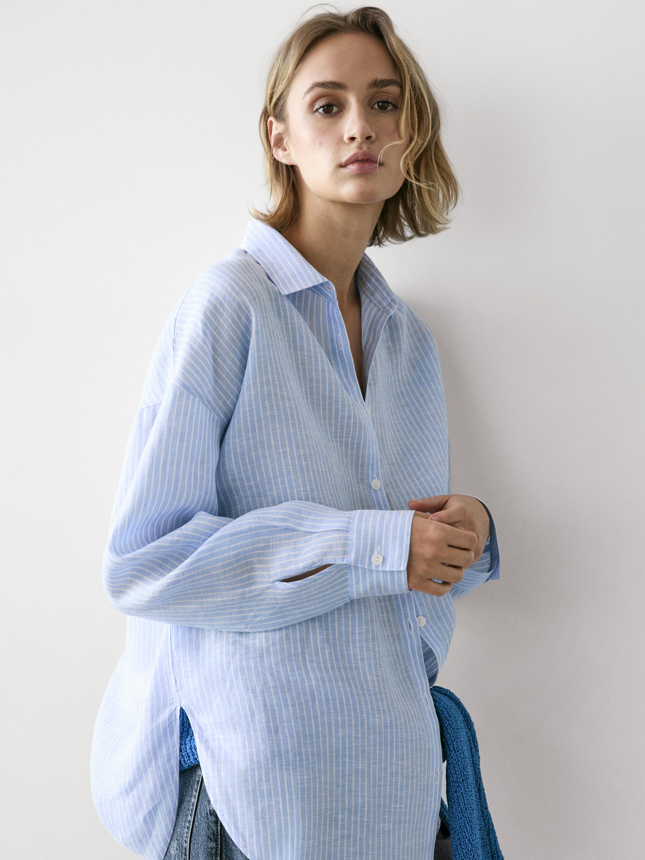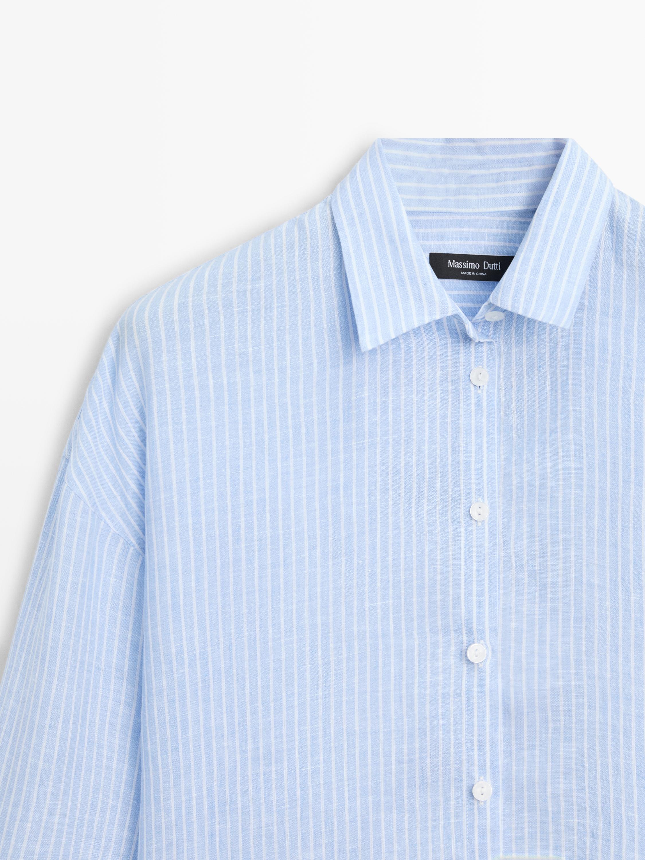 Massimo Dutti Рубашка из 100% льна в полоску с драпировкой, небесно-голубой