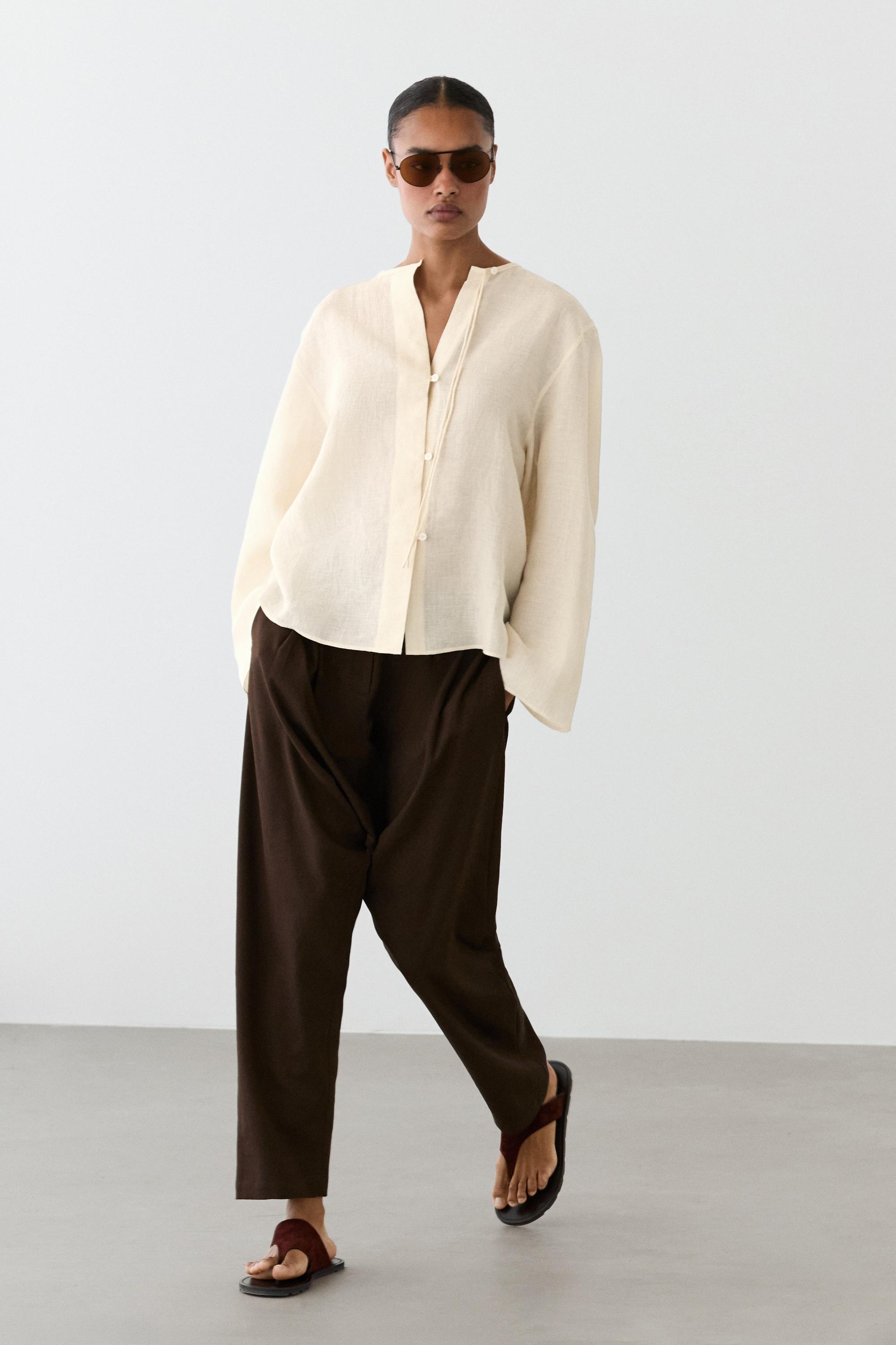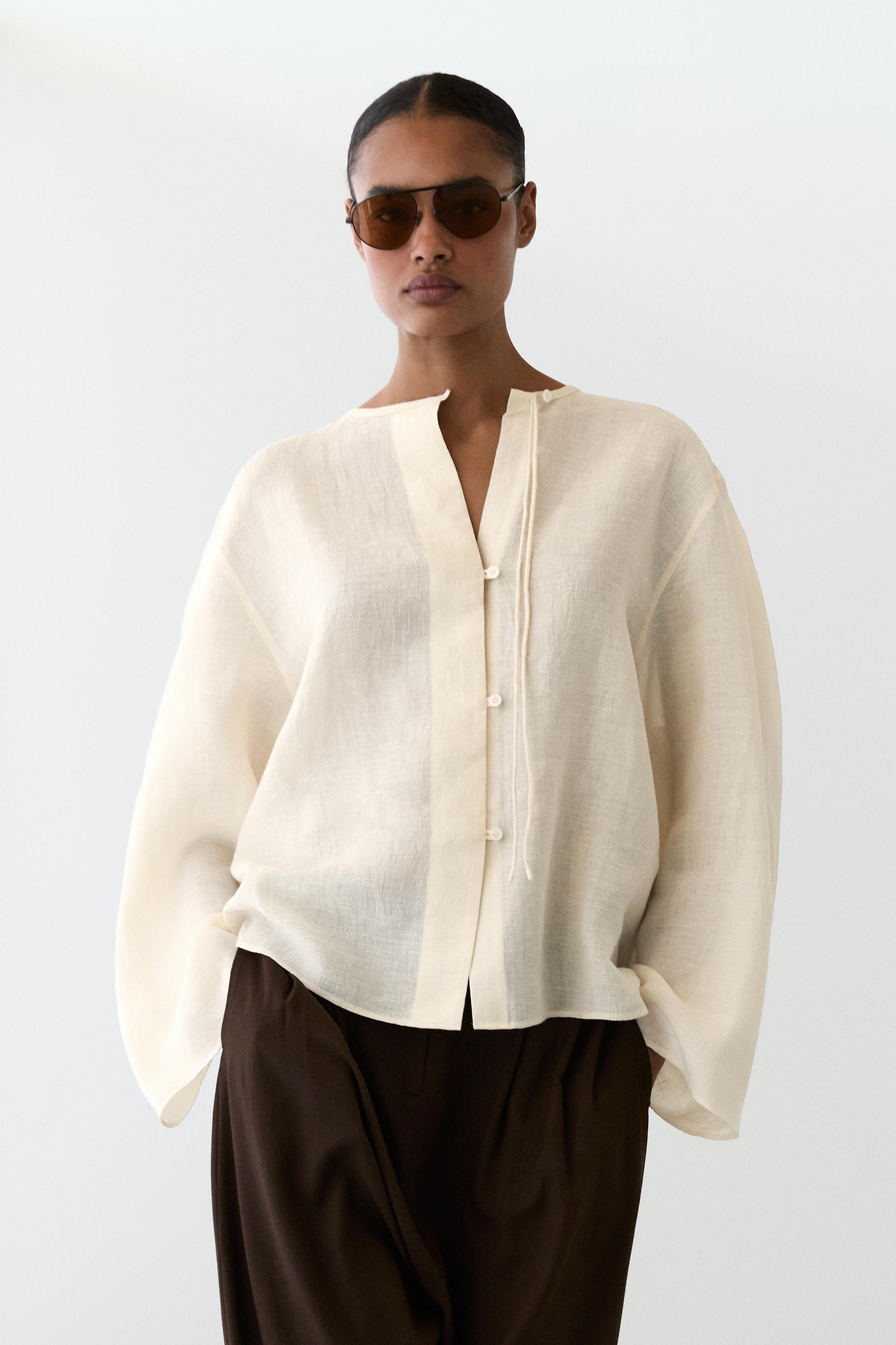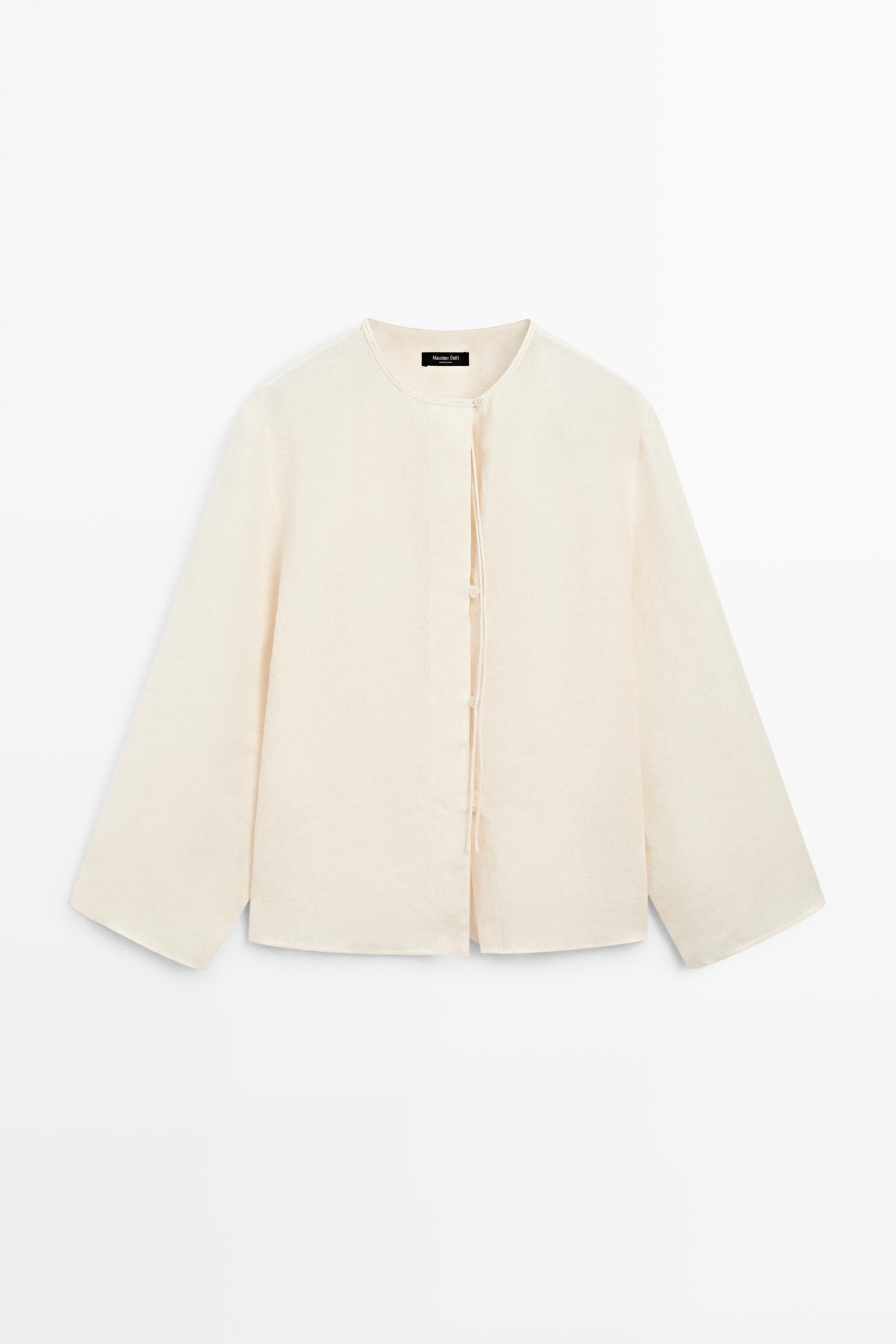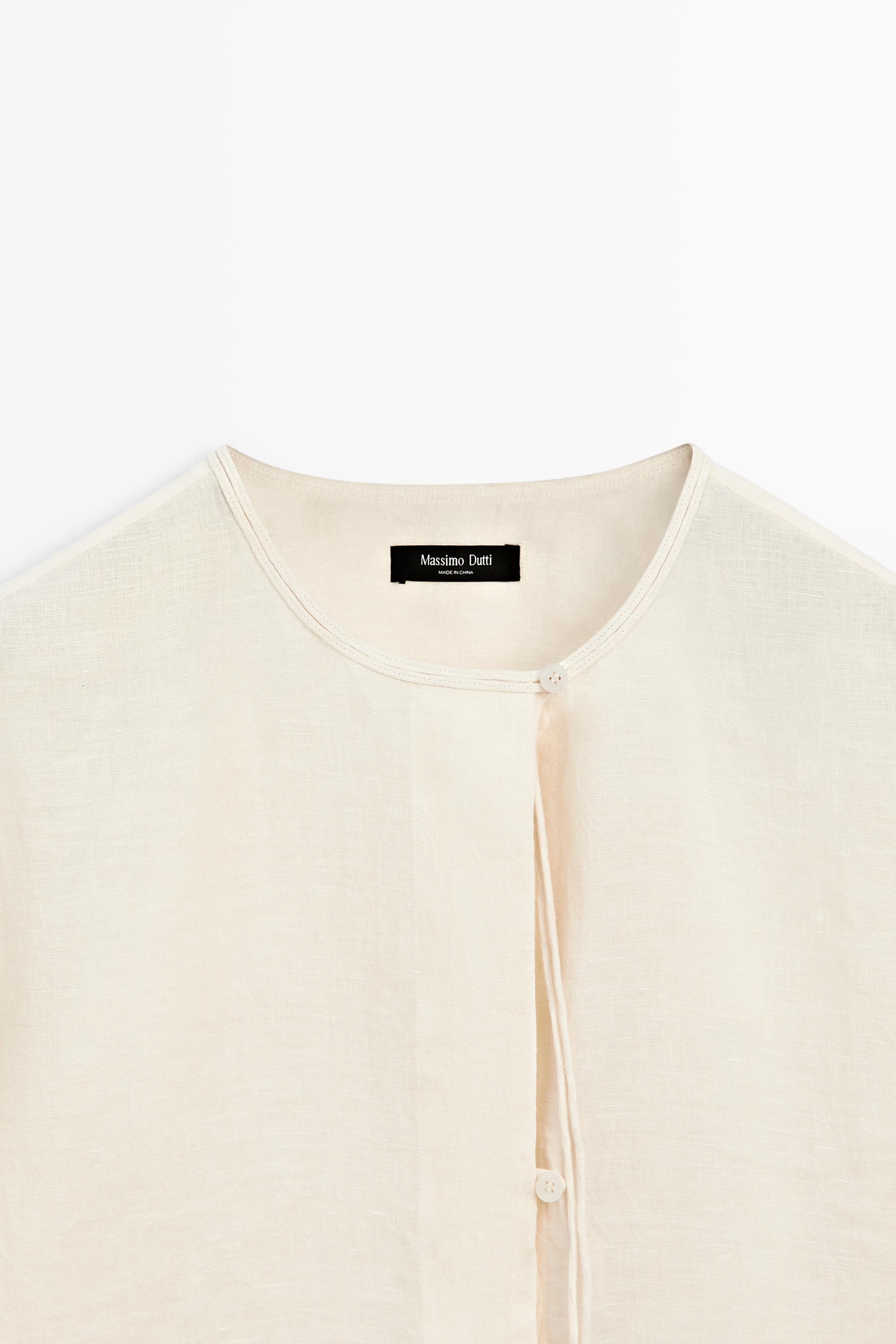Massimo Dutti Рубашка из 100% льняной ткани с вырезом, ванильный