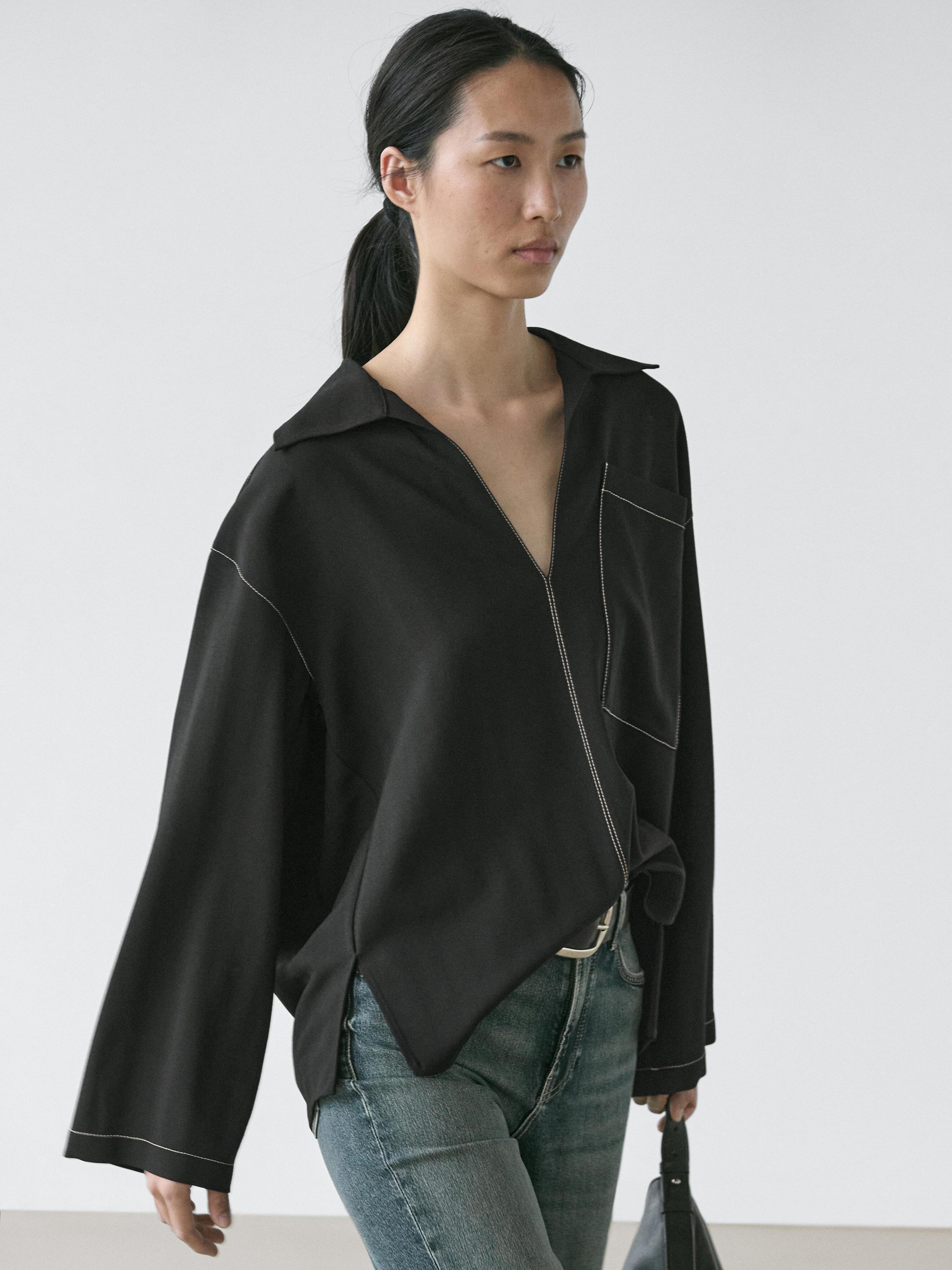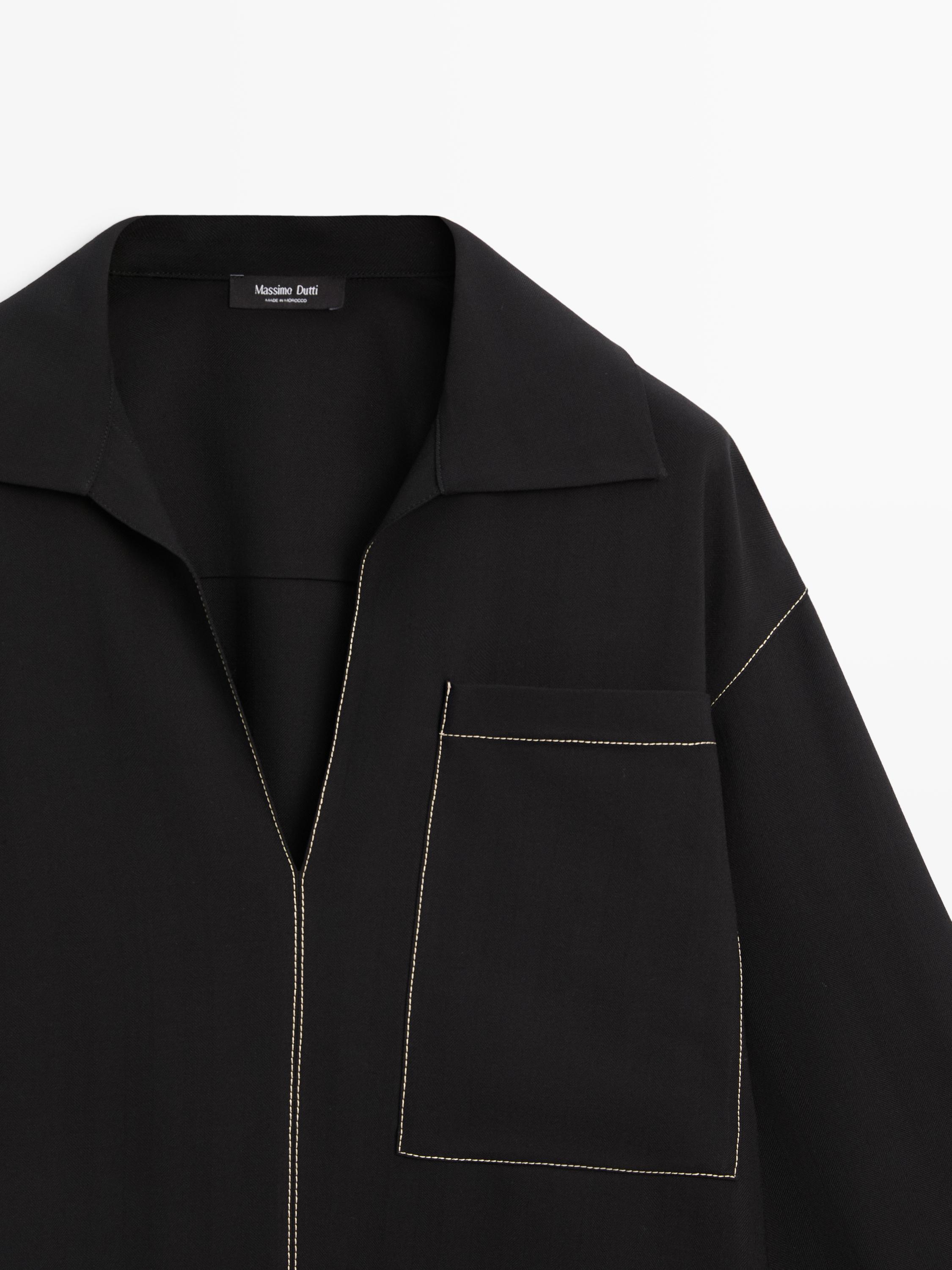 Massimo Dutti Рубашка из струящейся смесовой шерсти с карманом, черный