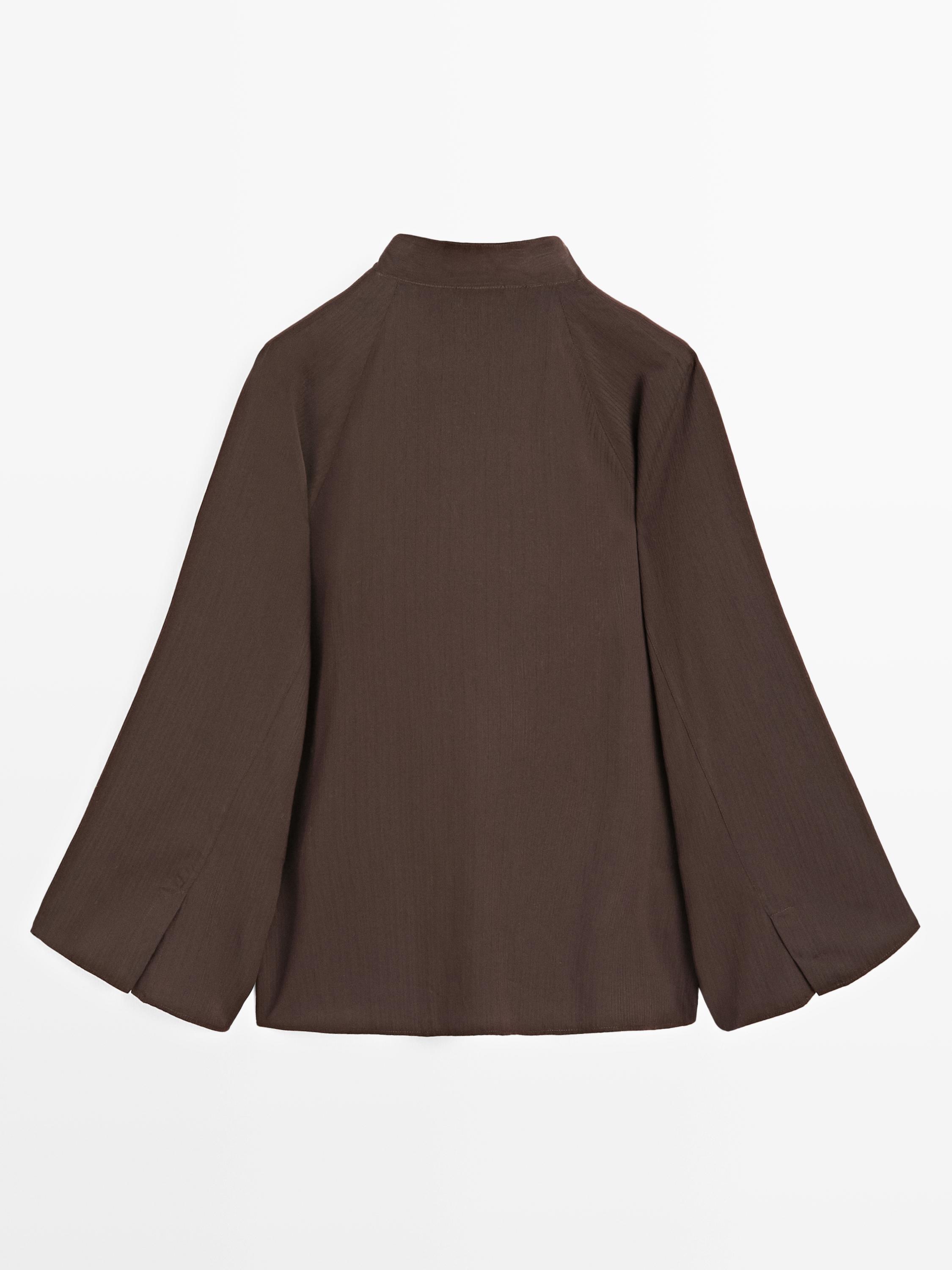Рукава реглан. Широкие рукава. Застежка на пуговицы спереди. Воротник-стойка. Текстурированная ткань.