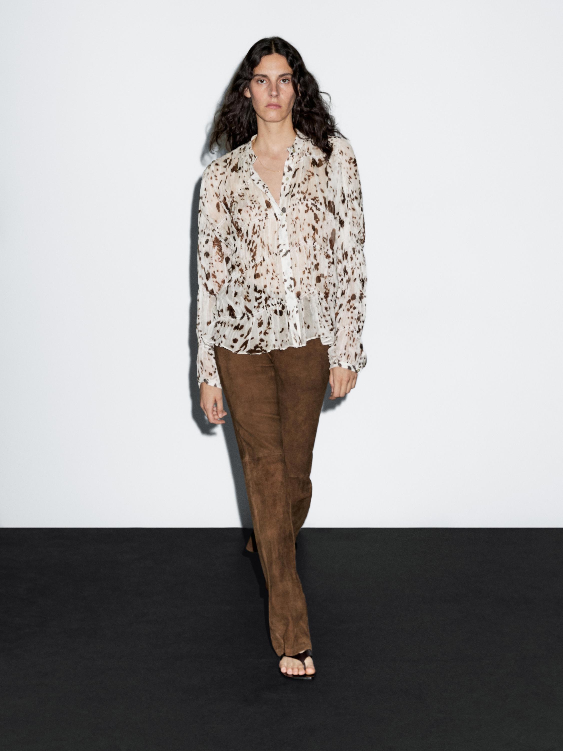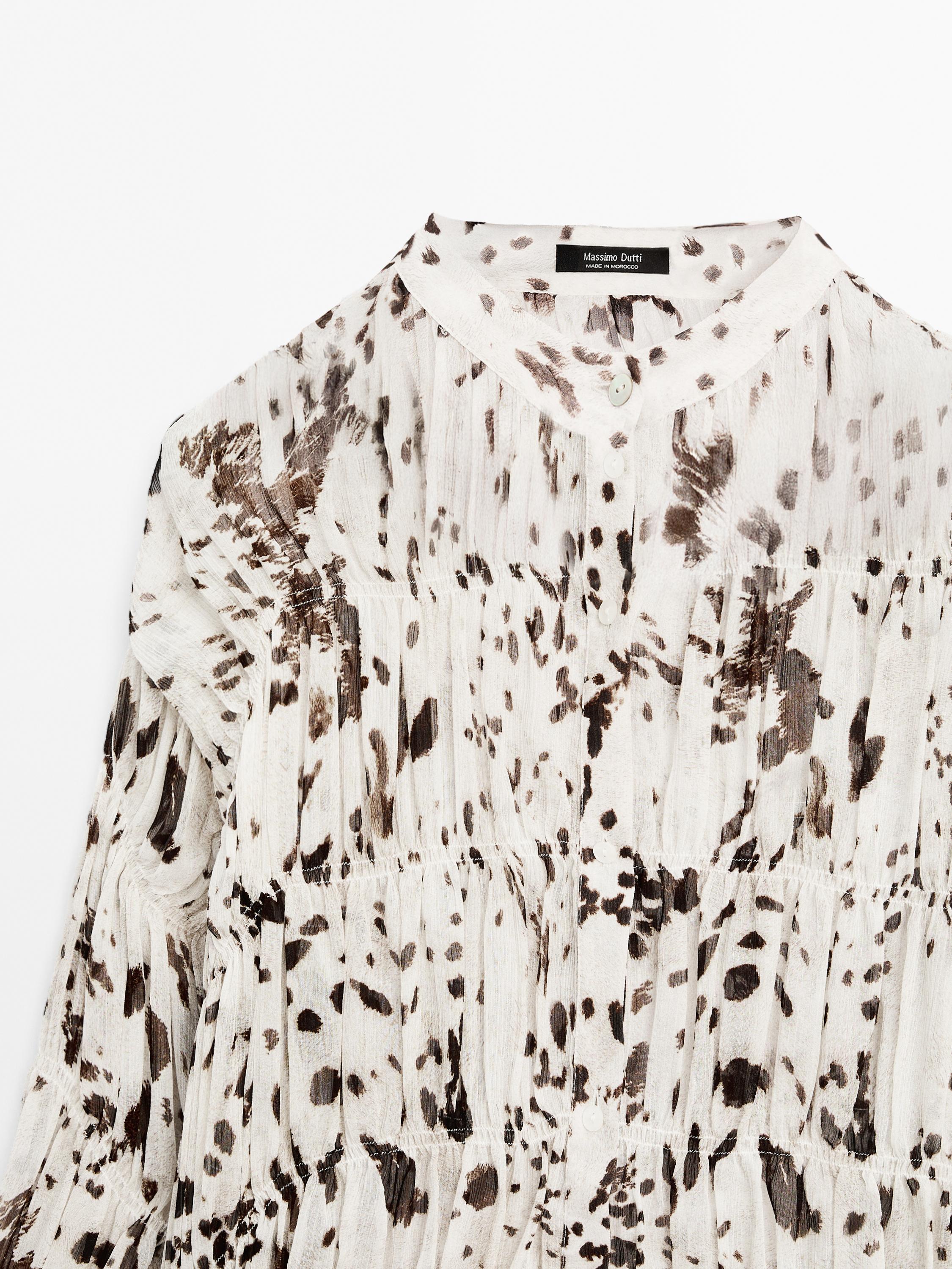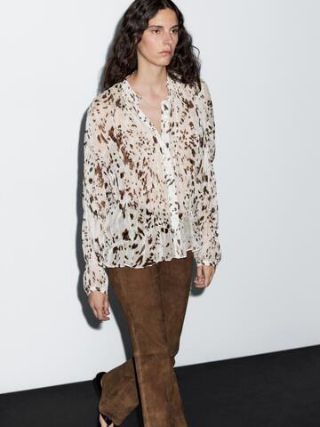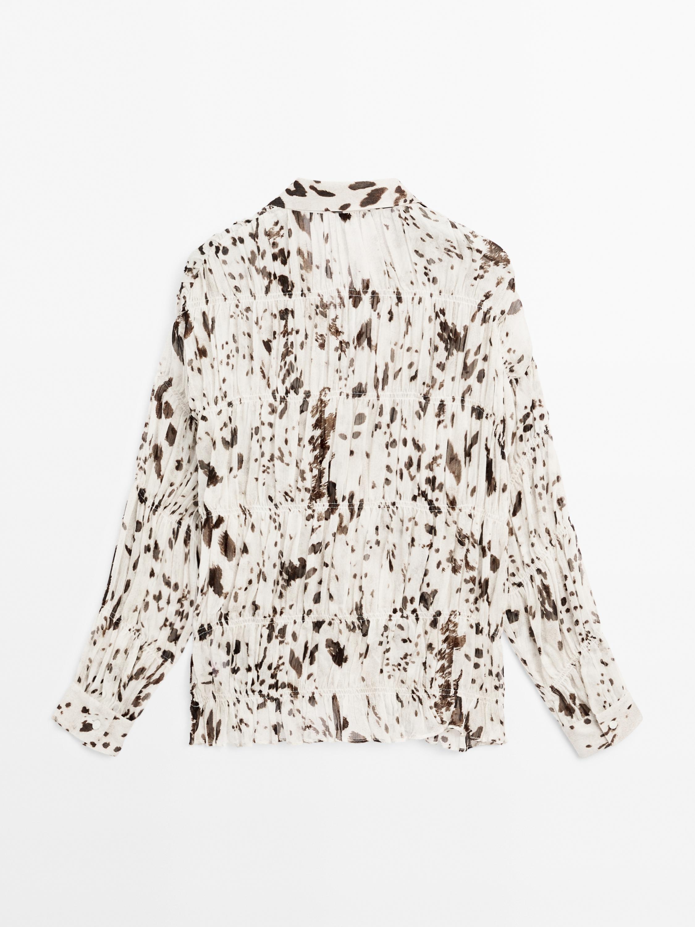 Драпированная рубашка с присборенной, мятой текстурой. Длинные рукава с манжетами на пуговицах. Рубашечный воротник. Полупрозрачная ткань.