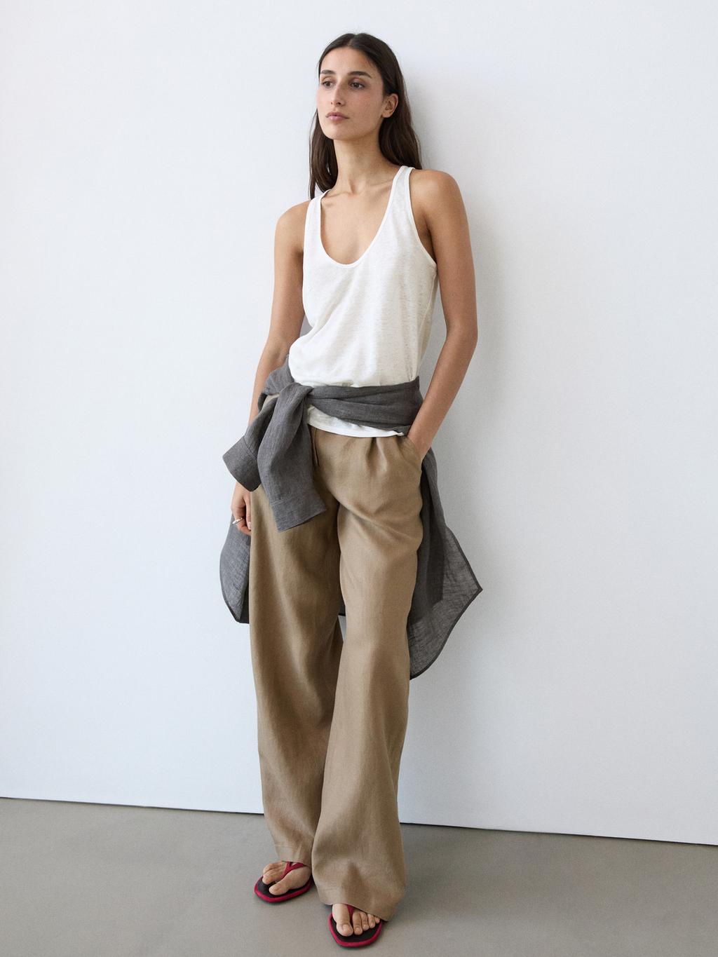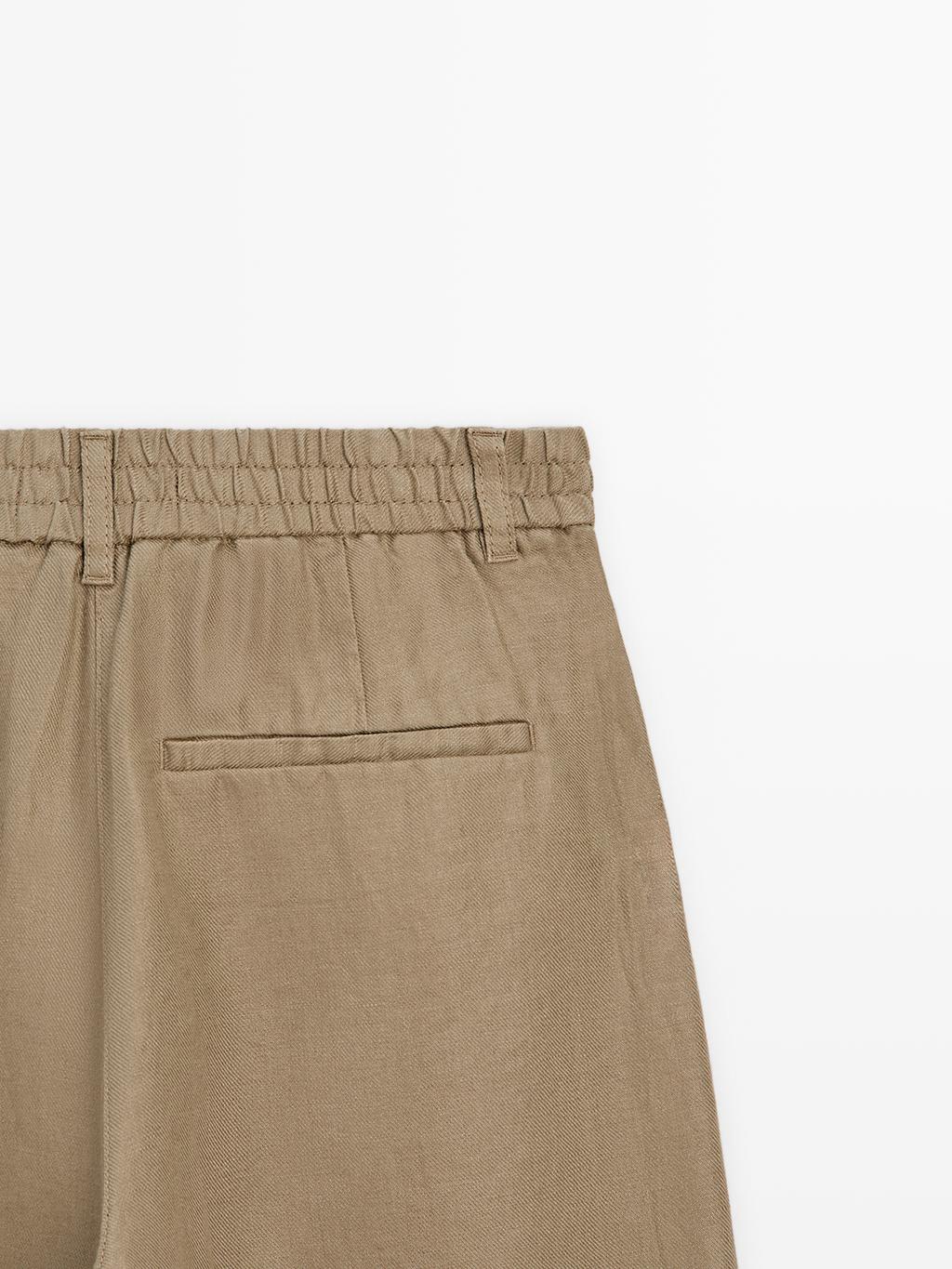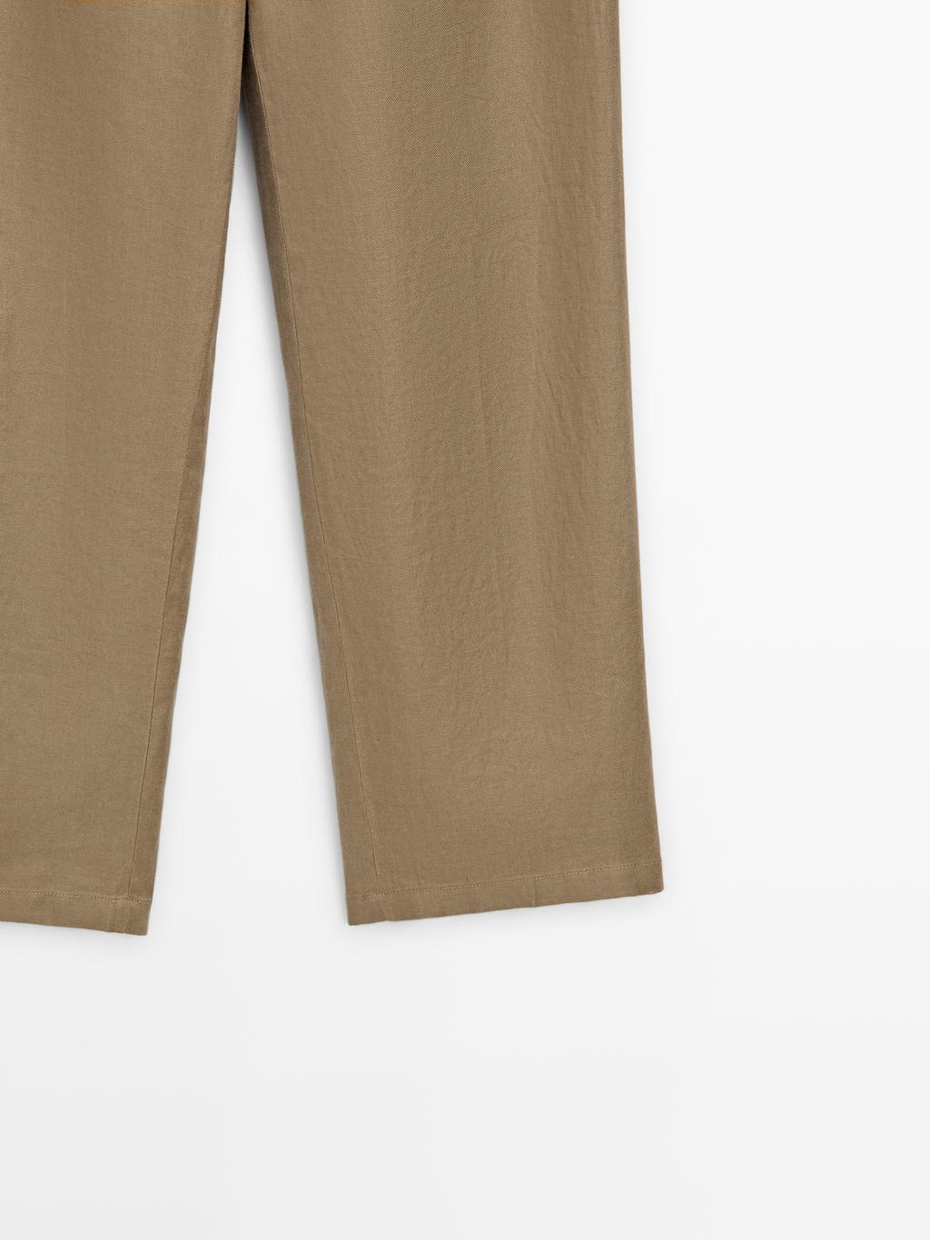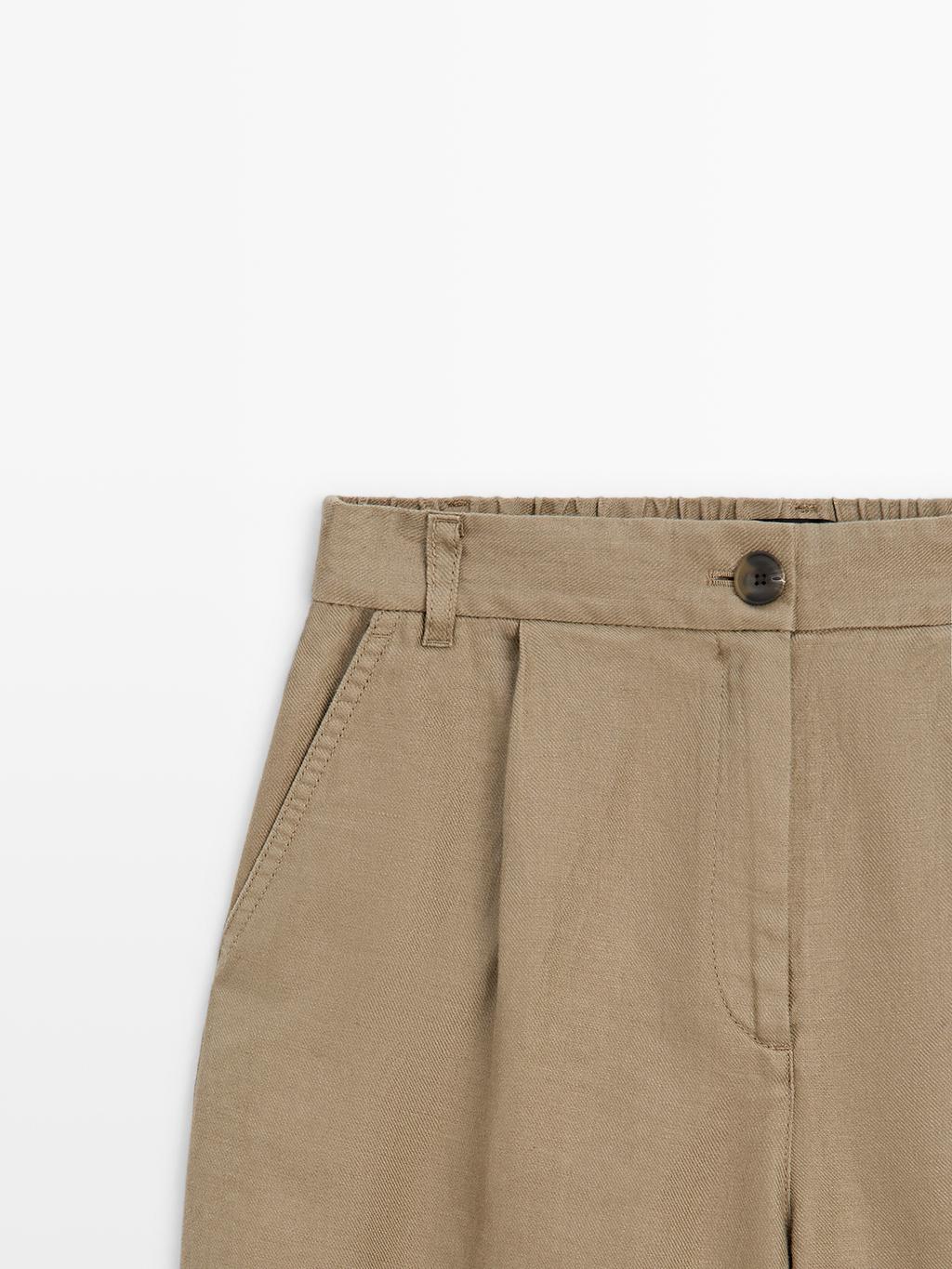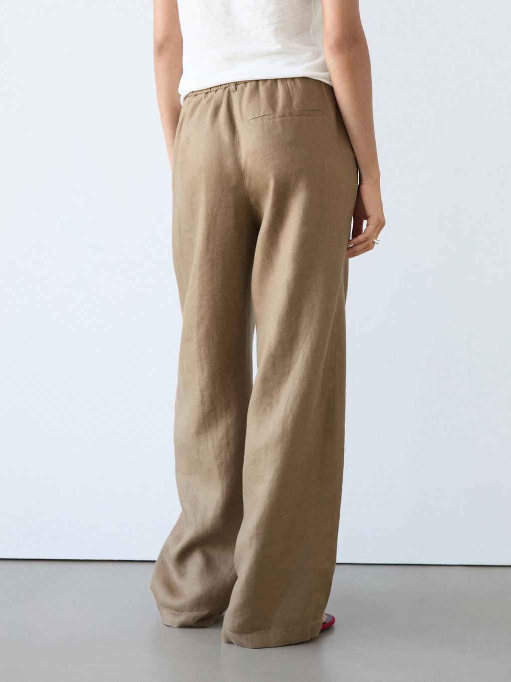 Брюки с широкими штанинами: этот крой отличается широким и свободным силуэтом от бедра до щиколотки, обеспечивая комфорт. Застежка на молнию спереди и пуговицу сверху. Эластичный пояс сзади. Два боковых кармана. Один прорезной карман сзади. Вытачки спереди. Изготовлены из 100% льна.