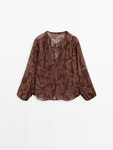 Блузка из фактурной струящейся ткани. Длинные рукава. Разрез спереди. Узор пейсли. V-образный вырез на шнуровке. Полупрозрачная ткань.