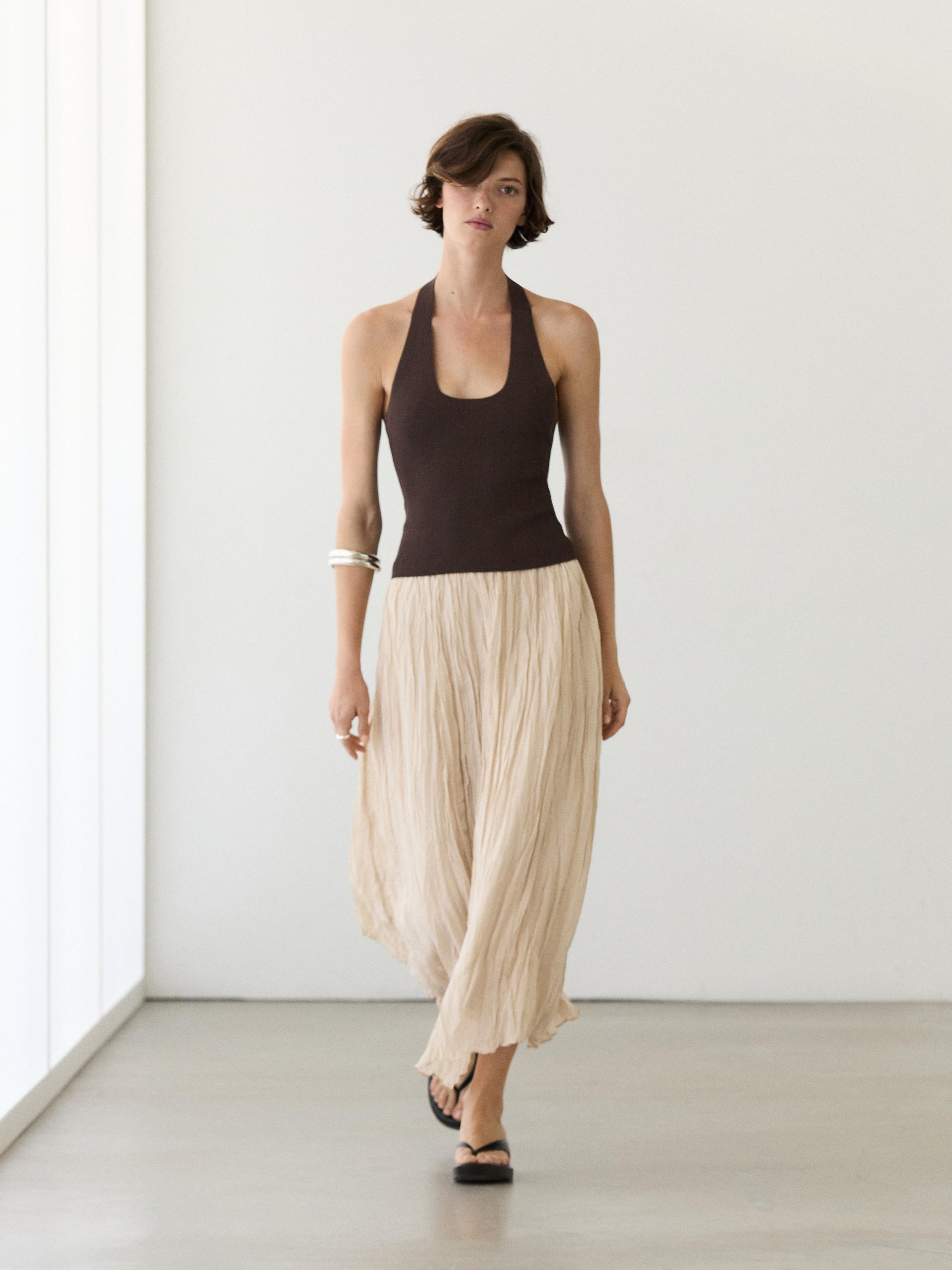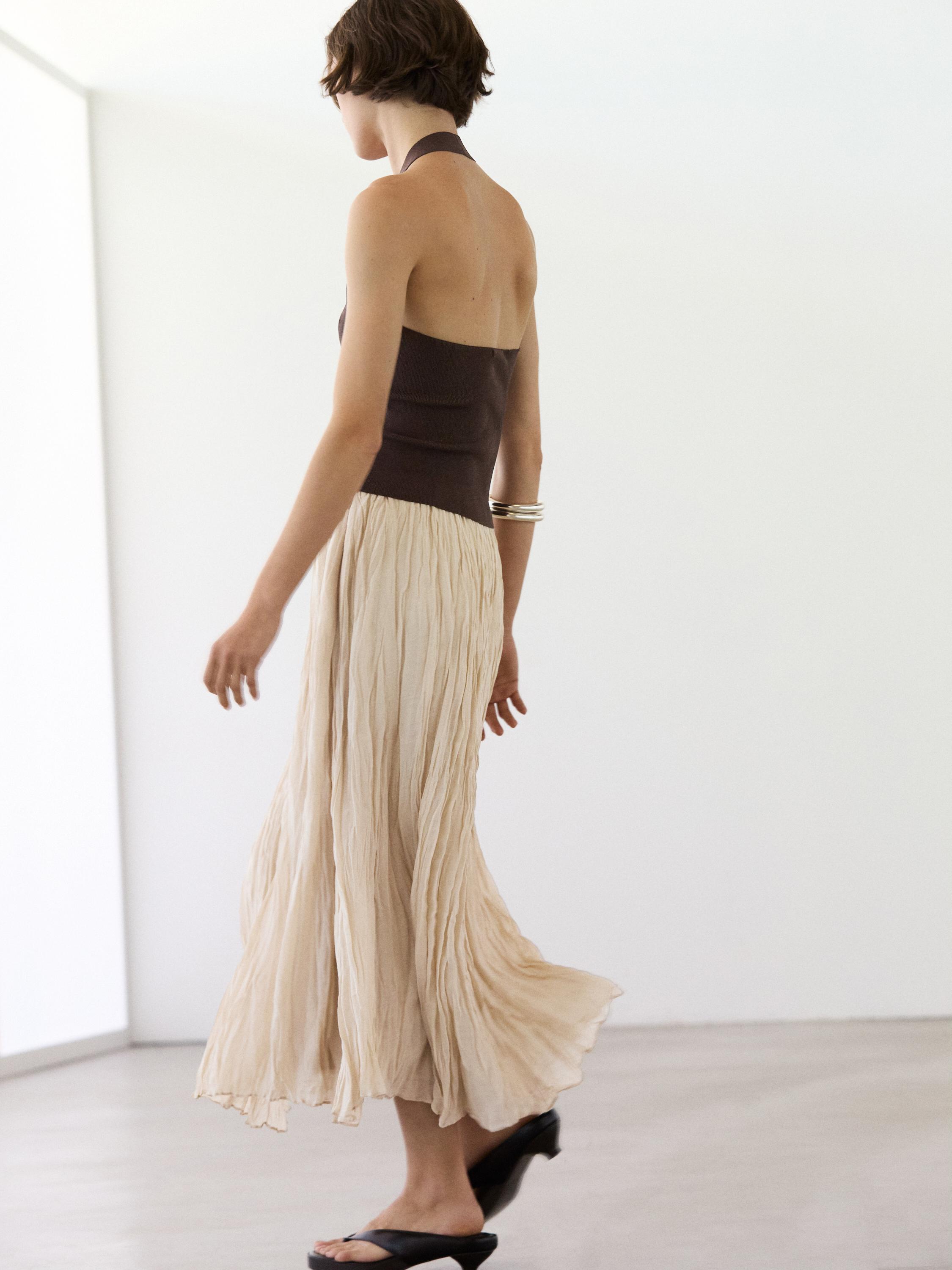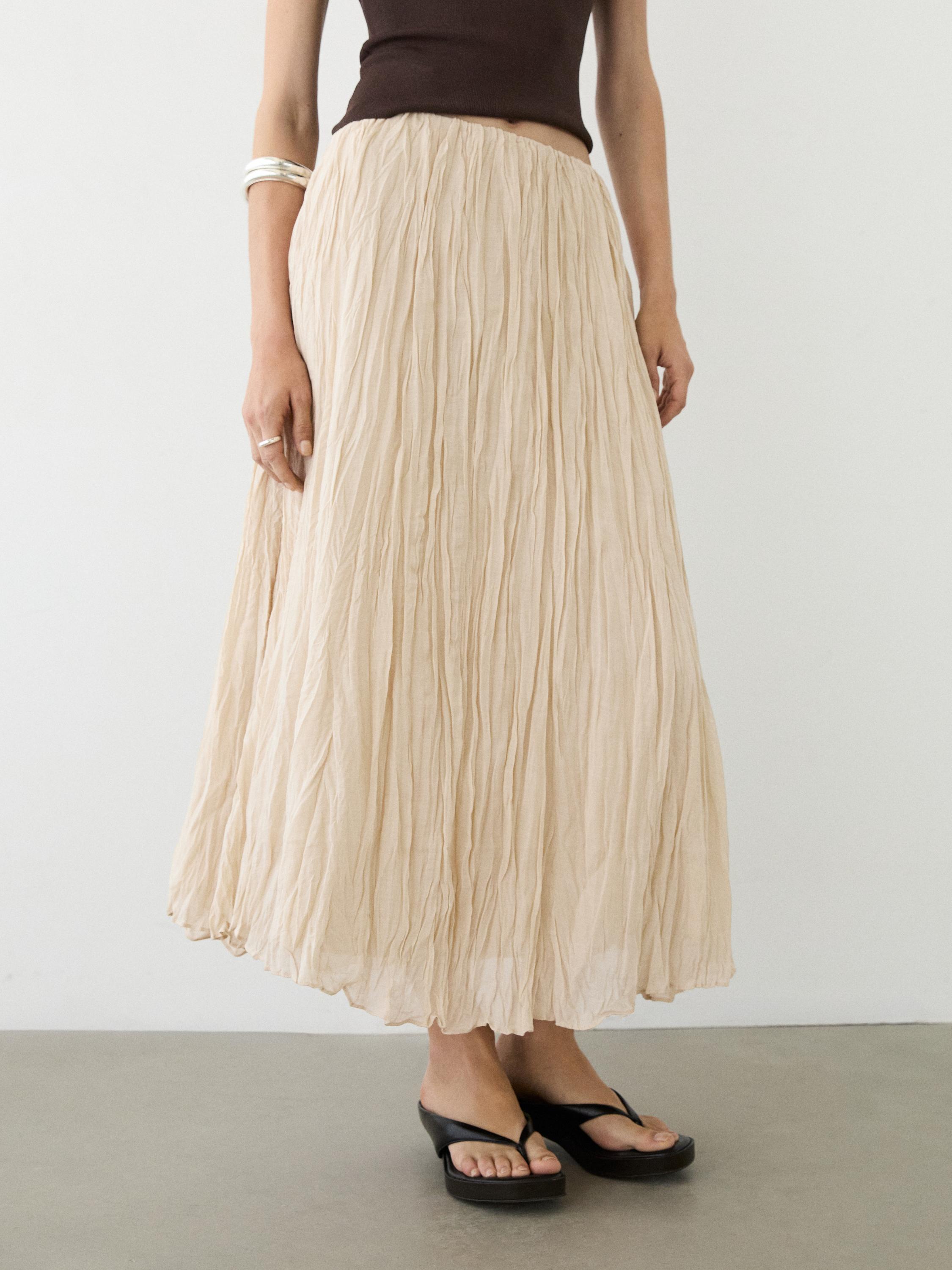 Плиссированная юбка миди. Эластичный пояс. Хлопковая подкладка. Изготовлена из смесовой ткани рами.