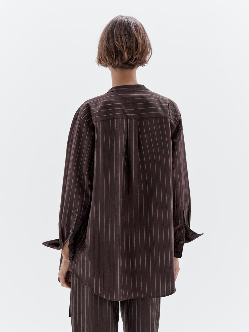 Струящееся кимоно со шнуровкой. Длинные рукава с манжетами на пуговицах. Воротник-стойка с V-образным вырезом. Полосатый принт. Доступна подходящая модель.