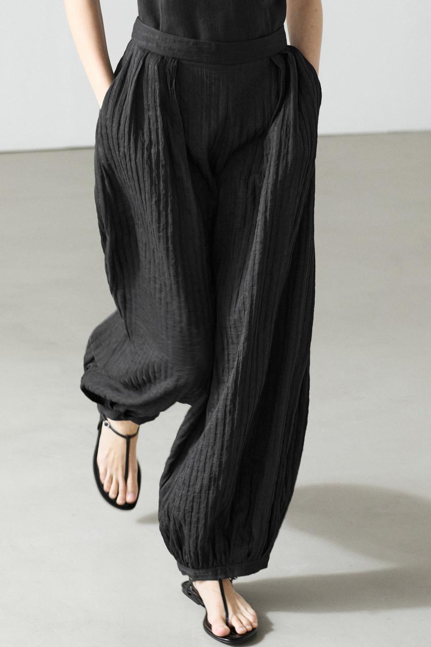 Брюки Sarouel: свободный силуэт, широкие штанины и облегающая щиколотка. Два боковых кармана. Складки спереди. В наличии аналогичная модель.