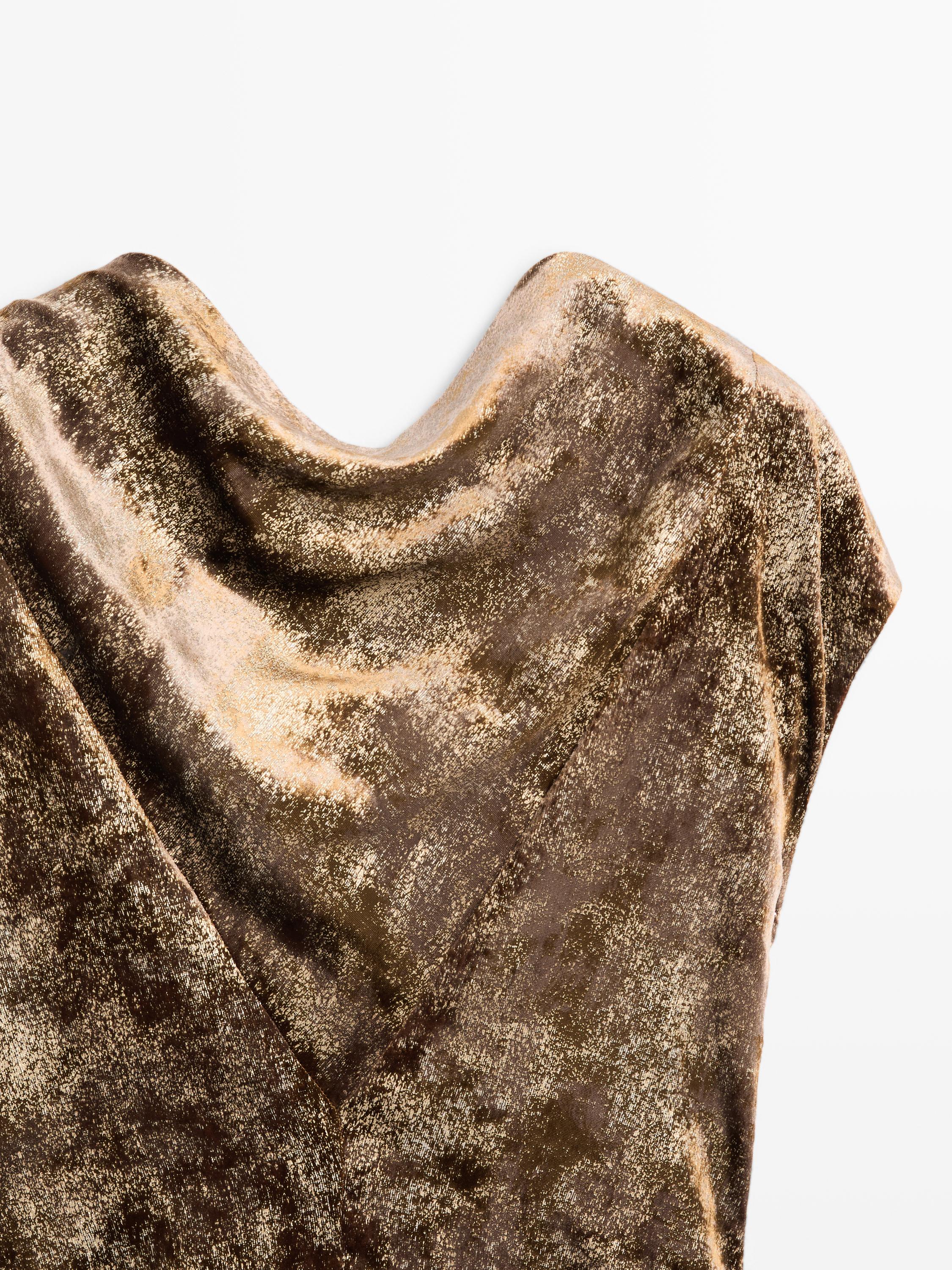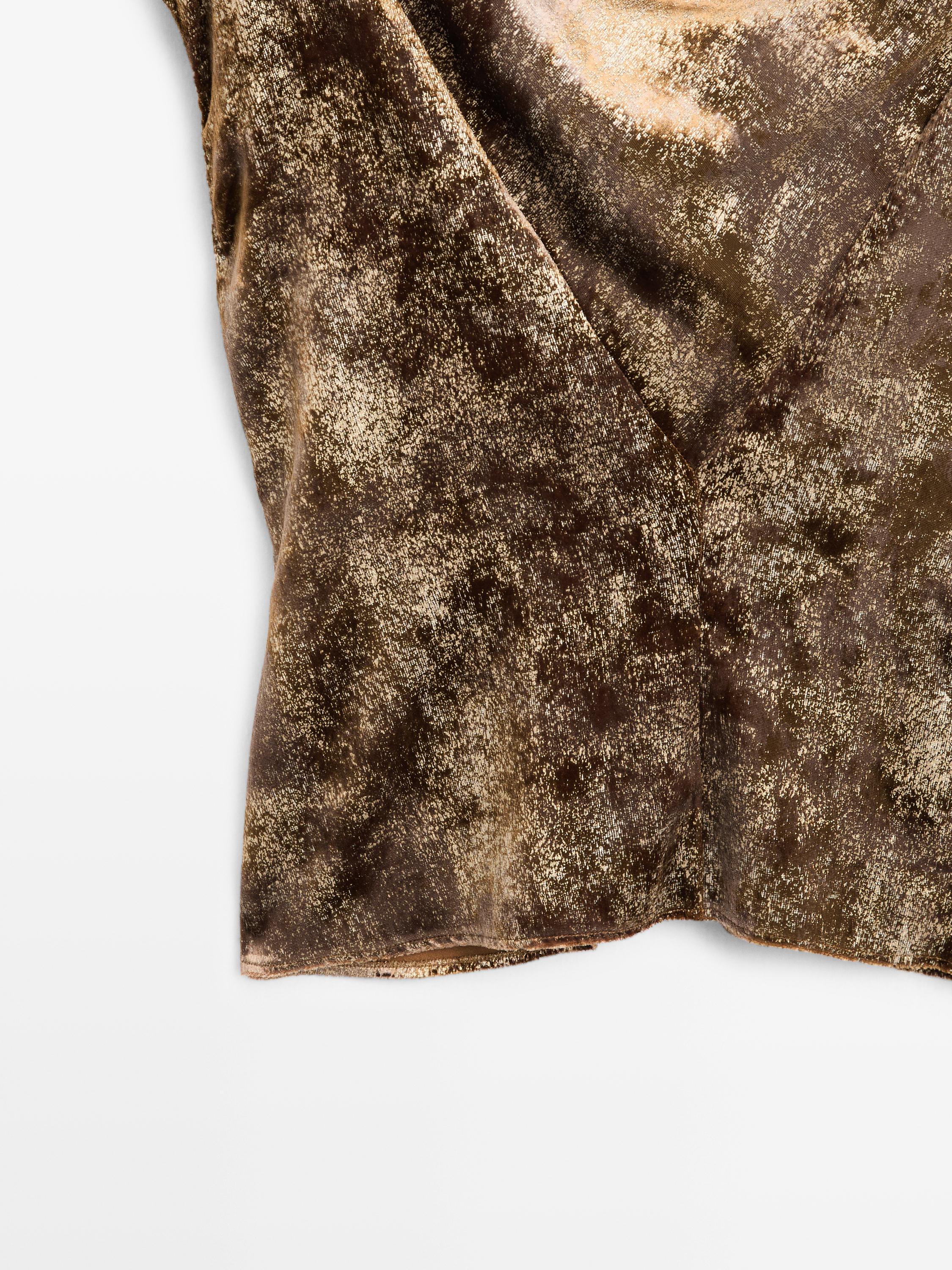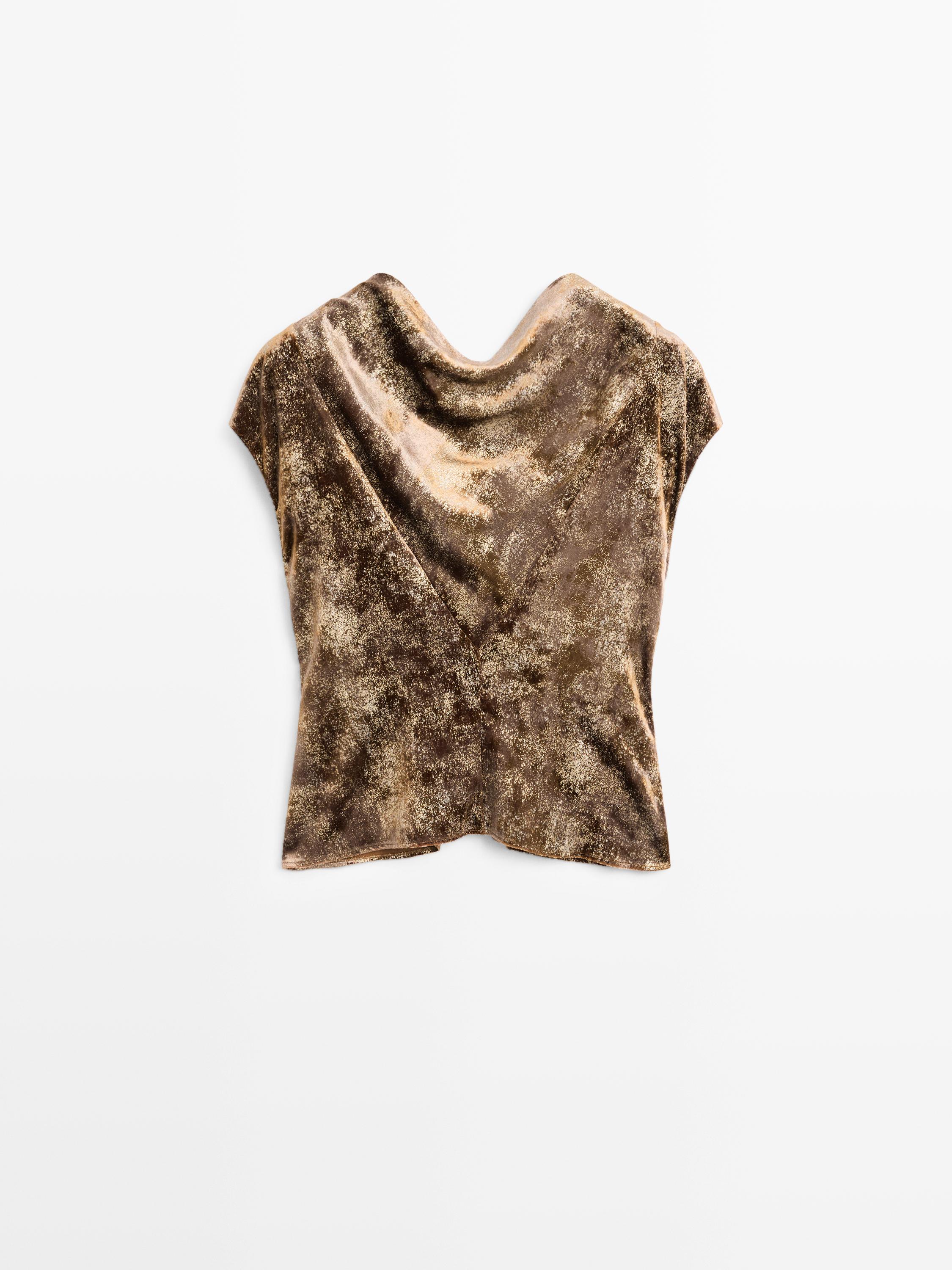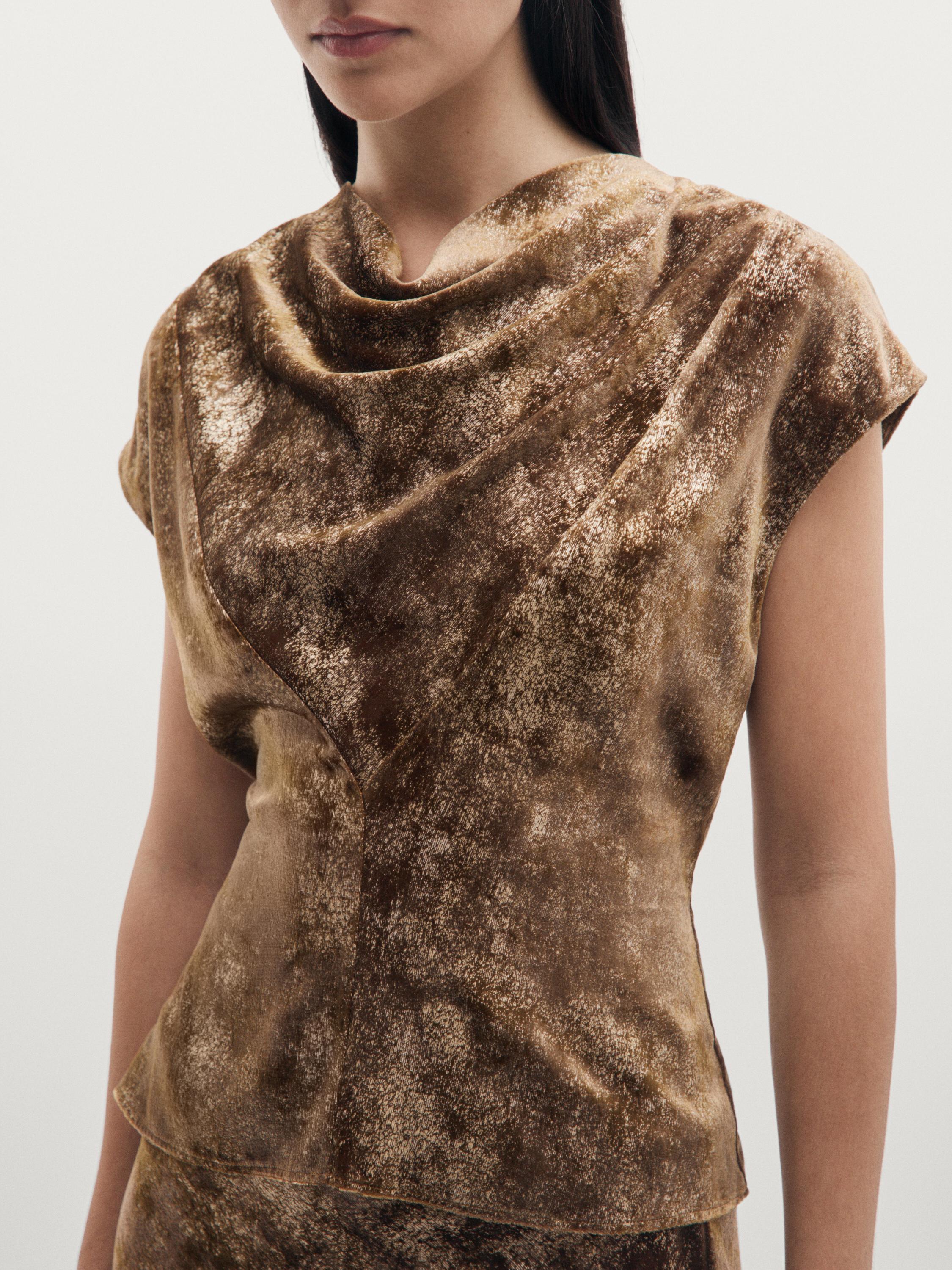 Топ с драпированным воротником из струящейся ткани. Без рукавов. Бархатная ткань. Металлическая отделка. Застежка-молния сзади.