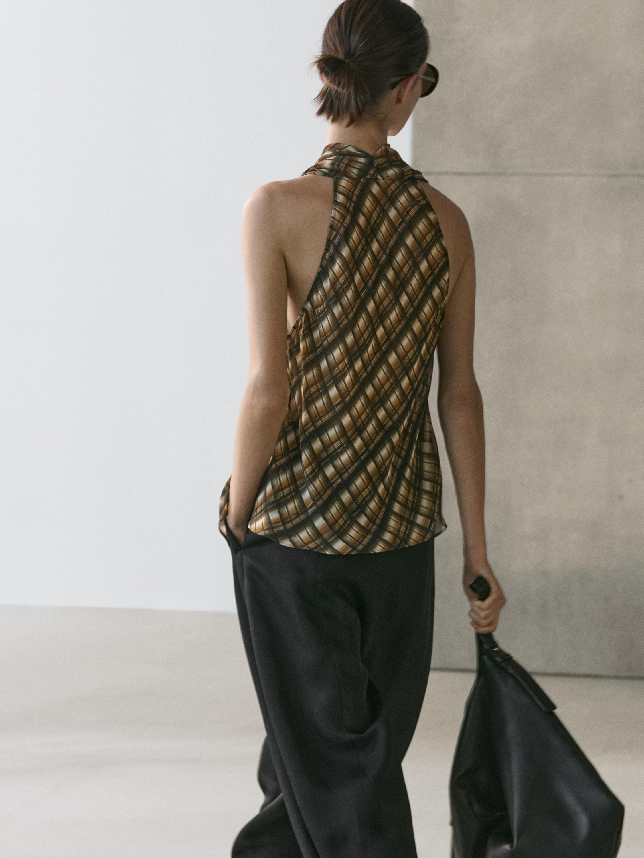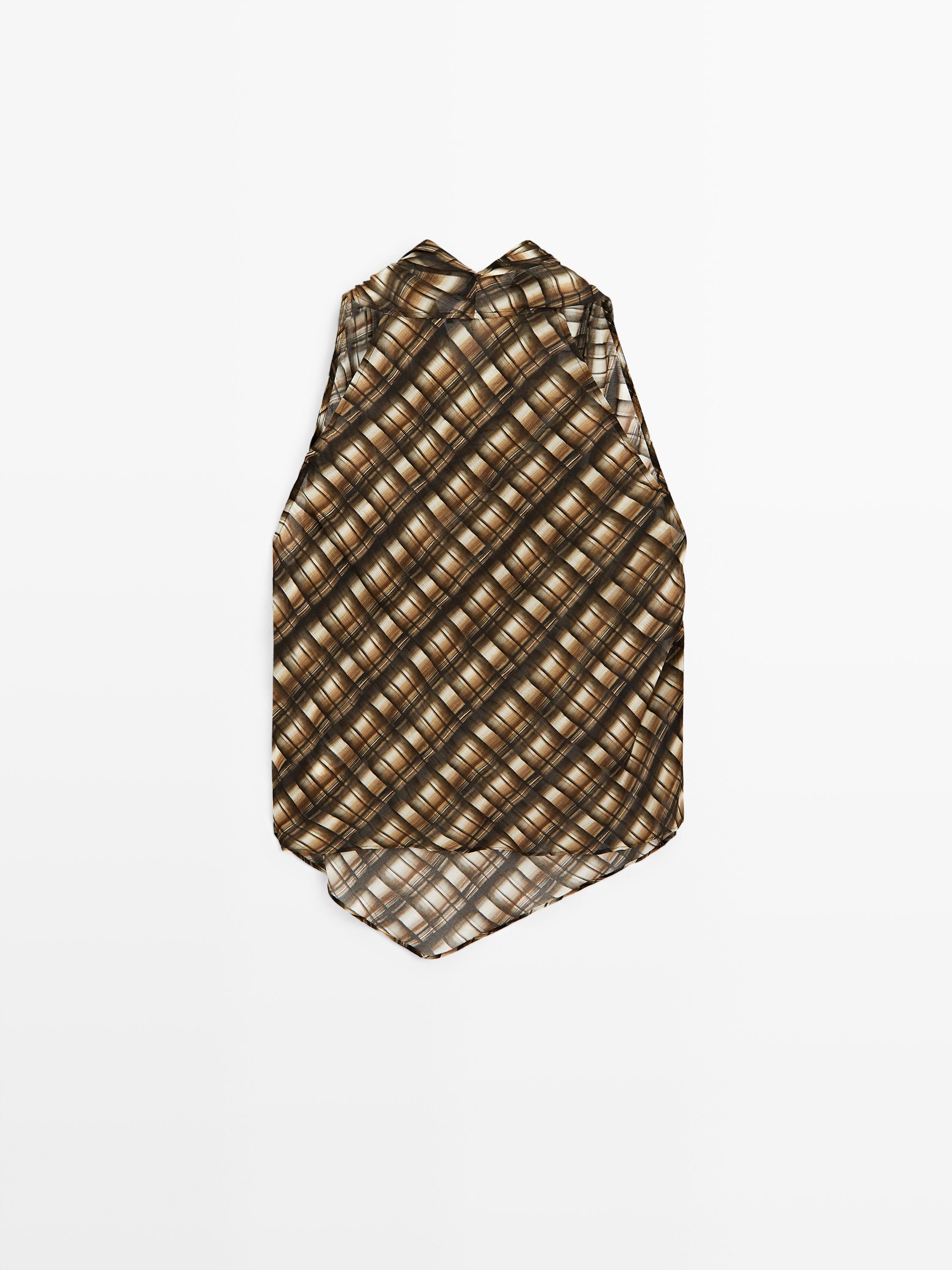 Топ со сборкой . Круглый вырез со сборкой. Без рукавов. В клетку.