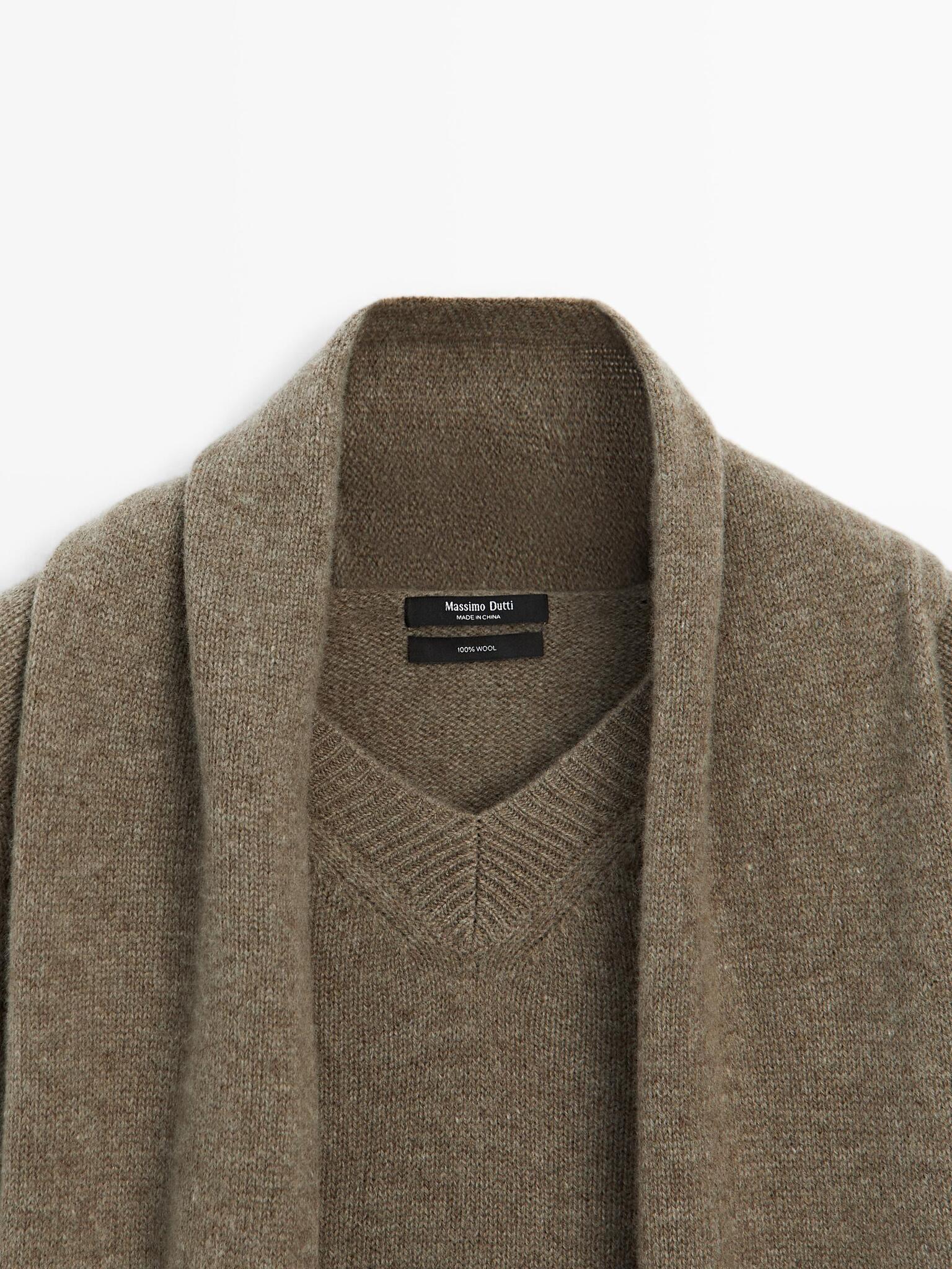 Свитер из 100% шерсти . V-образный вырез. Рукав реглан. Съемный шарф. Детали в рубчик . Широкий и свободный силуэт, не облегающий.