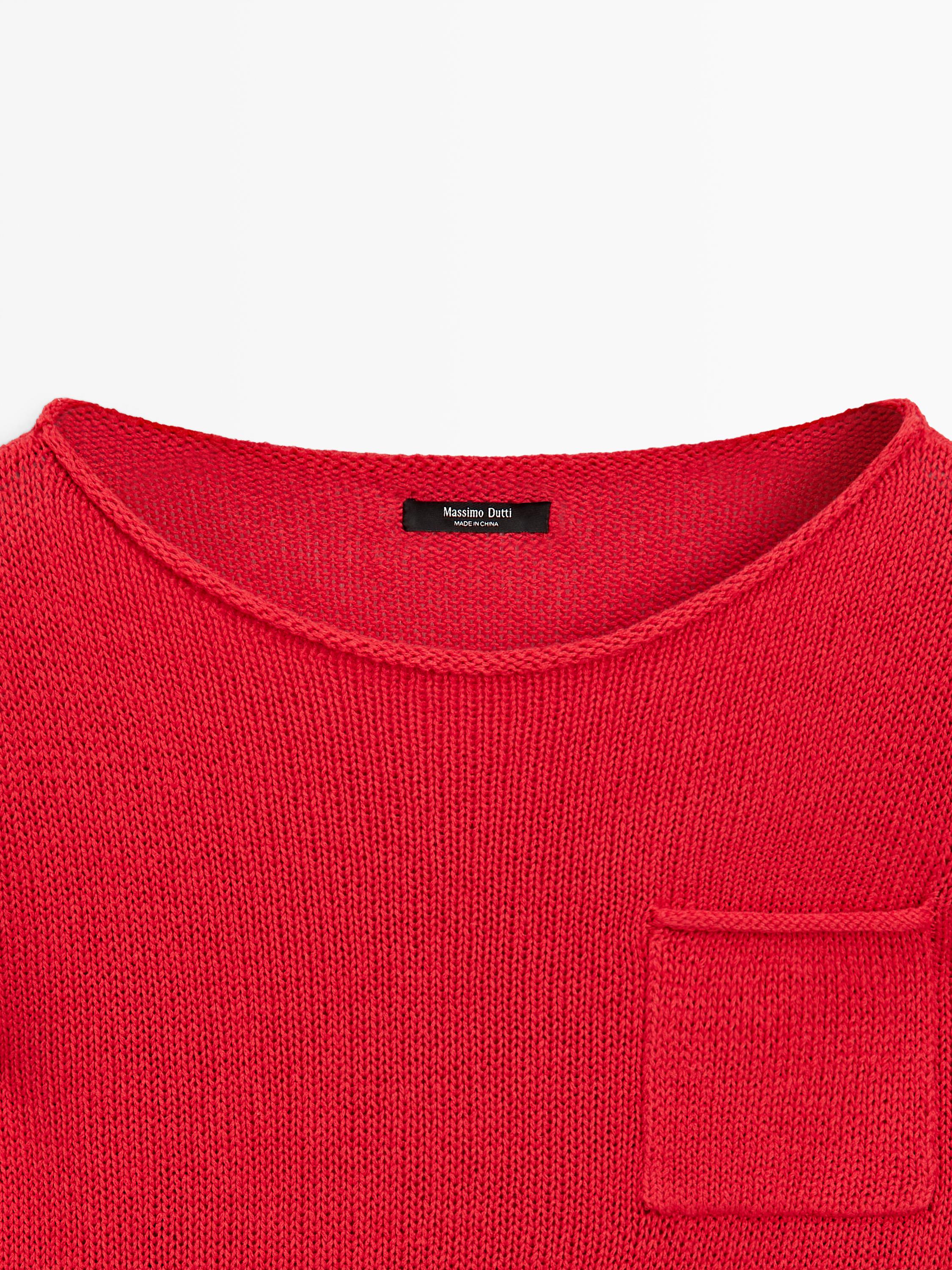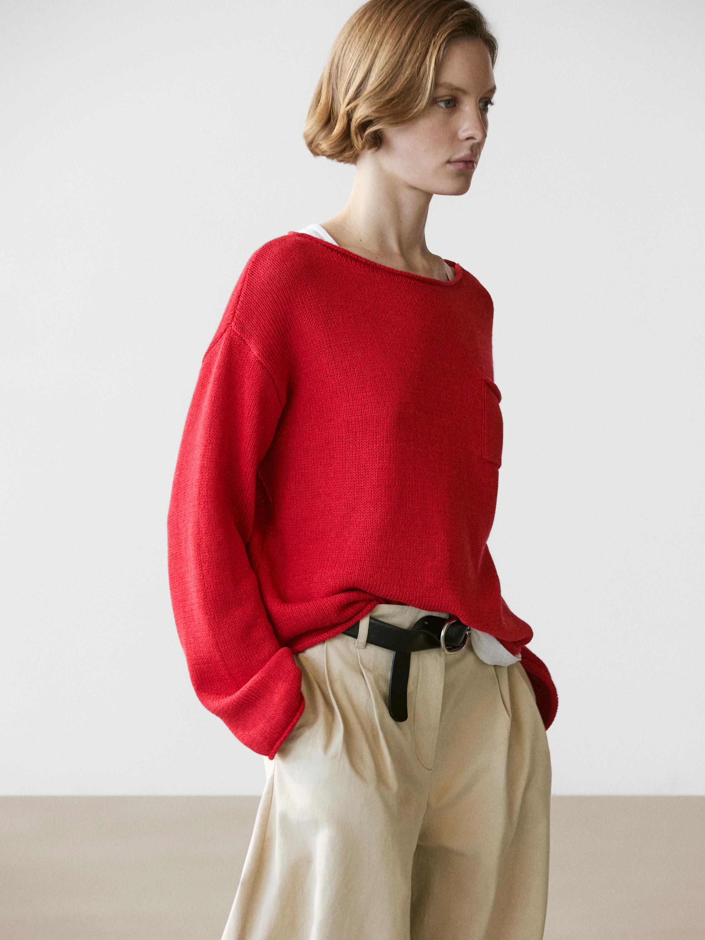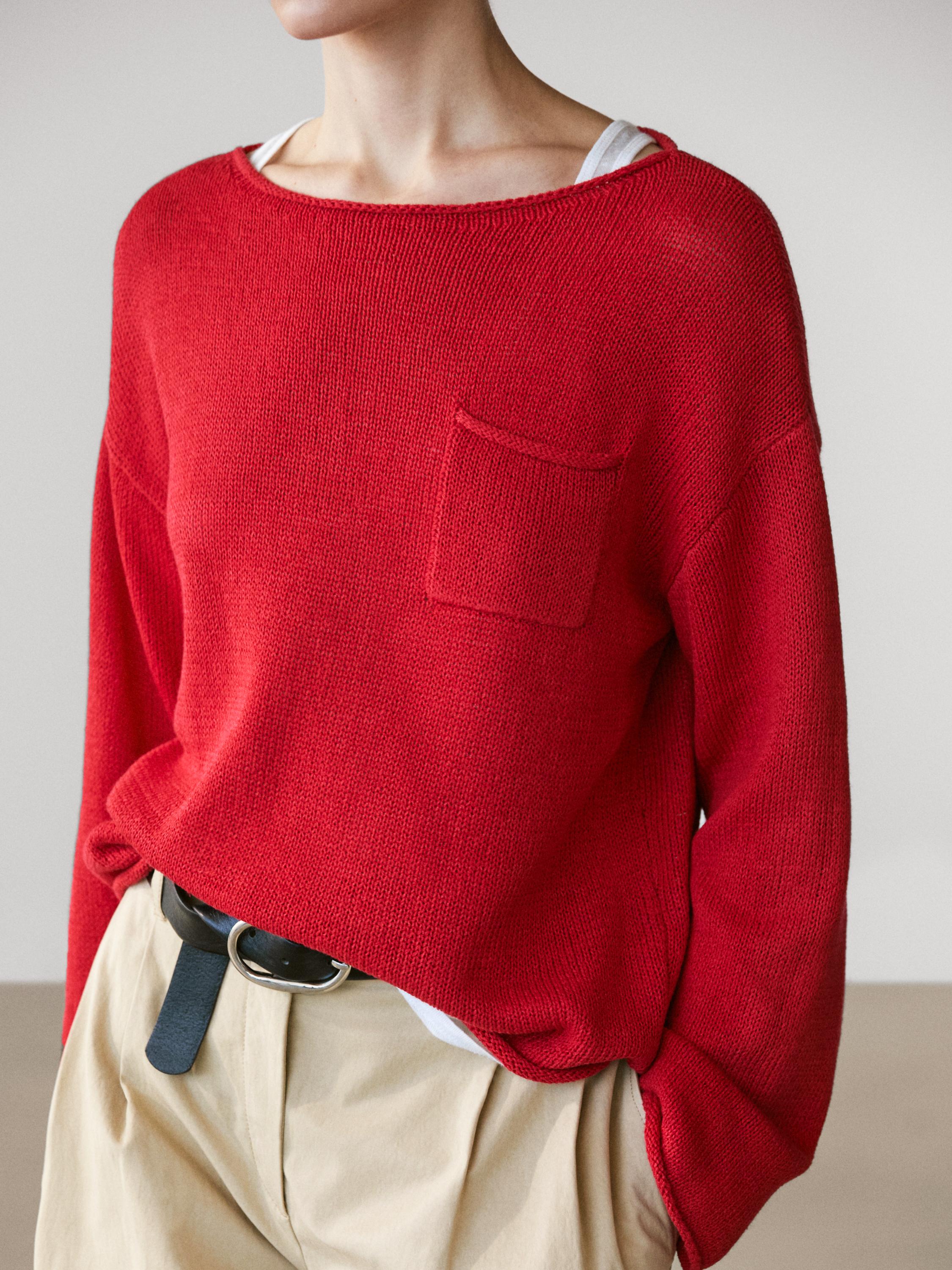 Massimo Dutti Свитер из хлопкового и льняного трикотажа с карманом, красный