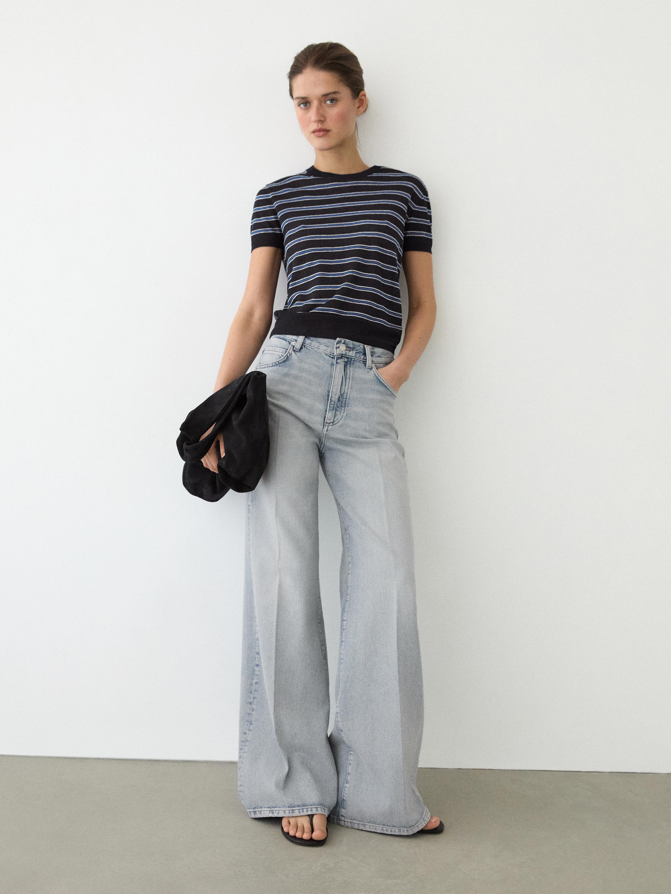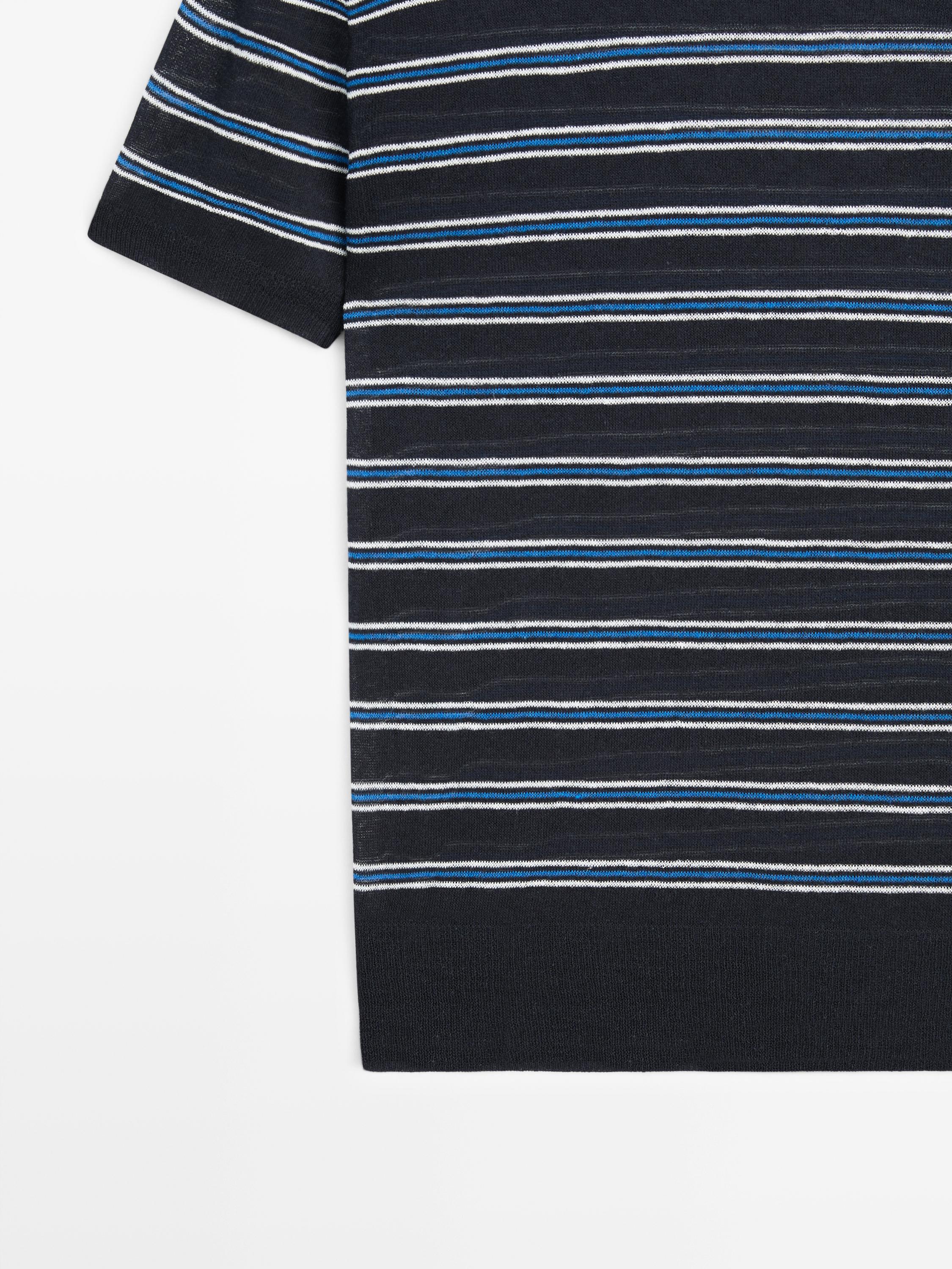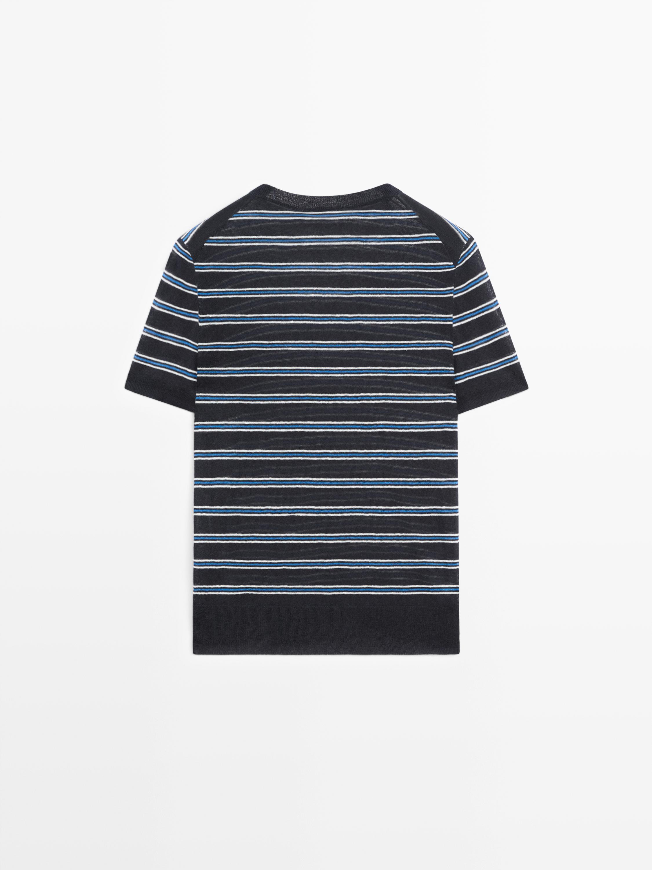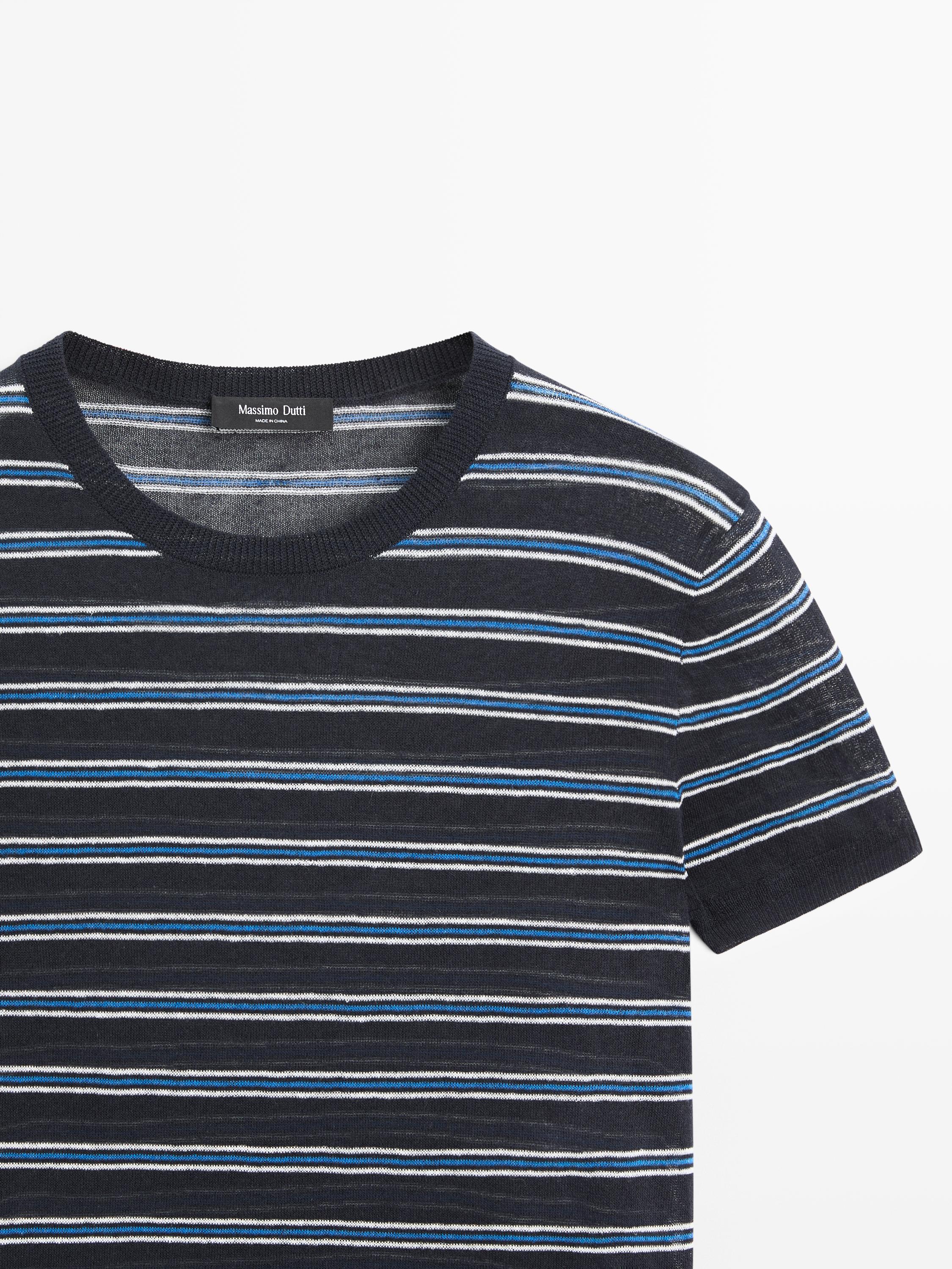 Свитер из смесового хлопка. Круглый вырез. Короткие рукава. Детали в рубчик . Принт в полоску.