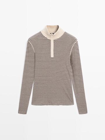 Massimo Dutti Свитер в полоску с застежкой-молнией, бежевый