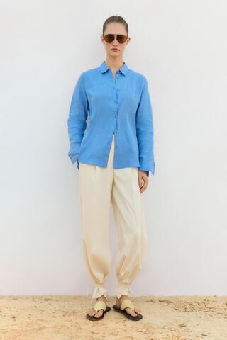 Рубашка из 100% льна. Длинные рукава с манжетами на пуговицах. Рубашечный воротник. Застежка на пуговицы спереди.