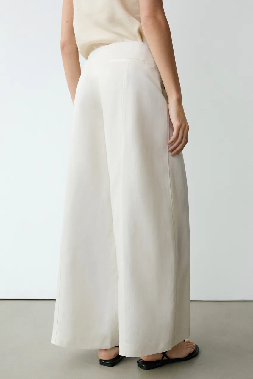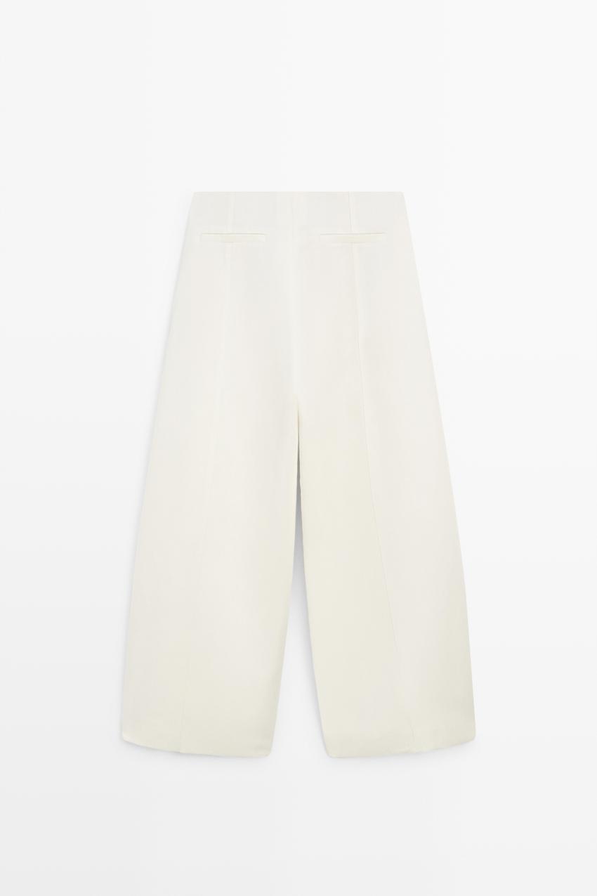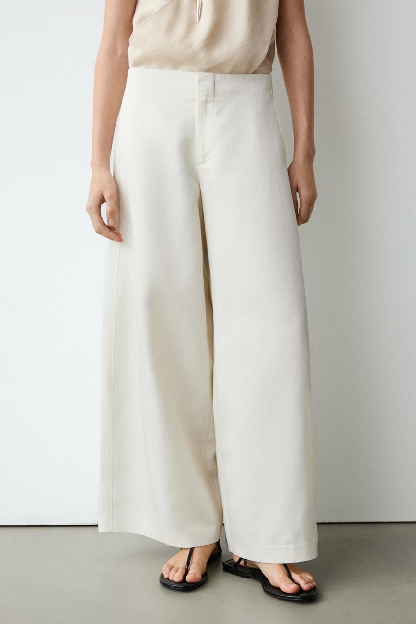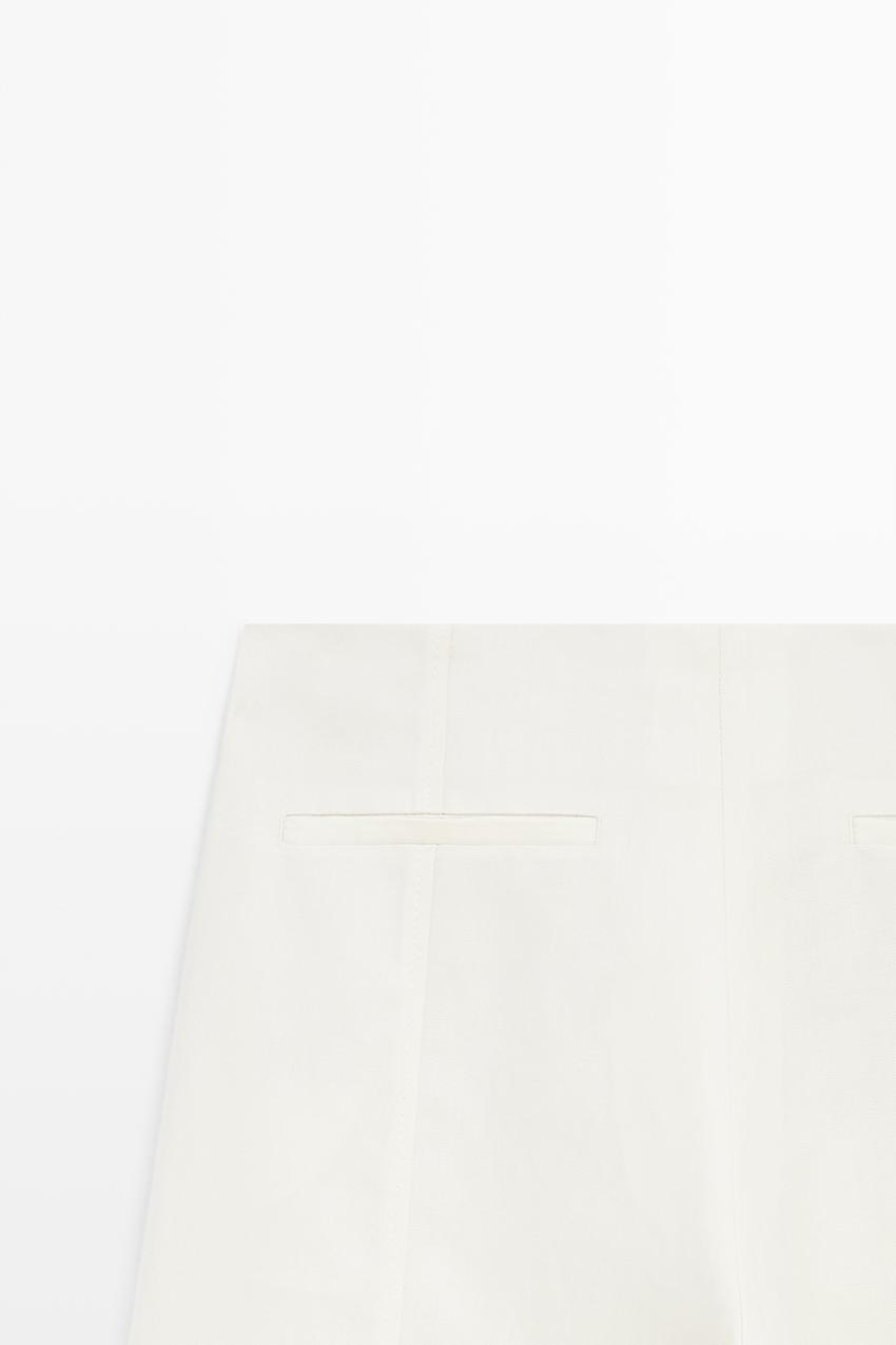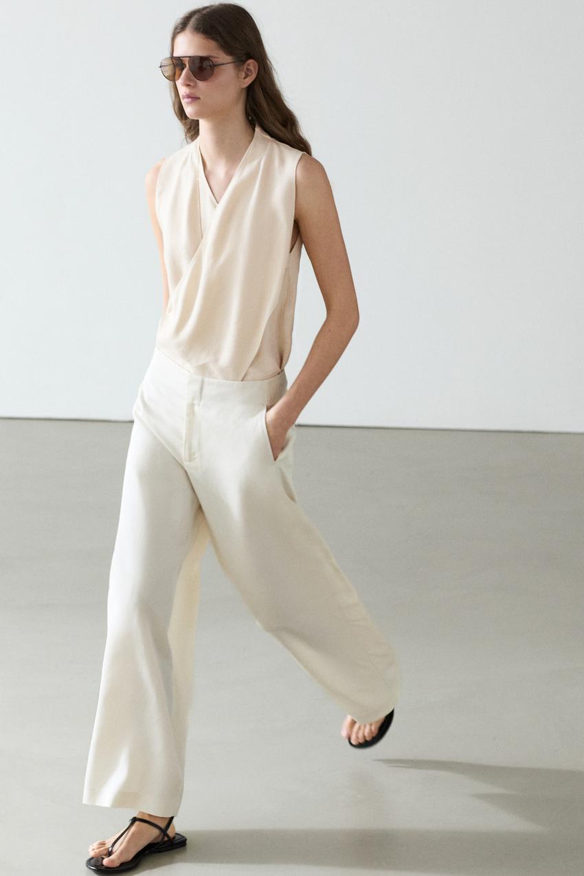 Брюки прямого кроя: этот крой отличается более широкой формой в бедрах и более узкими штанинами к щиколотке, представляя собой промежуточный вариант между облегающим и стандартным кроем. Застежка на молнию и крючок с внутренней пуговицей. Два боковых кармана. Два прорезных кармана сзади. Тонкая, легкая ткань.